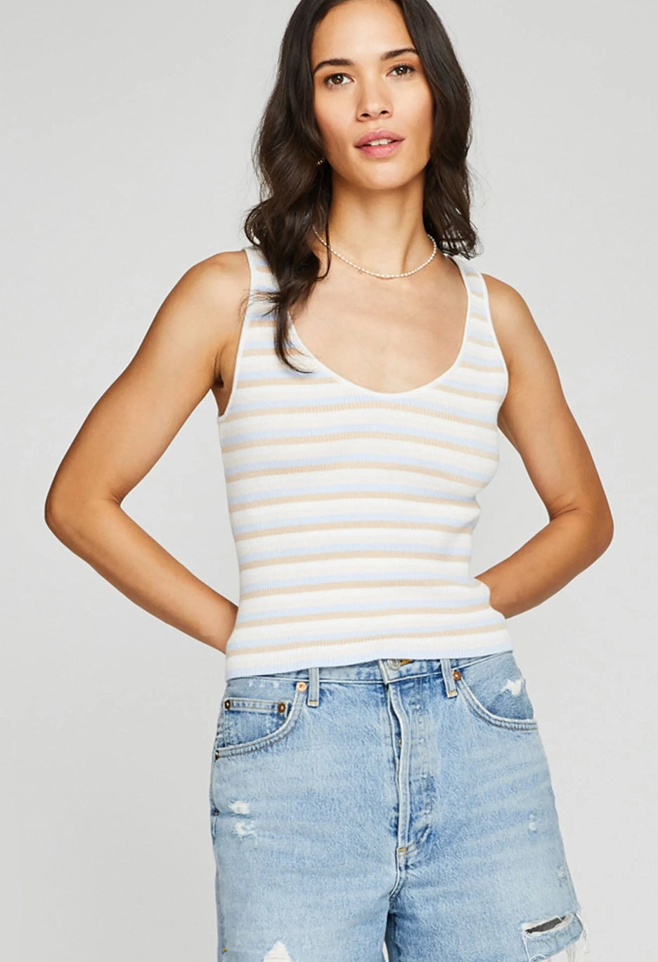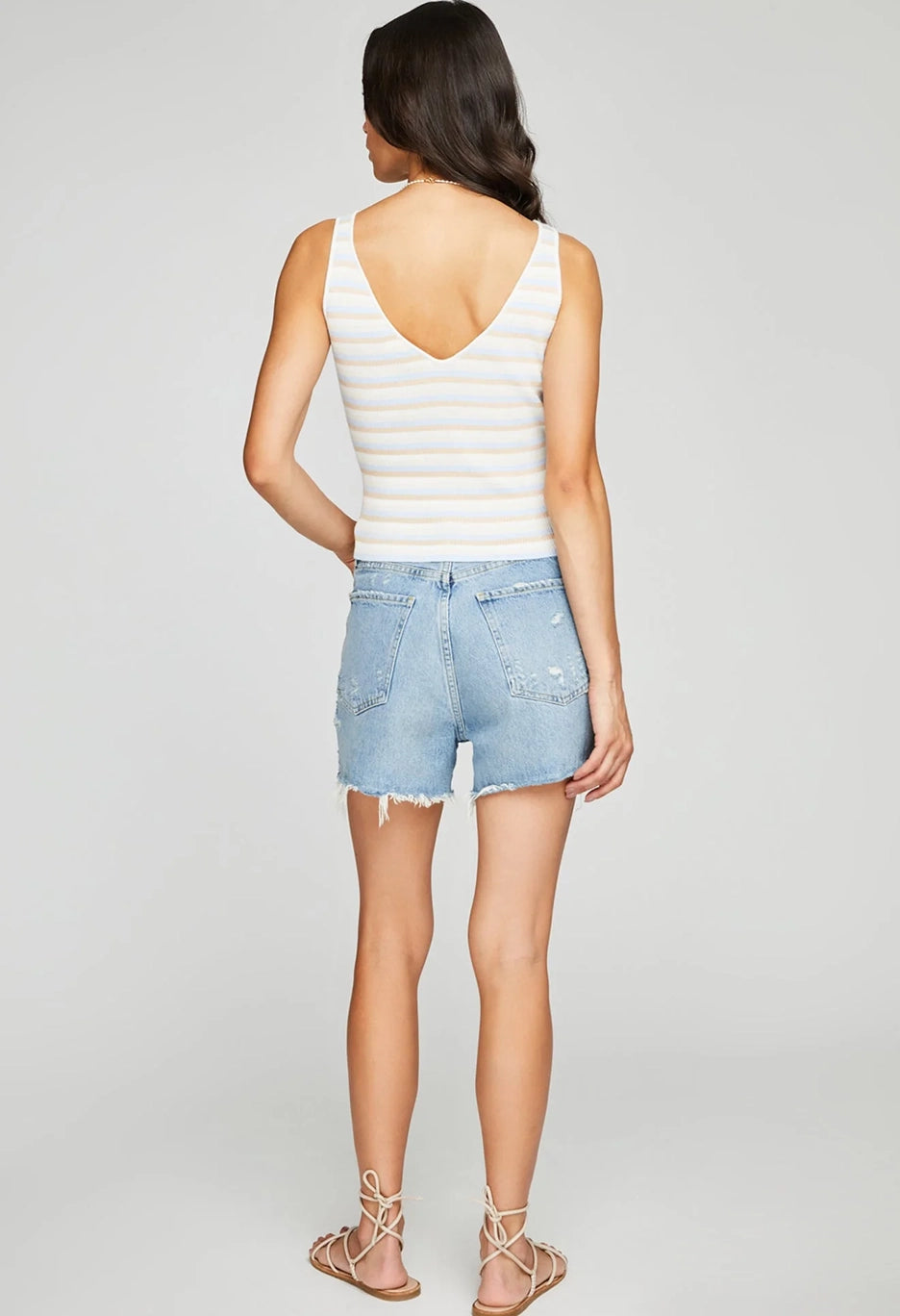 The Delia tank is made of a soft yarn in a rib knit pattern. Features include a front and back v-neckline for an effortlessly feminine look.