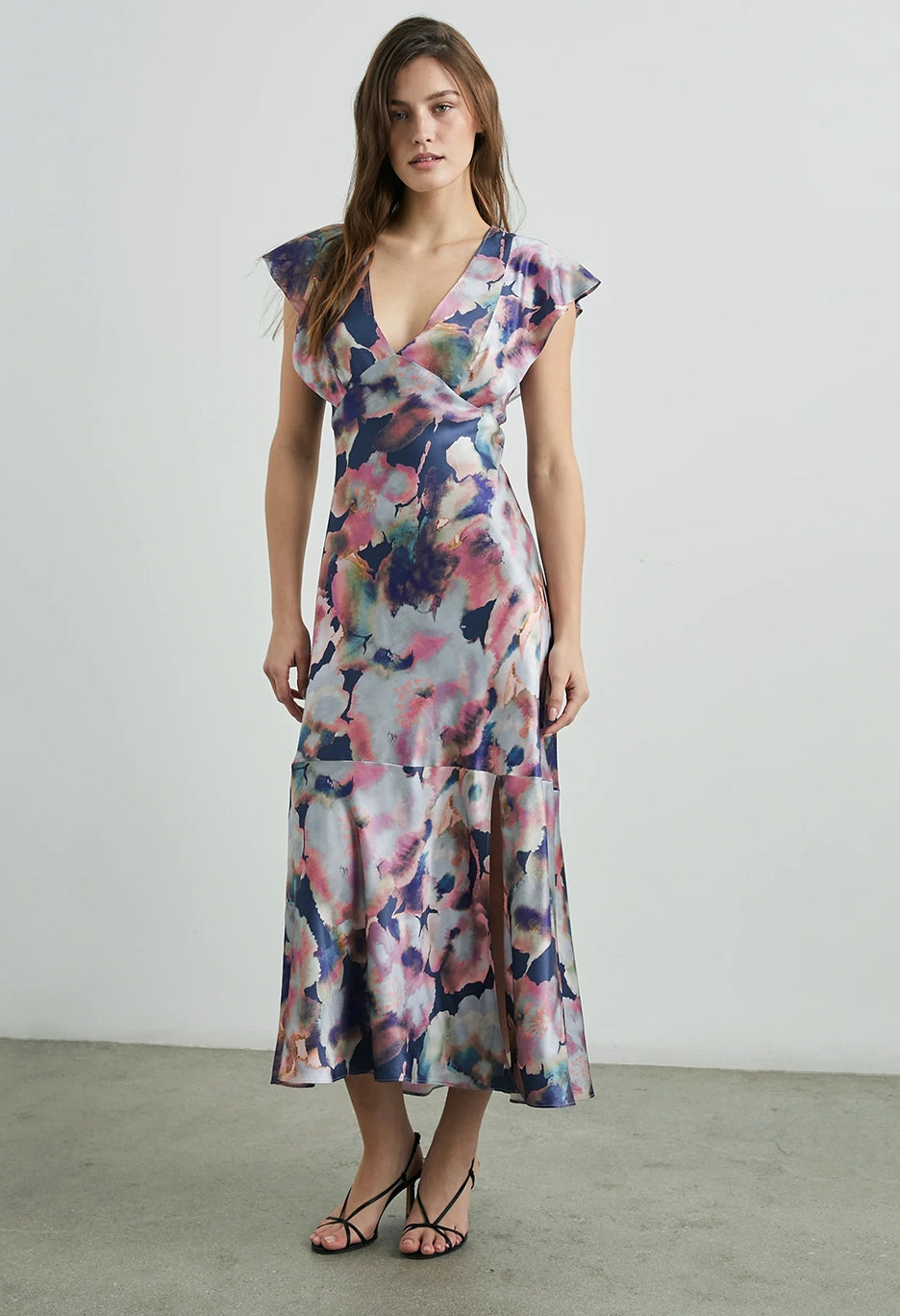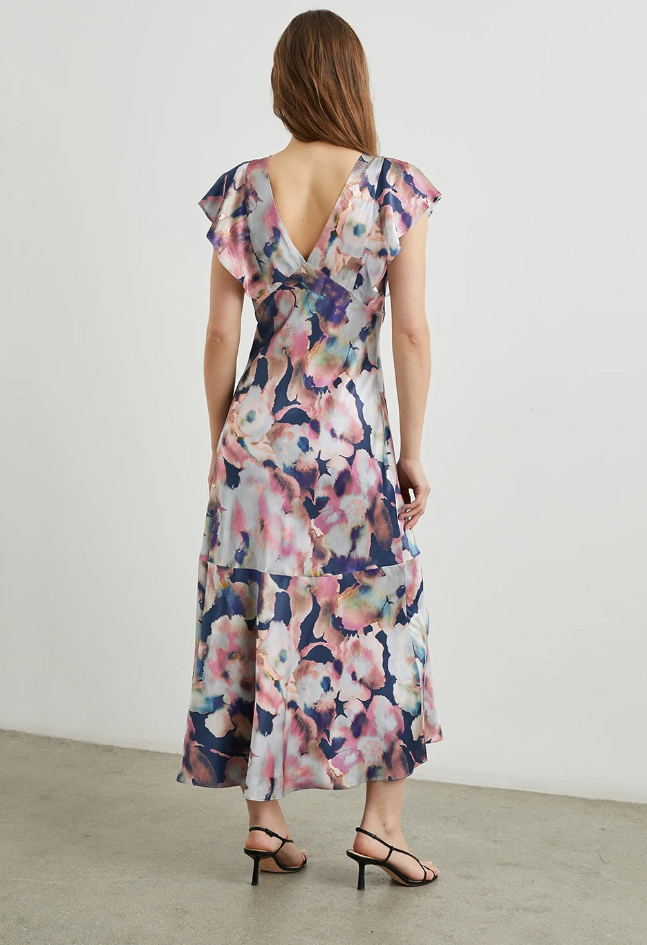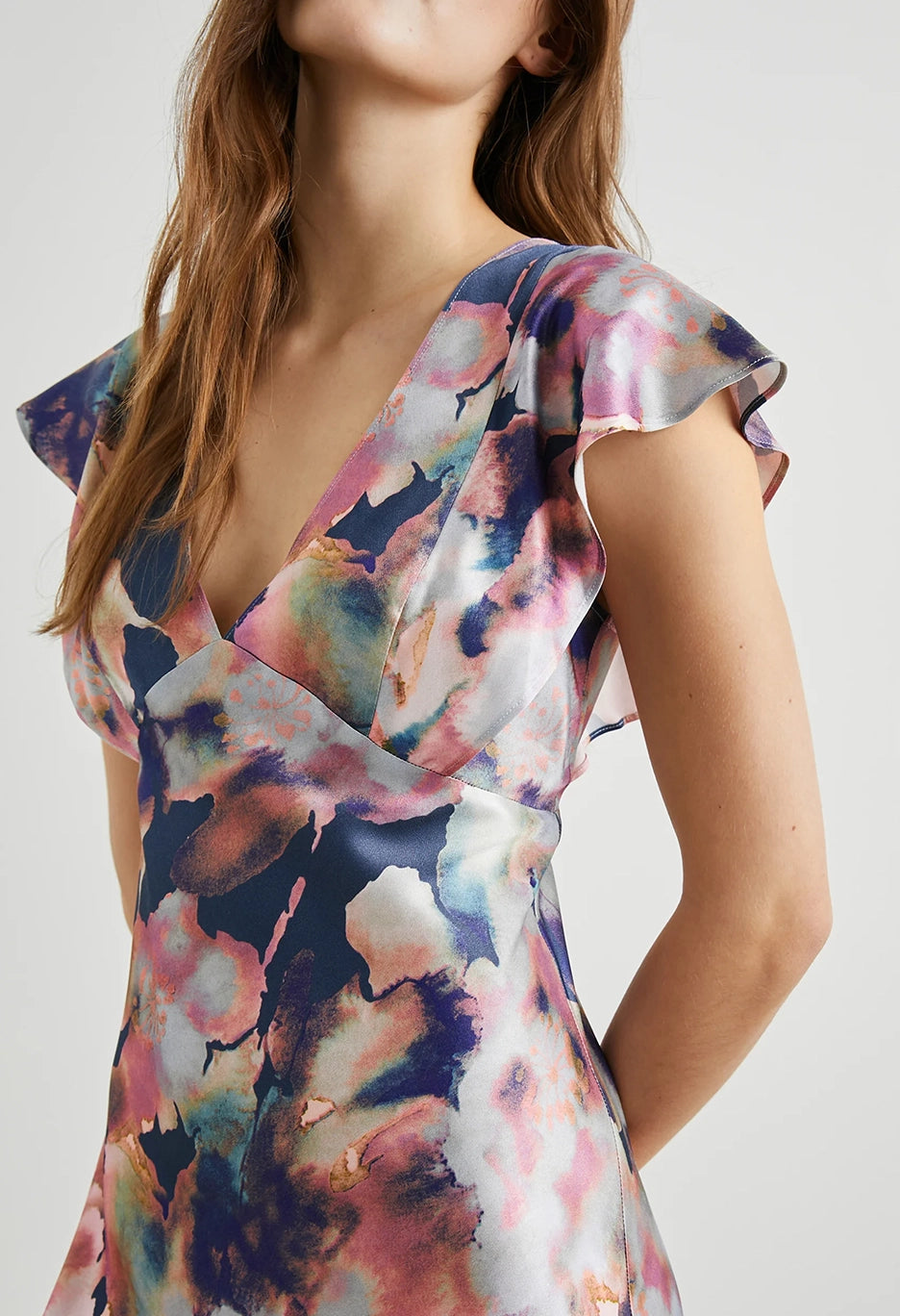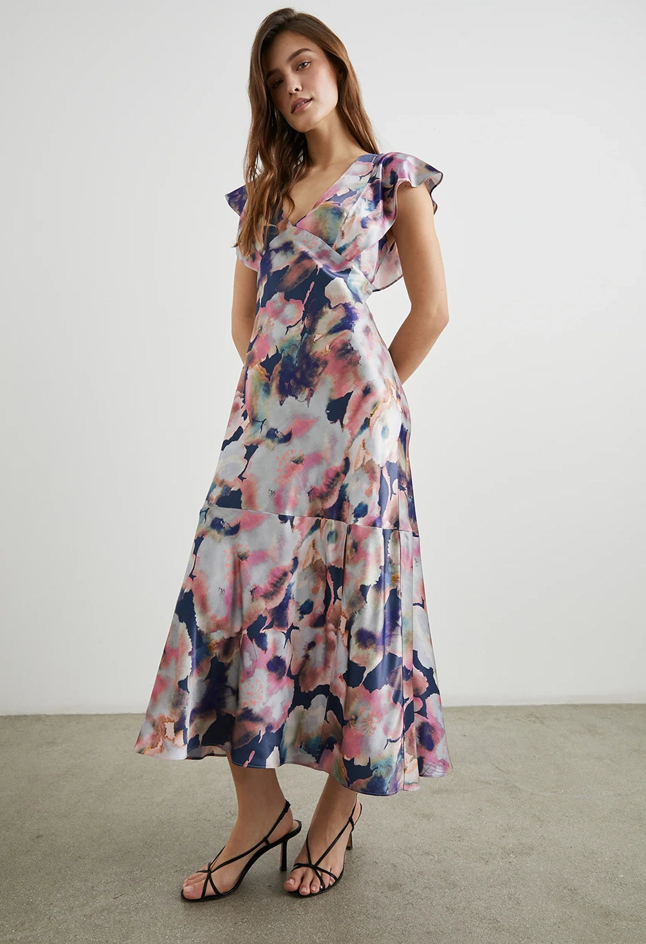 The Dina is here to be your new favorite floral. With a deep v-neckline and feminine flutter sleeves, this satin crepe style is an infinitely flattering take on the midi-dress. The Dina is finished with a subtle sheen and adapts easily to any occasion.