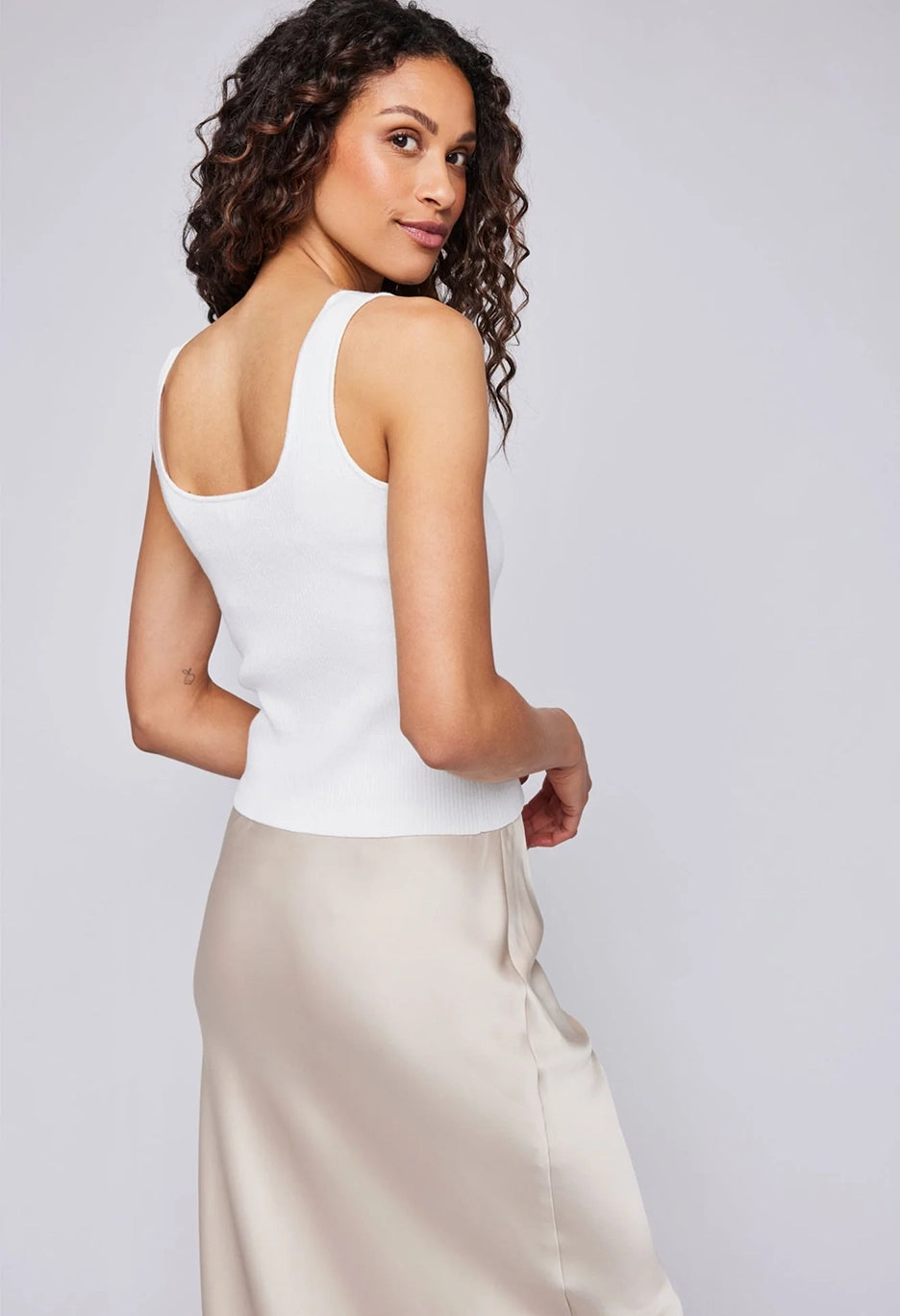 The Dorothy tank is made of a soft yarn in a rib knit pattern. The soft square neckline is perfect for everyday wear or dressed up for date night.
