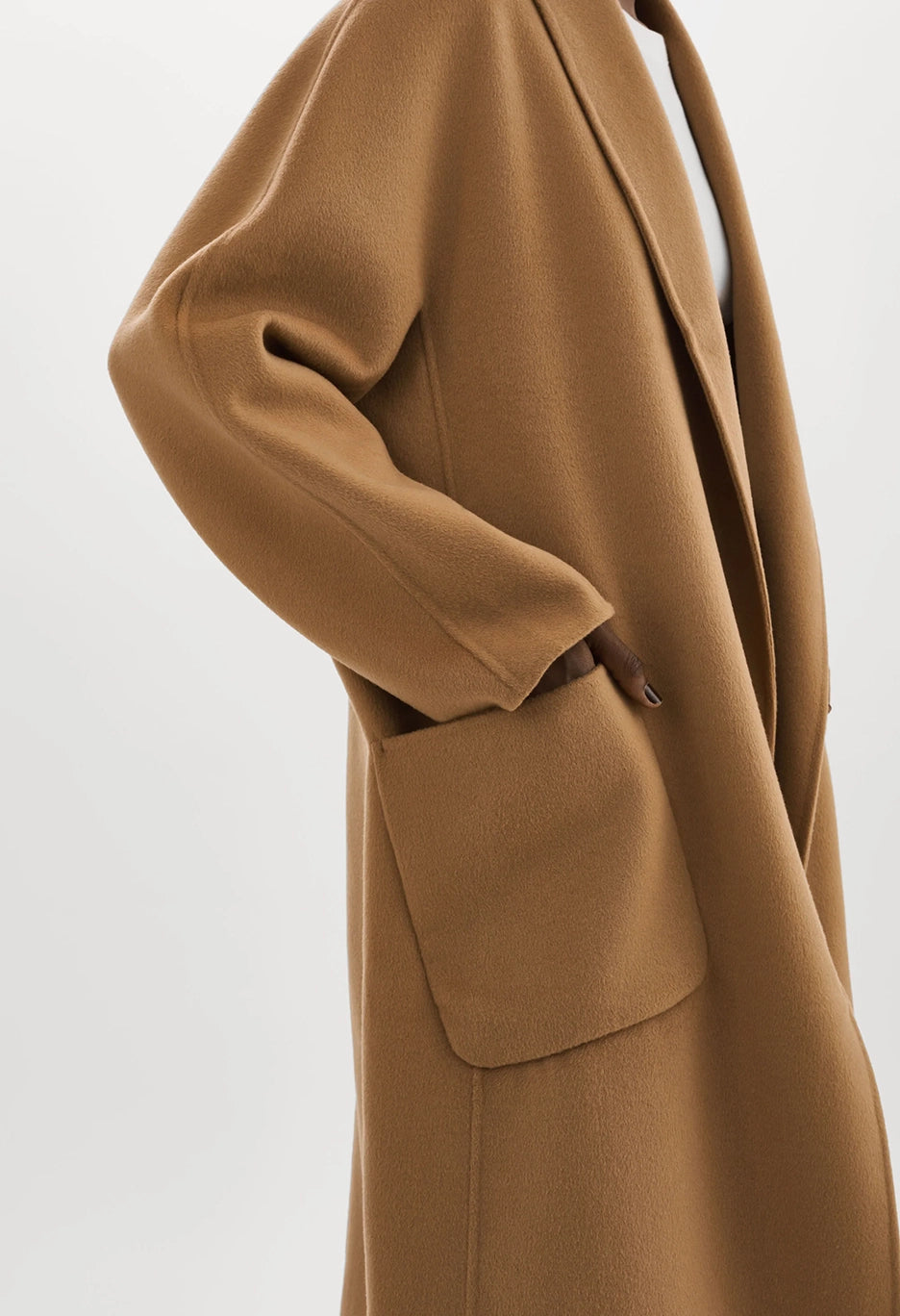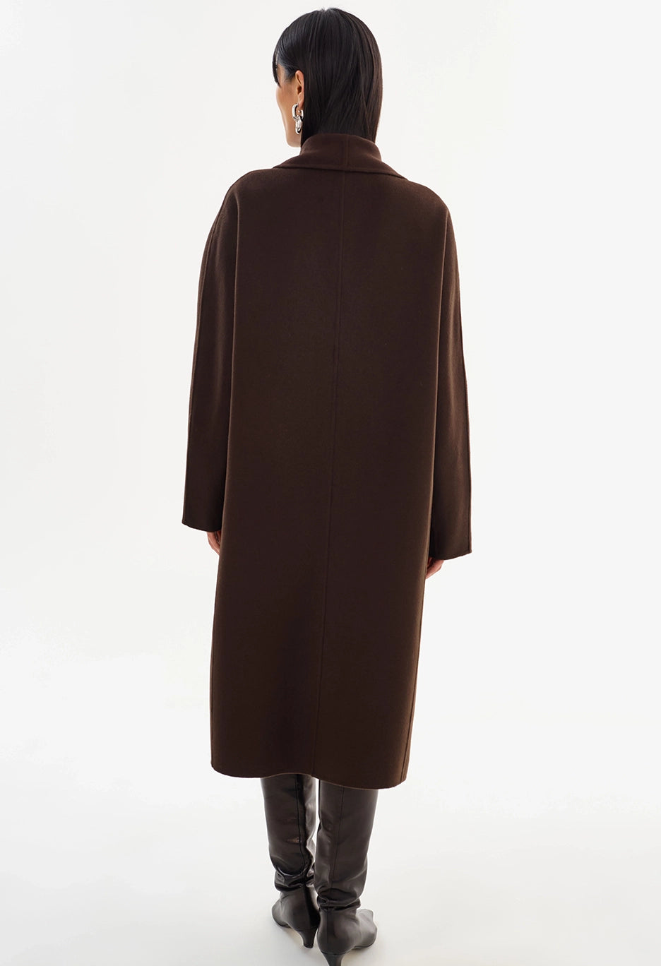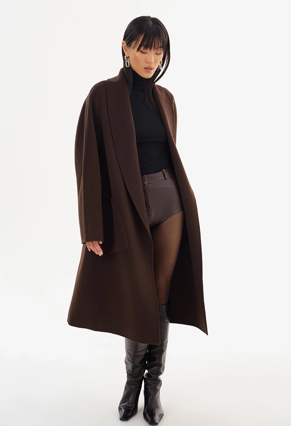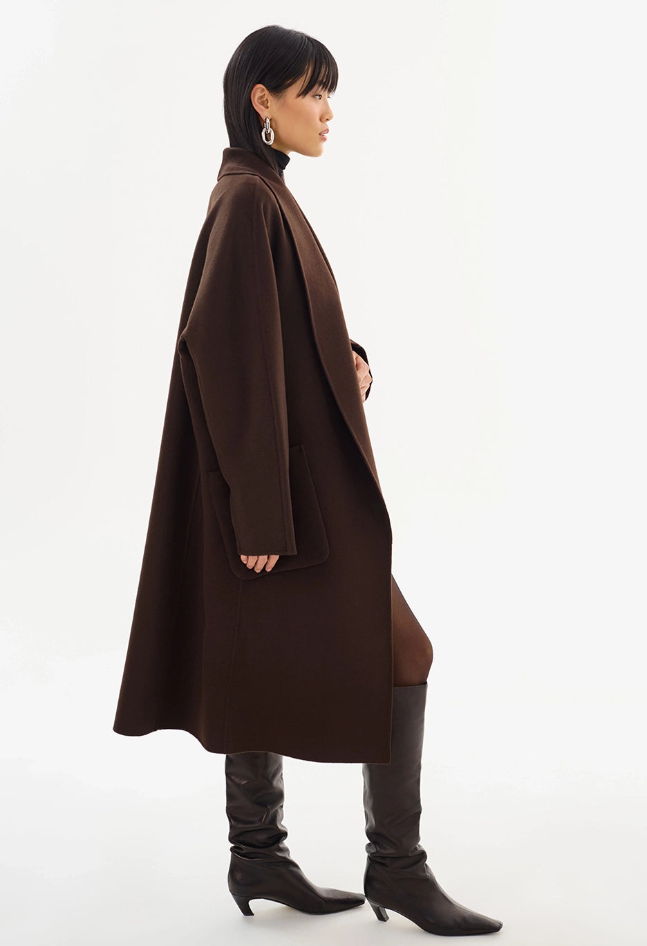 The Thara Double Face Wool Coat is a must-have for the cold weather season. With its shawl collar and oversized sleeves, it exudes both elegance and coziness. Made with double-faced wool, this coat is not only functional but also incredibly warm. Adding practicality to style, it also features patch pockets for convenience.