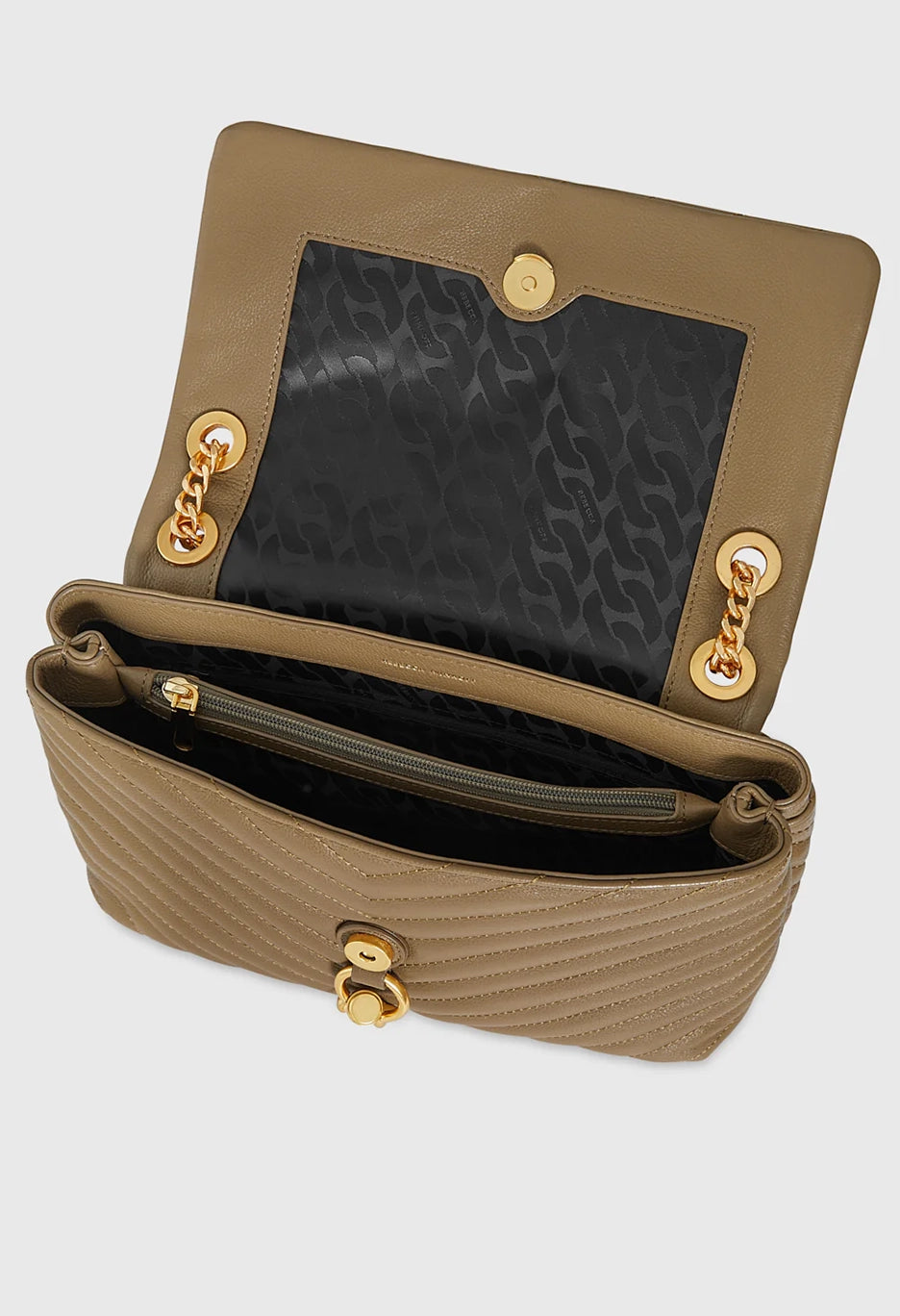The Edie Flap Shoulder Bag, crafted of premium leather and finished with antique brass hardware, makes the perfect everyday companion. This versatile bag features a pull-through chain shoulder strap for multiple carrying options, and a back exterior pocket perfect for slipping your phone