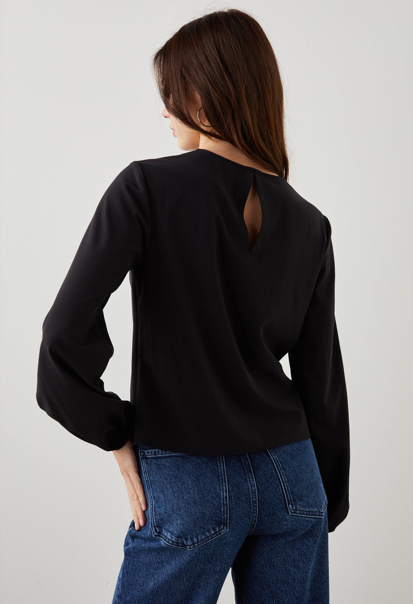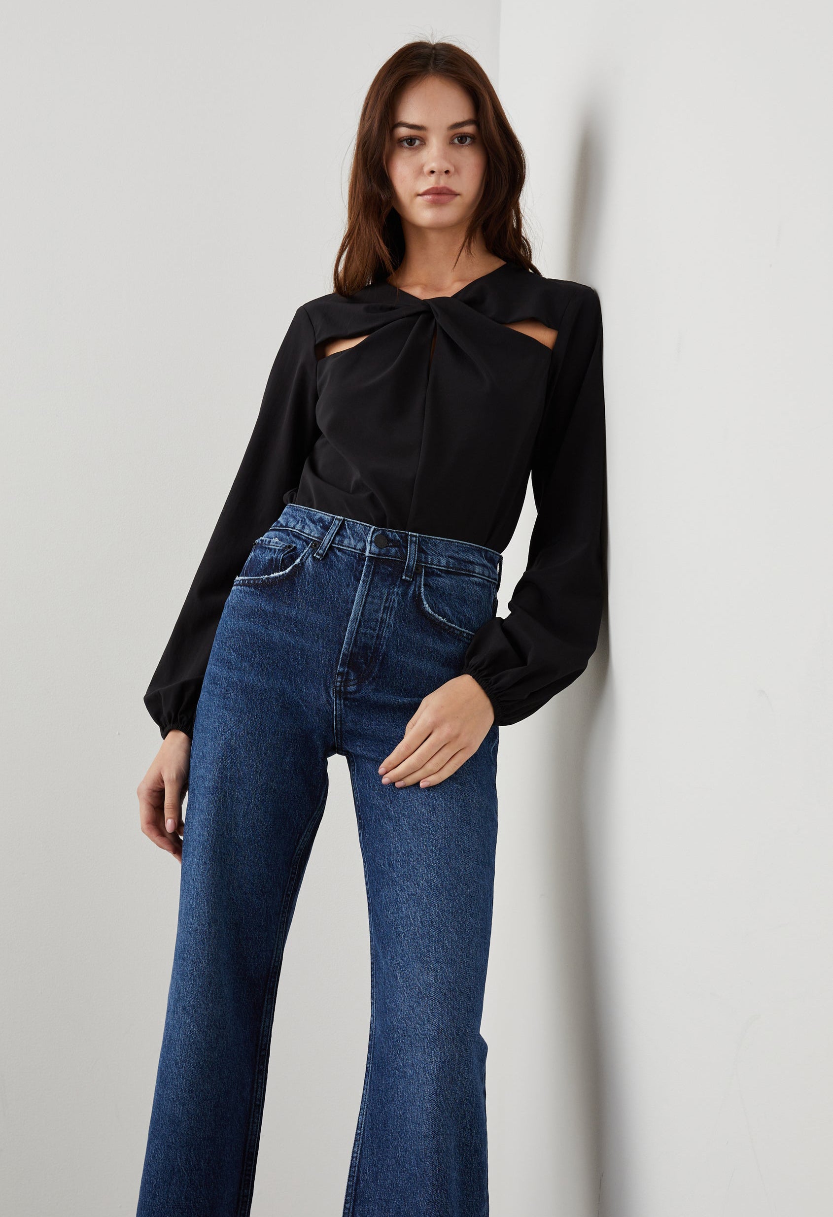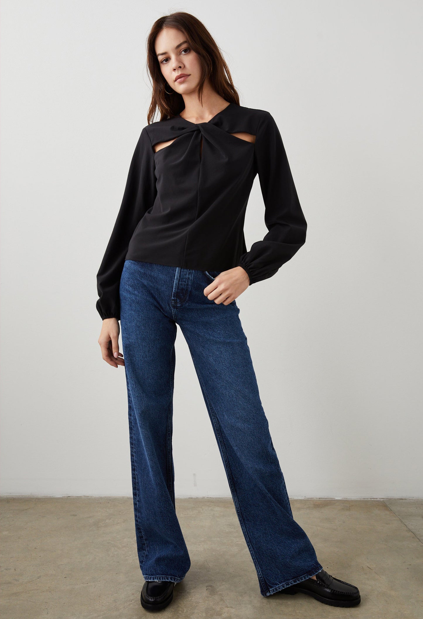 The staple black top, elevated. Made from stretchy nylon crepe, this style is just as comfortable as it is stylish. With long ruched sleeves and a cutout twist detail at the chest, this style takes any simple look to a whole new level of chic.