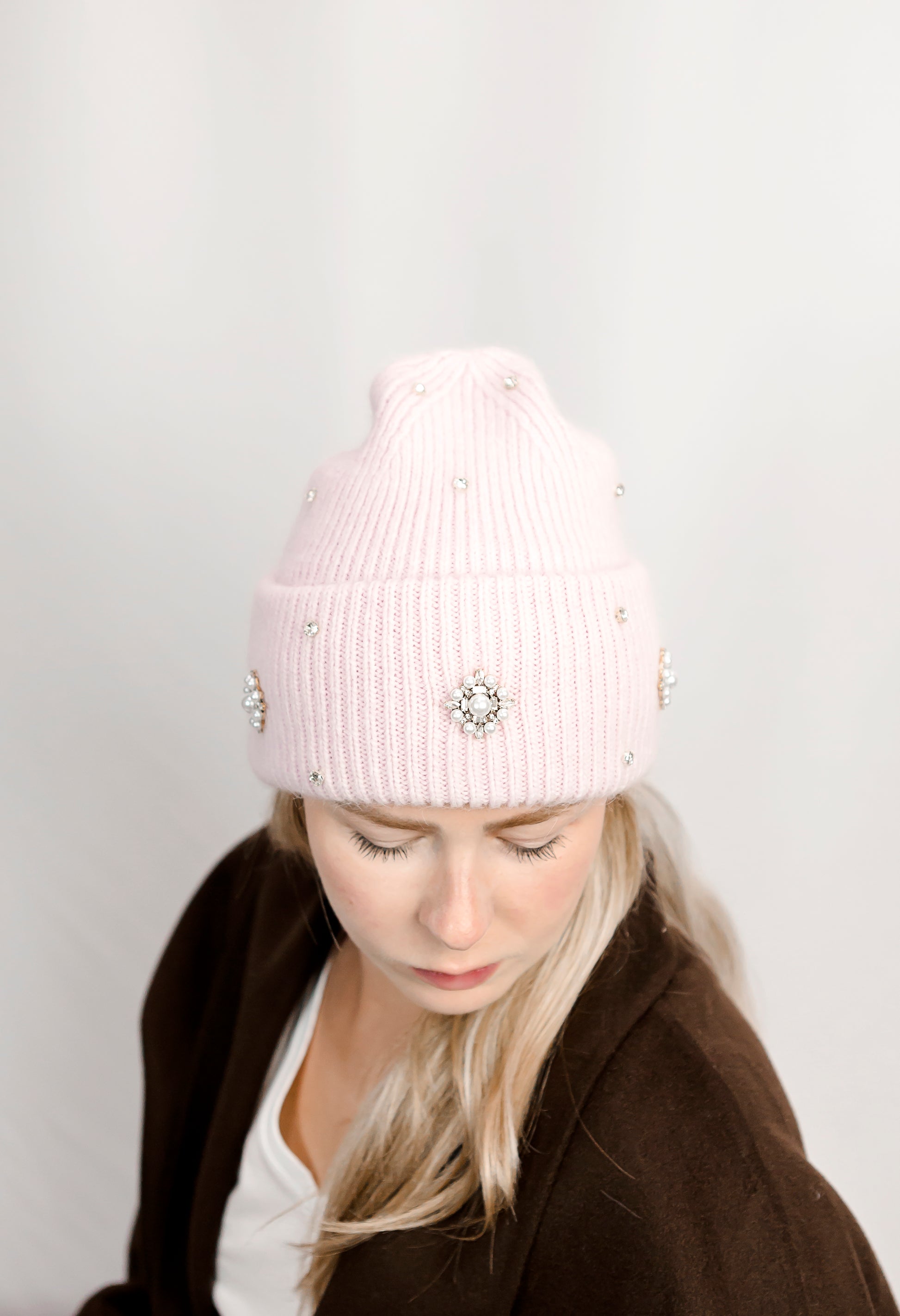 This pink toque features a soft knitted construction for warmth and comfort. A stylish turn-up brim adds structure, while crystal embellishments provide a subtle touch of elegance, making it a practical yet refined choice for chilly days.