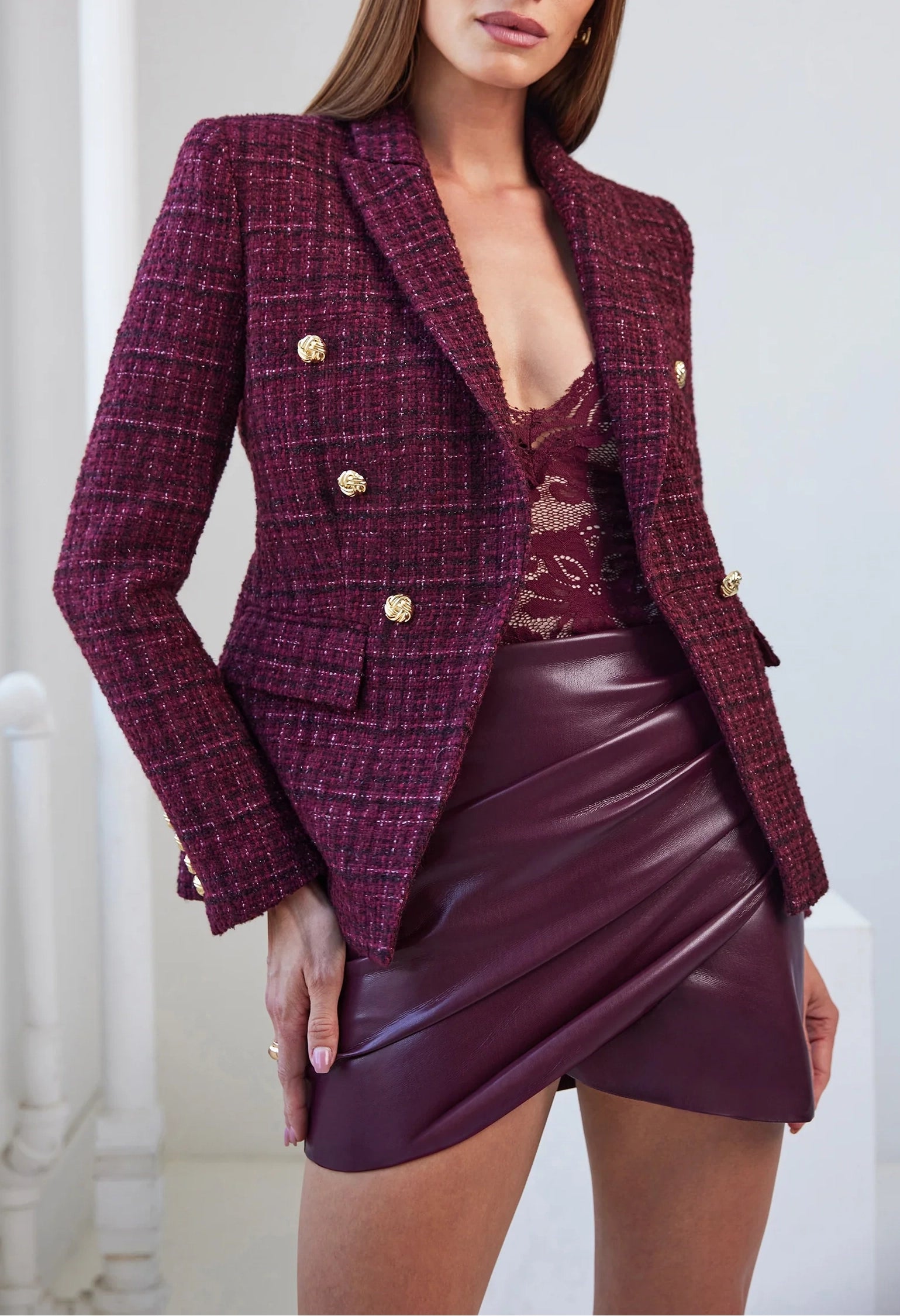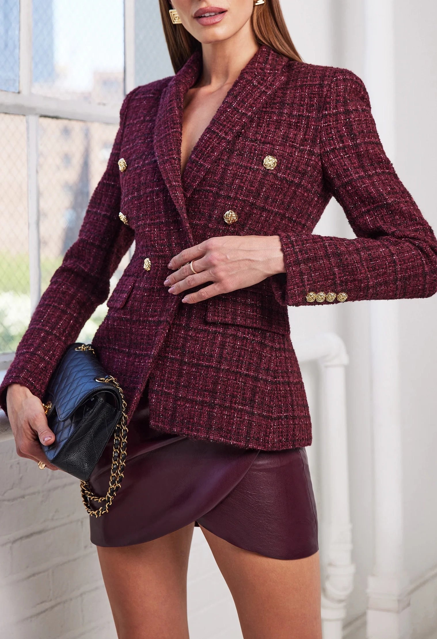 The Emilio Tweed Blazer exudes refined elegance with its structured design. This double-breasted piece features a luxurious Lurex-blended tweed in a deep Malbec plaid, accented by gold buttons and flap pockets. Sculpted at the waist to enhance a feminine shape, it complements the coordinating Kendra Skirt or Quinn Vestier for a polished, cohesive look