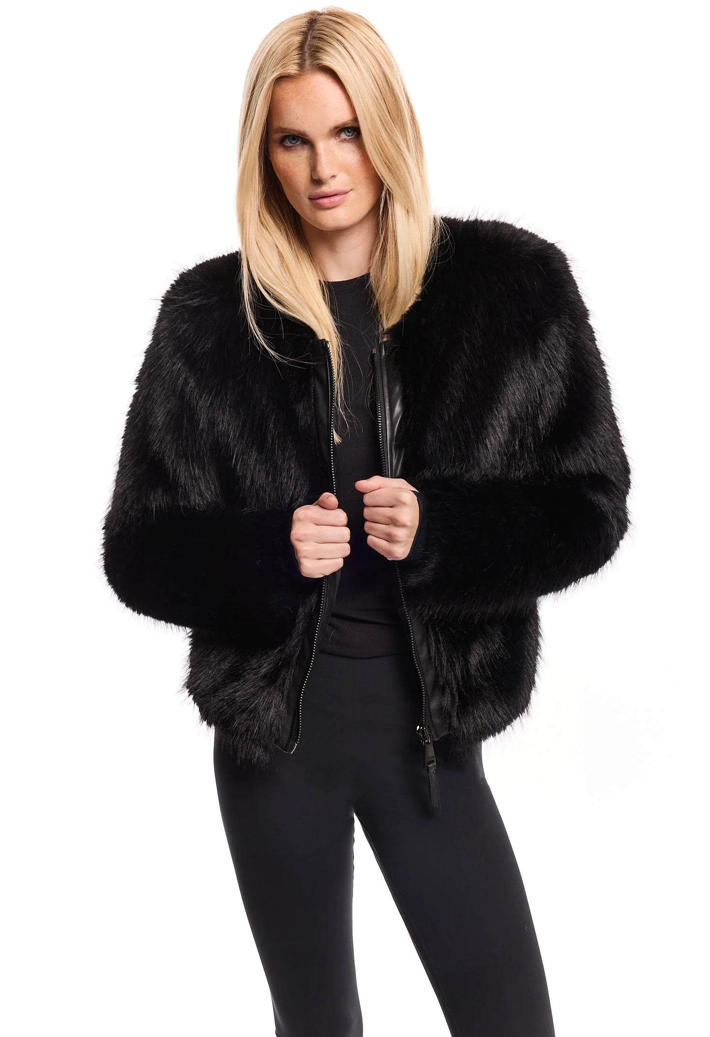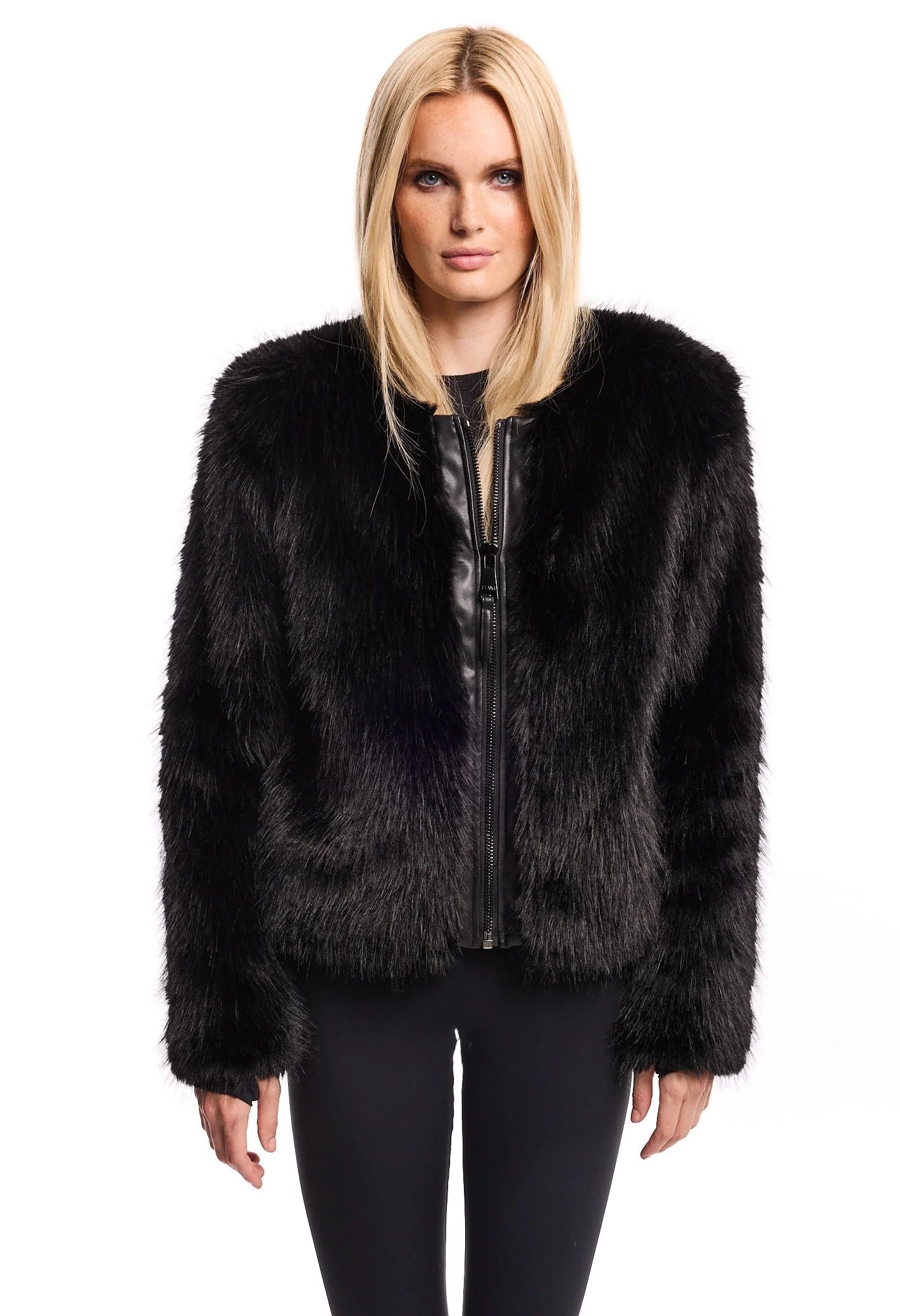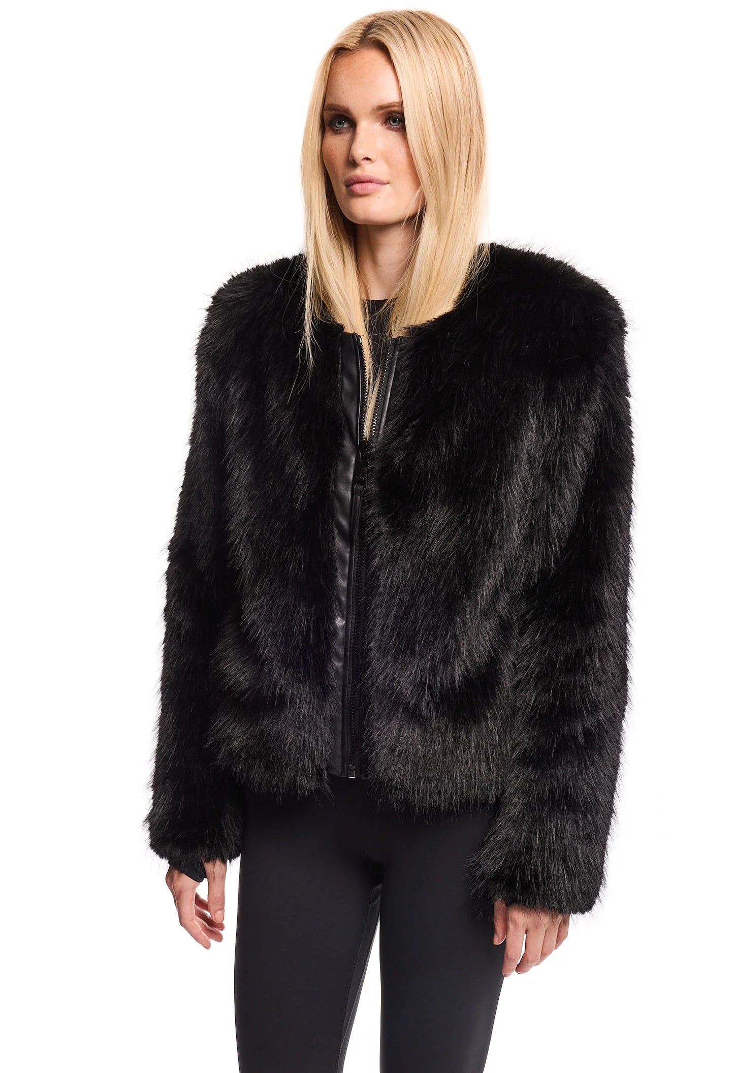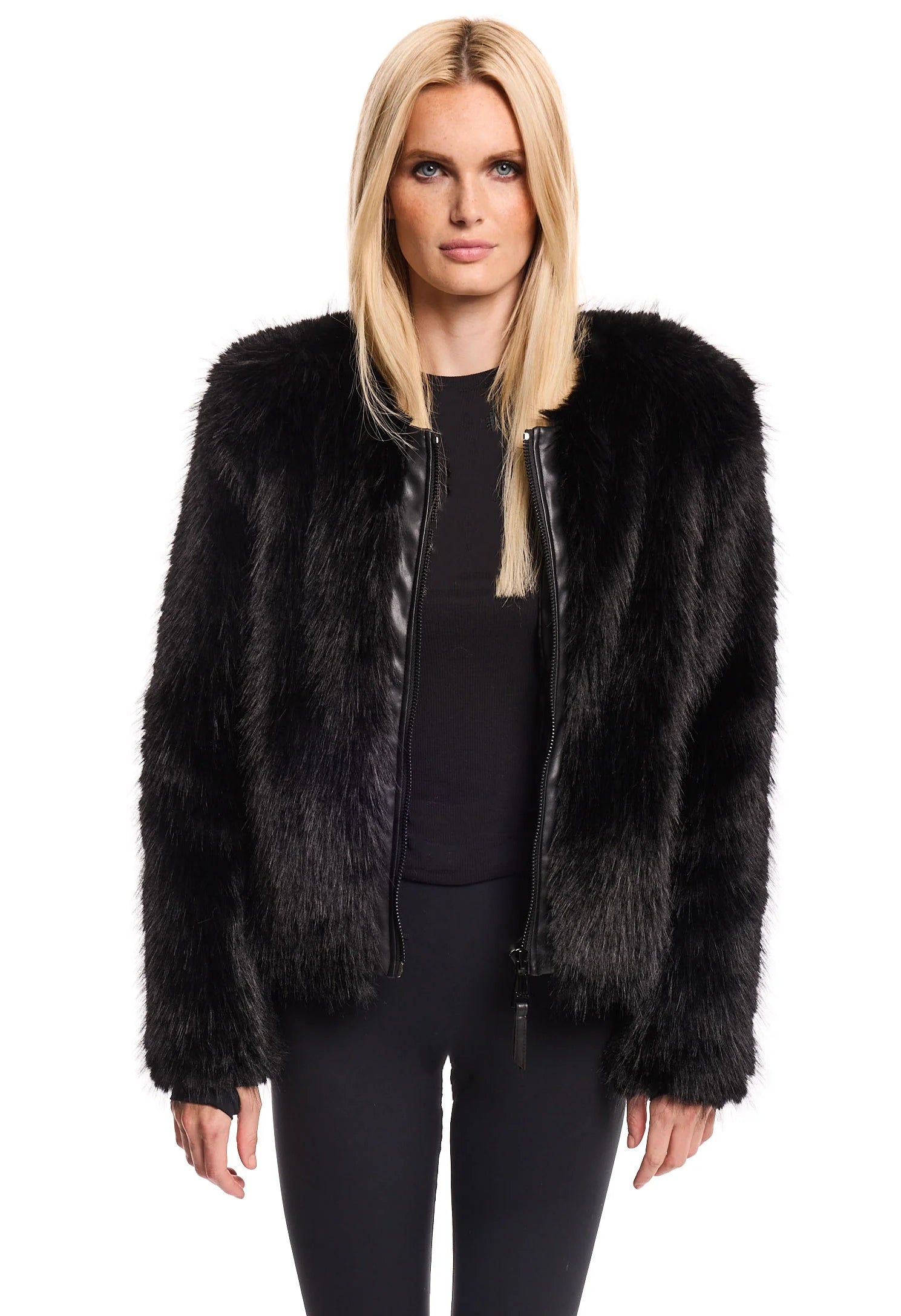 Elevate your winter collection with this sophisticated faux fur jacket. The minimalist design, coupled with the soft faux fur texture, exudes a modern and refined aesthetic. Its versatile color allows it to transition seamlessly from day to night, while the subtle leather details and spandex thumbhole cuffs add a touch of urban flair. Whether paired with jeans or worn over a dress, this jacket provides both warmth and style.