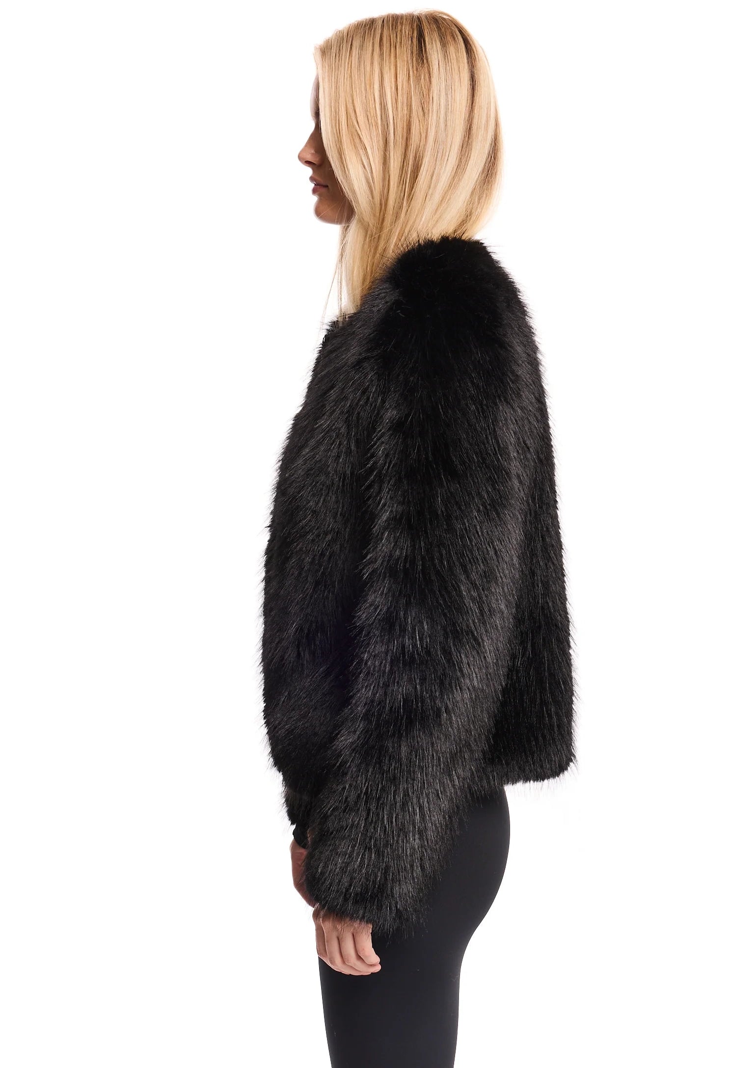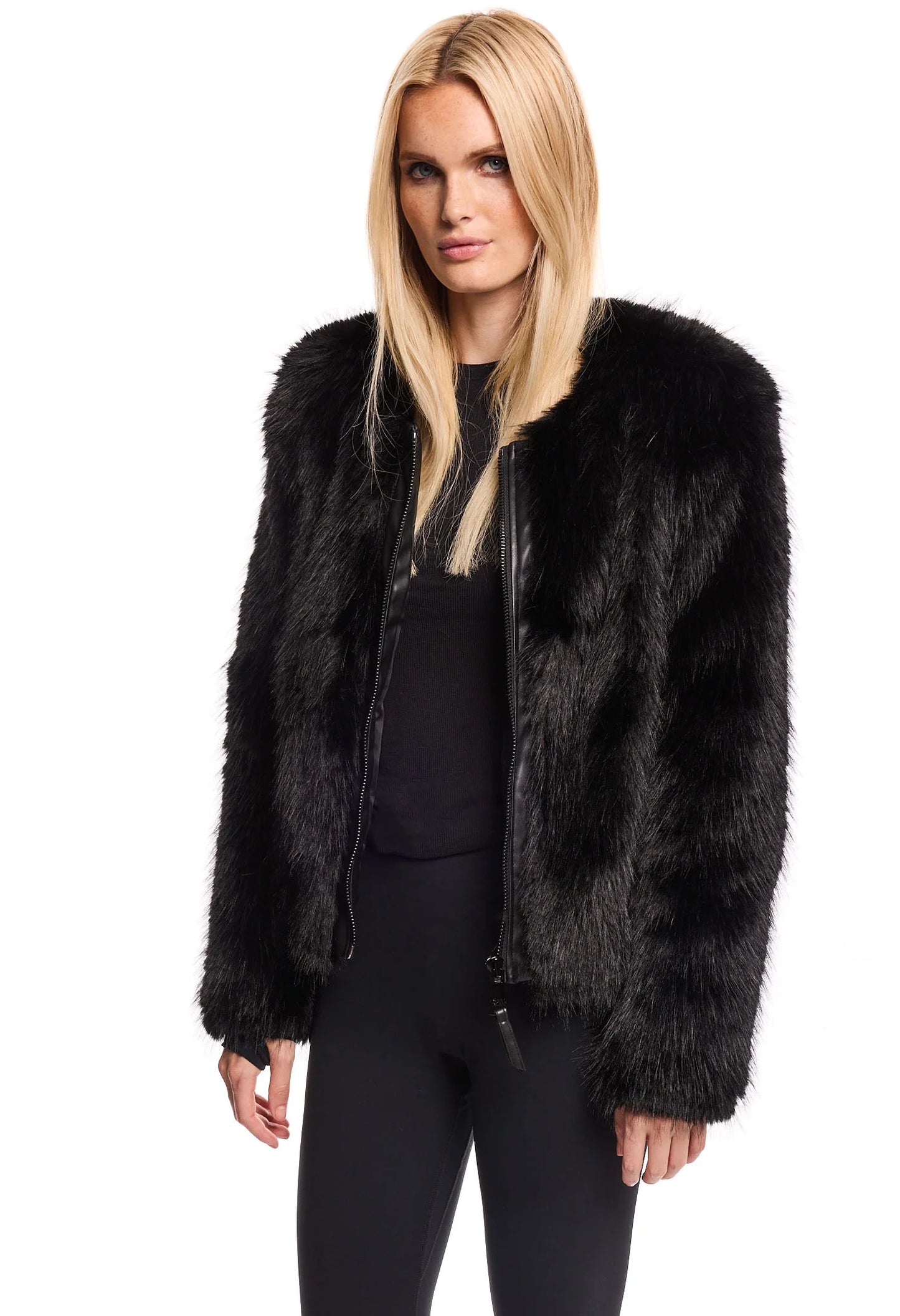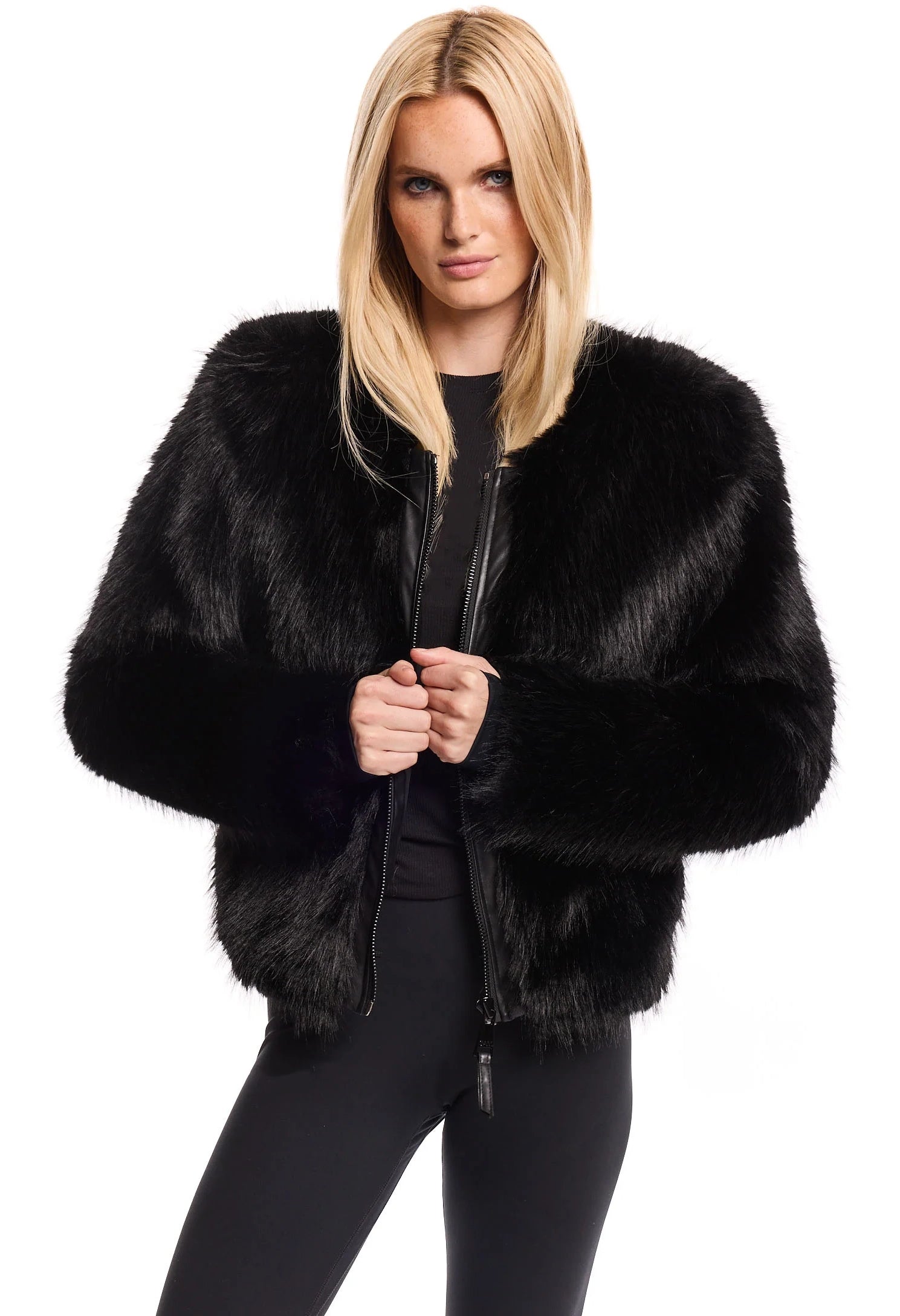 Elevate your winter collection with this sophisticated faux fur jacket. The minimalist design, coupled with the soft faux fur texture, exudes a modern and refined aesthetic. Its versatile color allows it to transition seamlessly from day to night, while the subtle leather details and spandex thumbhole cuffs add a touch of urban flair. Whether paired with jeans or worn over a dress, this jacket provides both warmth and style.