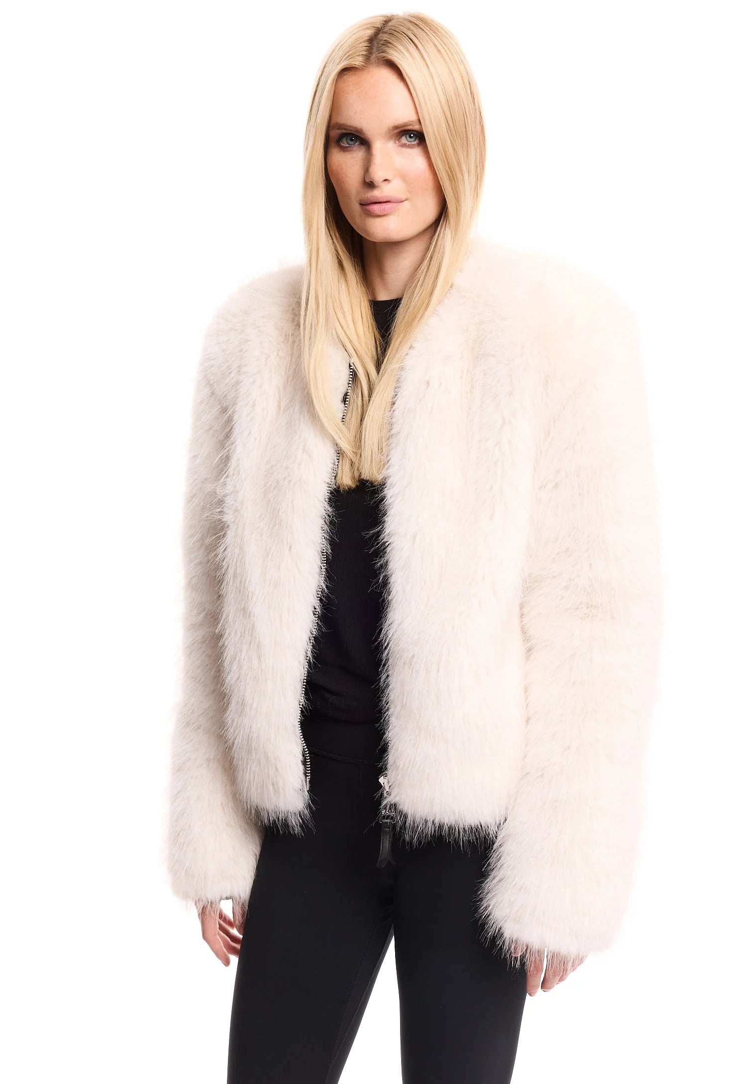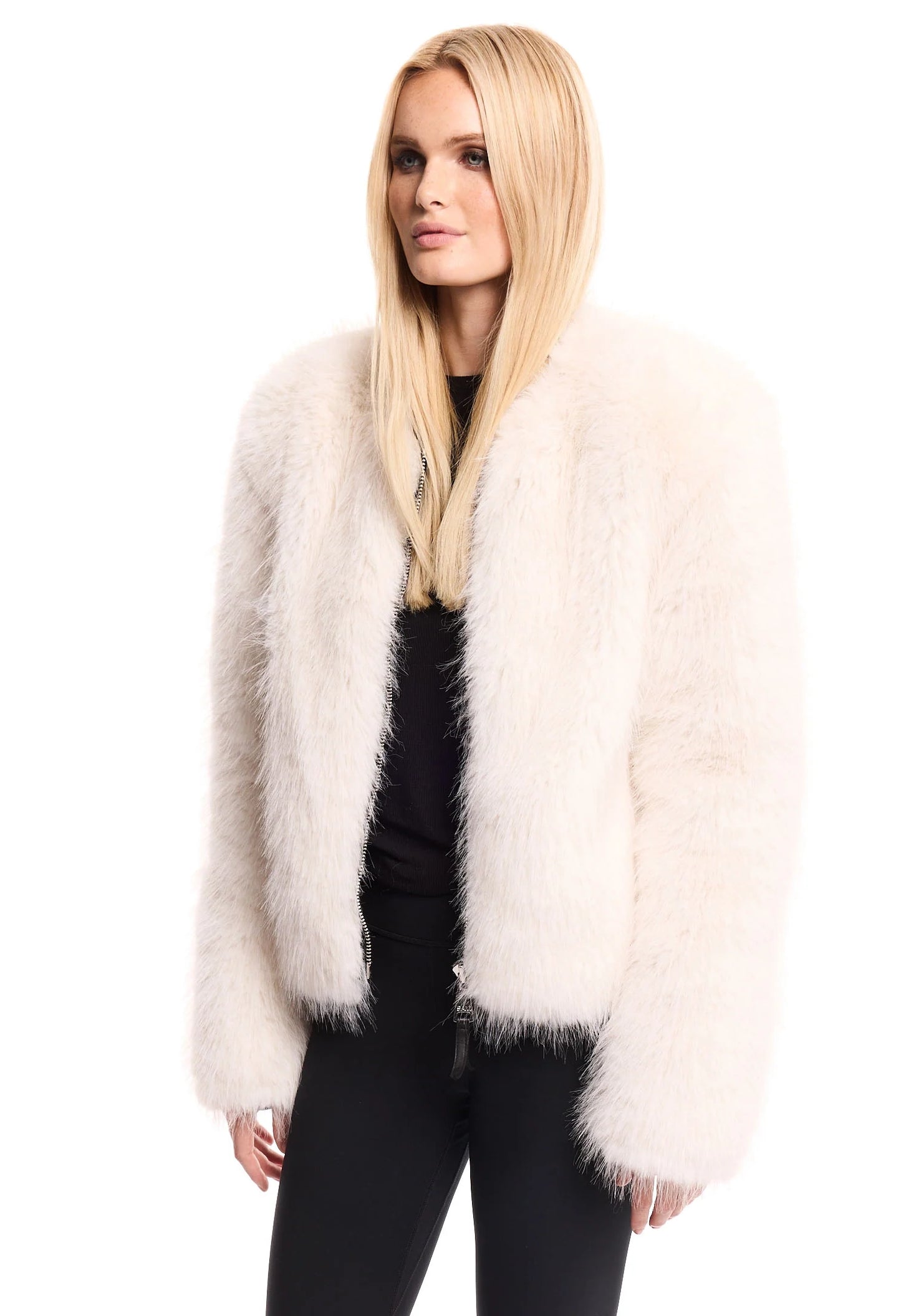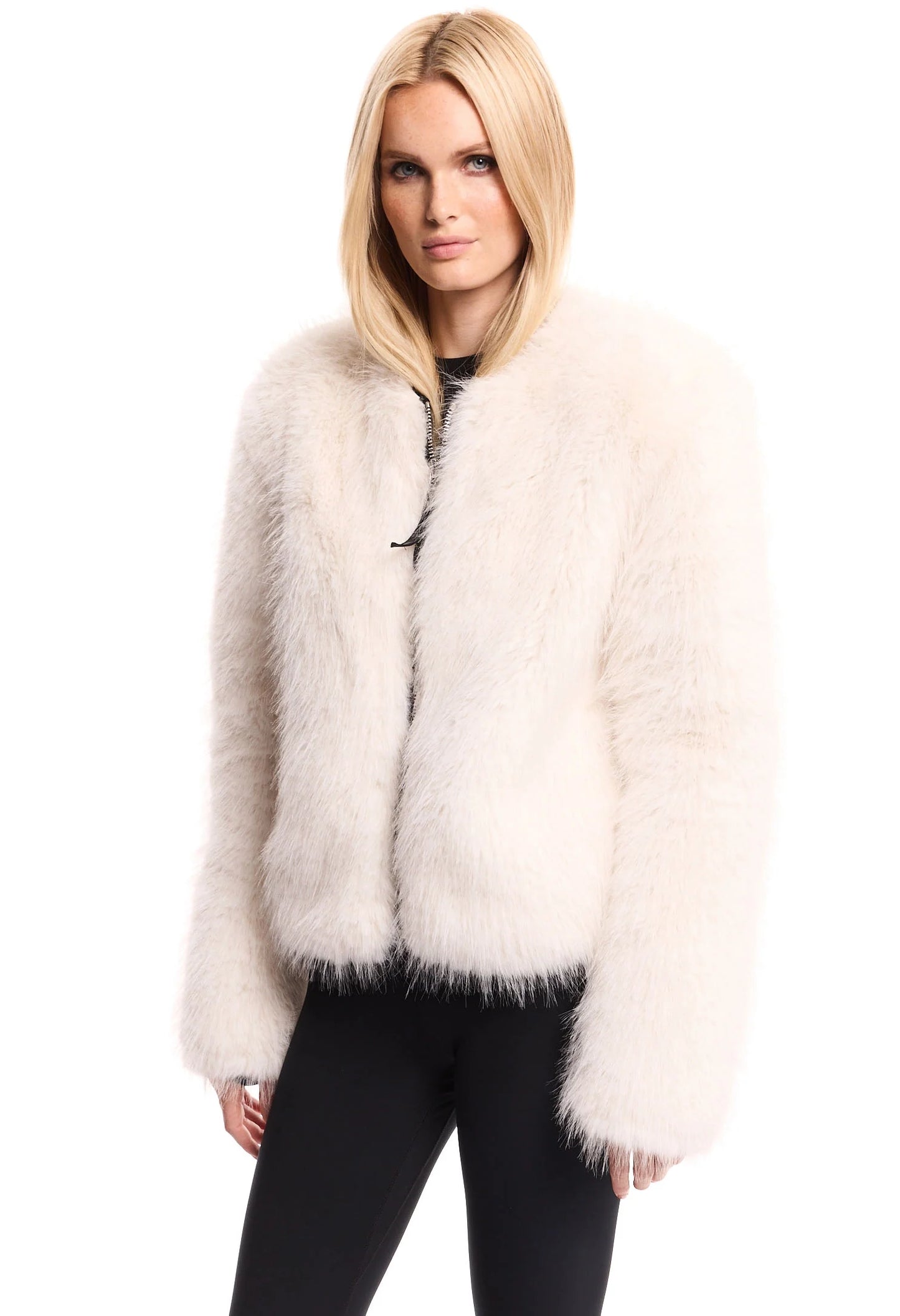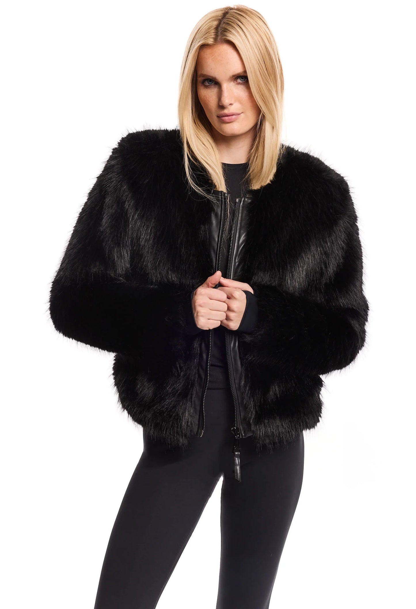 Elevate your winter collection with this sophisticated faux fur jacket. The minimalist design, coupled with the soft faux fur texture, exudes a modern and refined aesthetic. Its versatile color allows it to transition seamlessly from day to night, while the subtle leather details and spandex thumbhole cuffs add a touch of urban flair. Whether paired with jeans or worn over a dress, this jacket provides both warmth and style.