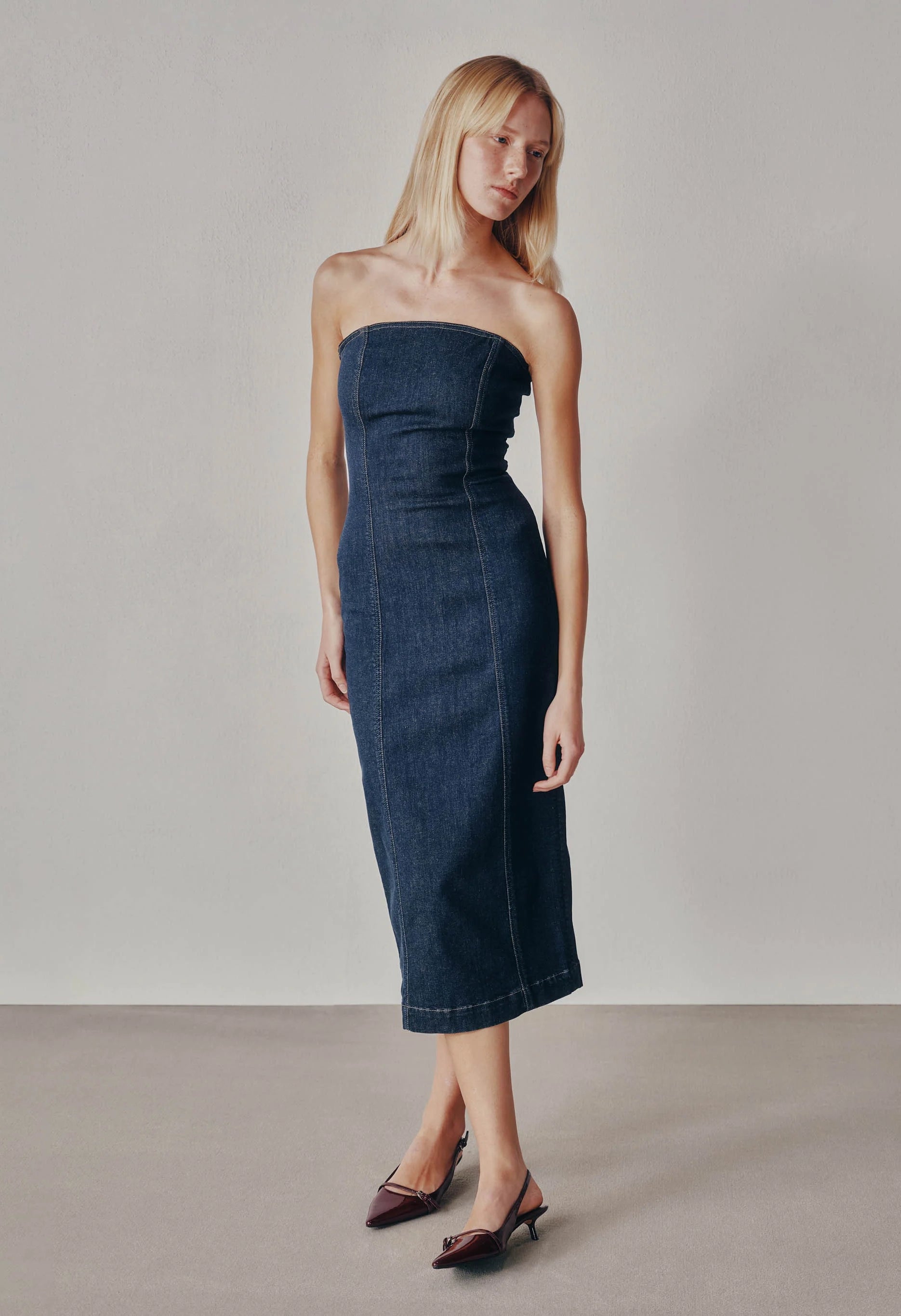 Esme Strapless Midi Dress offers a sleek, form-fitting silhouette designed for effortless elegance. Crafted in Crescent Harbor dark indigo wash with subtle fading, it features silver hardware and khaki stitching that add refined contrast. The dress includes a hidden back zipper and a clean hem, ensuring a smooth, polished finish ideal for sophisticated occasions.