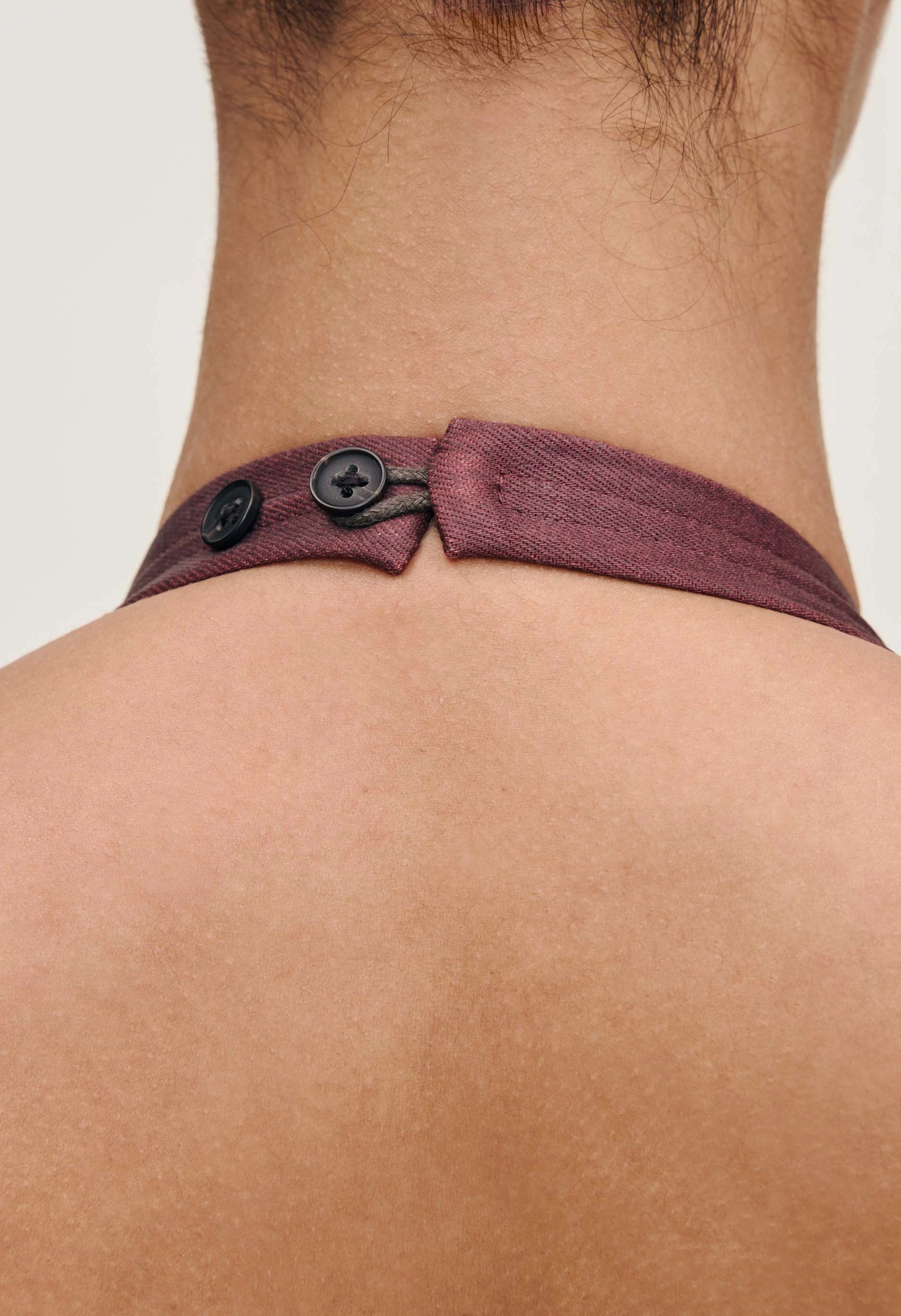 This sophisticated halter neck midi dress showcases a sleek silhouette with a concealed side zipper for seamless styling. Crafted from Saffron Coated fabric—a luxurious wax-treated denim with a rich crimson hue and subtle leather finish—the piece is elevated by polished silver hardware and refined tonal stitching. The clean hem completes the elegant, contemporary design.