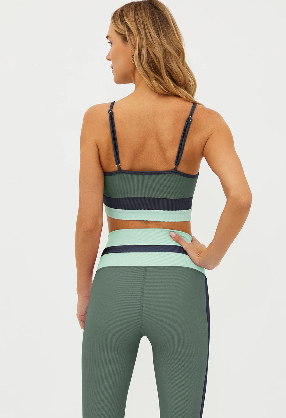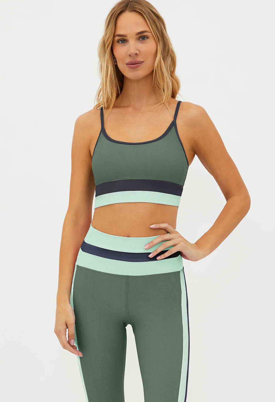 The Eva Top is a multi-functional piece that seamlessly transitions from the beach to the gym. Designed with ultra-soft luxe ribbed fabric, it offers adjustable straps and a thick band under the bust for added support. The Palm Paradise Colorblock combo adds a touch of coolness with shades of sage, slate, and icy blue.
