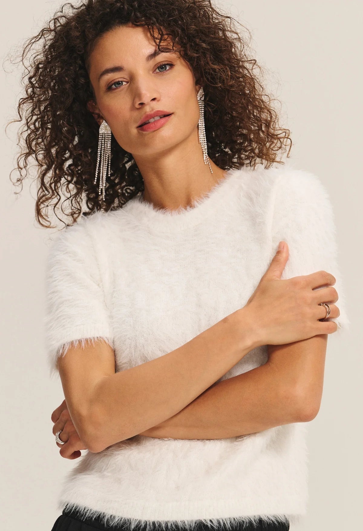This short-sleeve sweater features premium feather yarn construction that provides a cloud-like feel against the skin while maintaining excellent elasticity for unrestricted movement. The timeless crew neck silhouette strikes a balance between polished and casual, making it a versatile addition to any wardrobe that pairs seamlessly with various outfits.