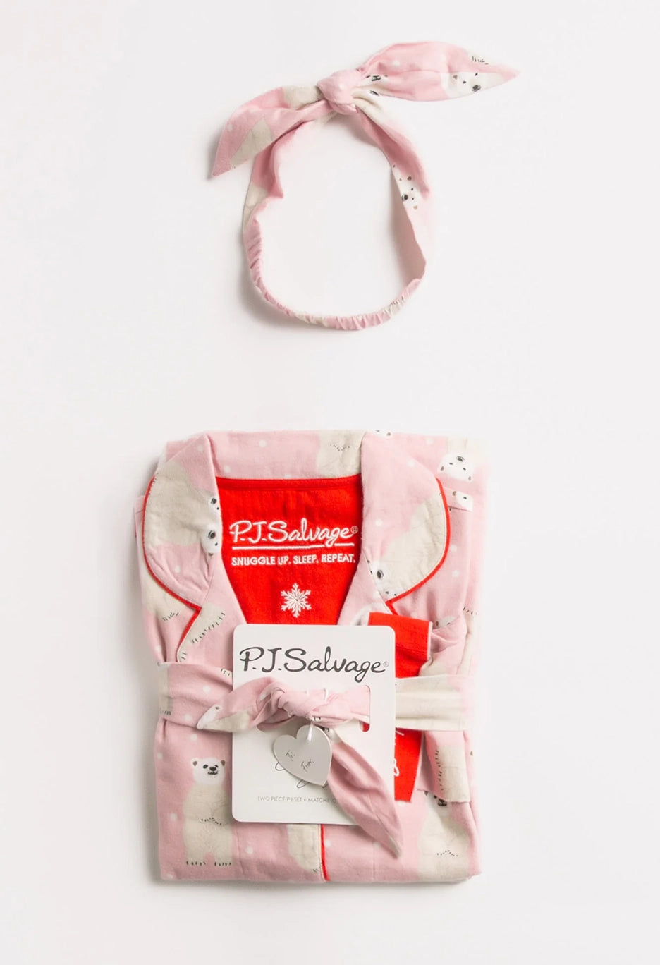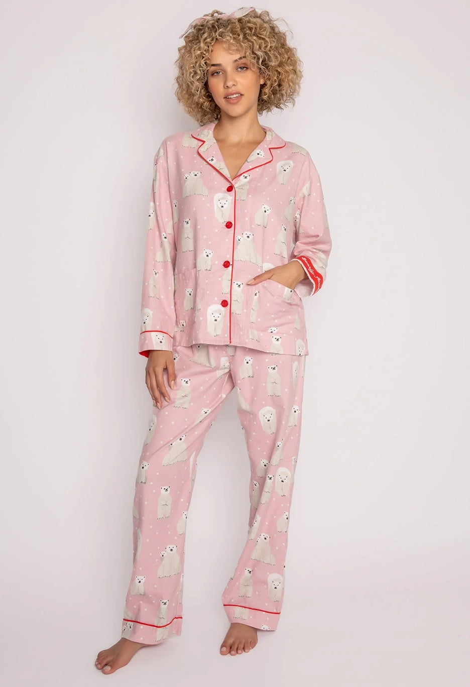 Love to curl up and hibernate? Us too! Get winter's best in the world's softest cotton flannel pajama set. Our polar bear-print pj has all the signature detailing with embroidered cuff (Bearly Awake) & matching hair wrap. A perfect ready-made gift in our classic relaxed fit top & pj pant. Model is 5' 10", wearing size small.