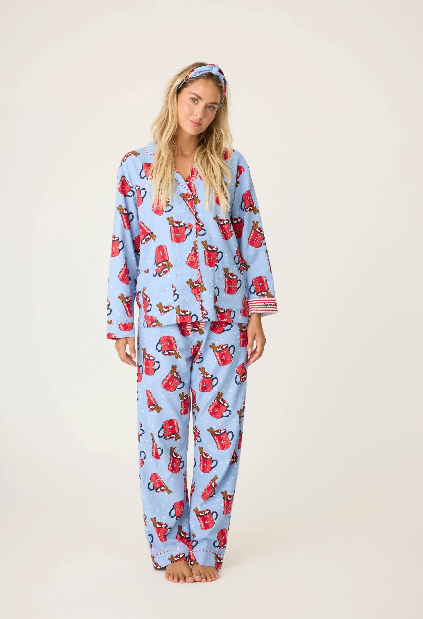 Embrace the warmth of the season with this charming 'Hug in a Mug' PJ set. It includes a classic collared top and comfortable tie-waist pants, both featuring a delightful hot cocoa mug pattern. The rich blue fabric provides a cozy touch and the whimsical design adds a playful touch, perfect for chilly evenings. Made from soft, breathable fabric, this pajama set is perfect for lounging at home or enjoying a cozy night in. Indulge in the delightful warmth and joy of this set.