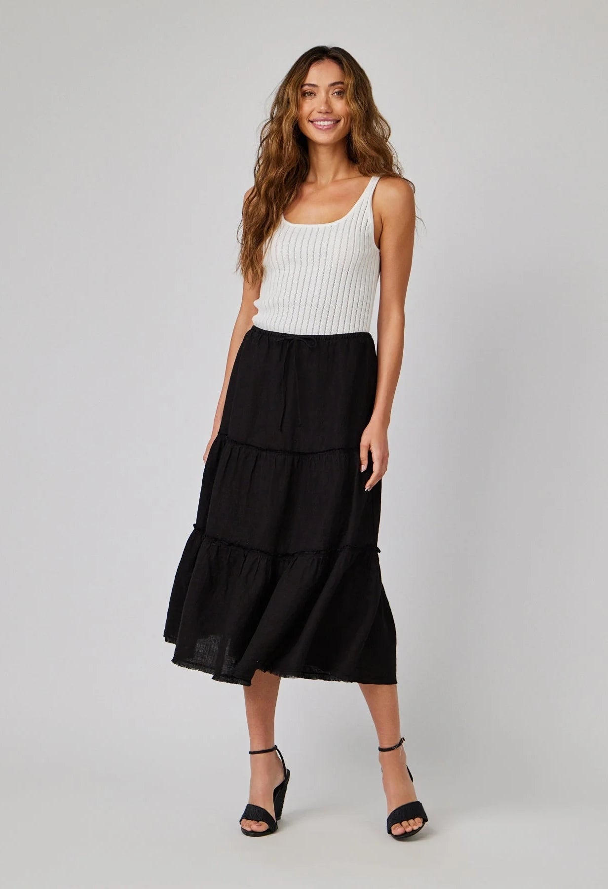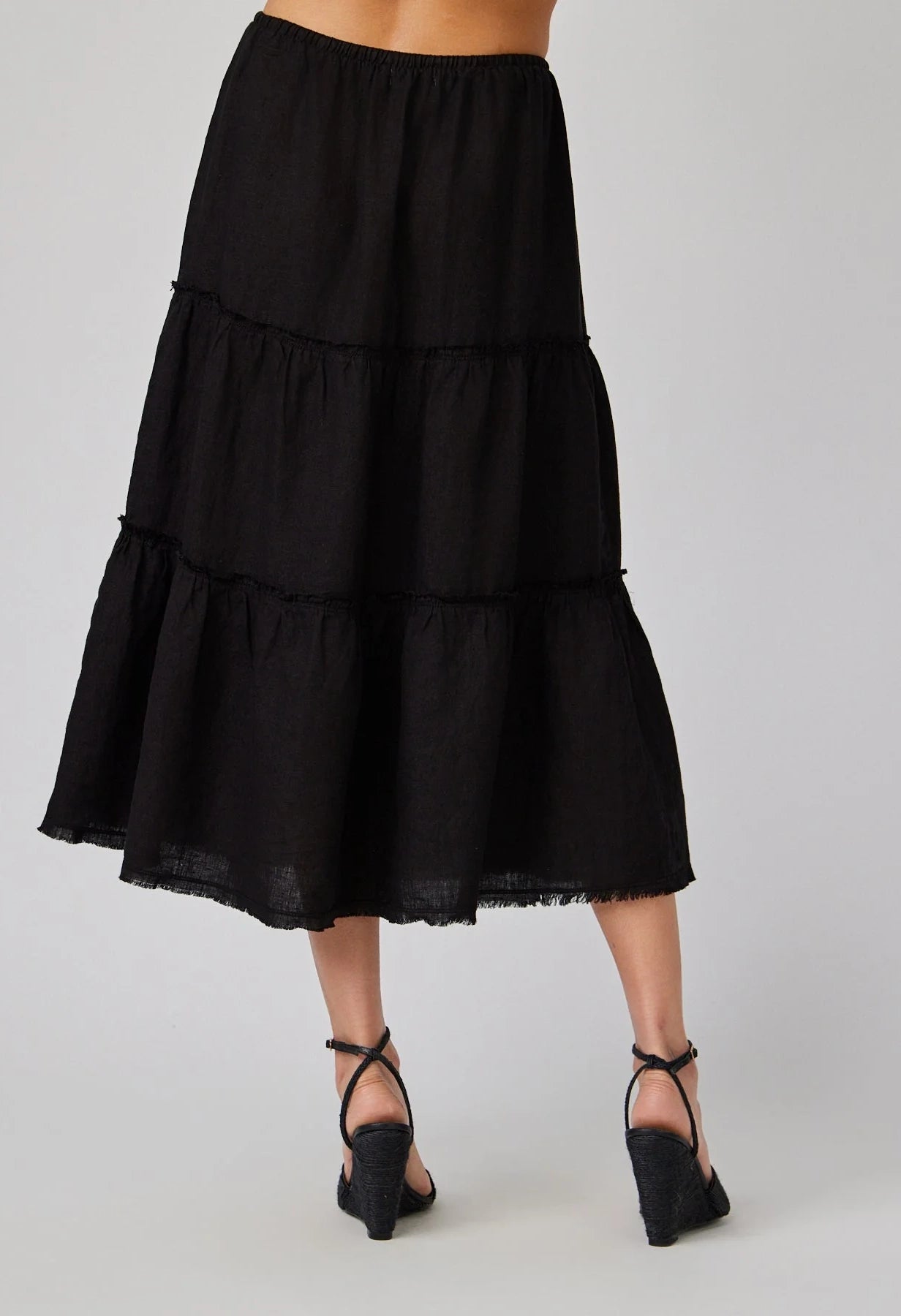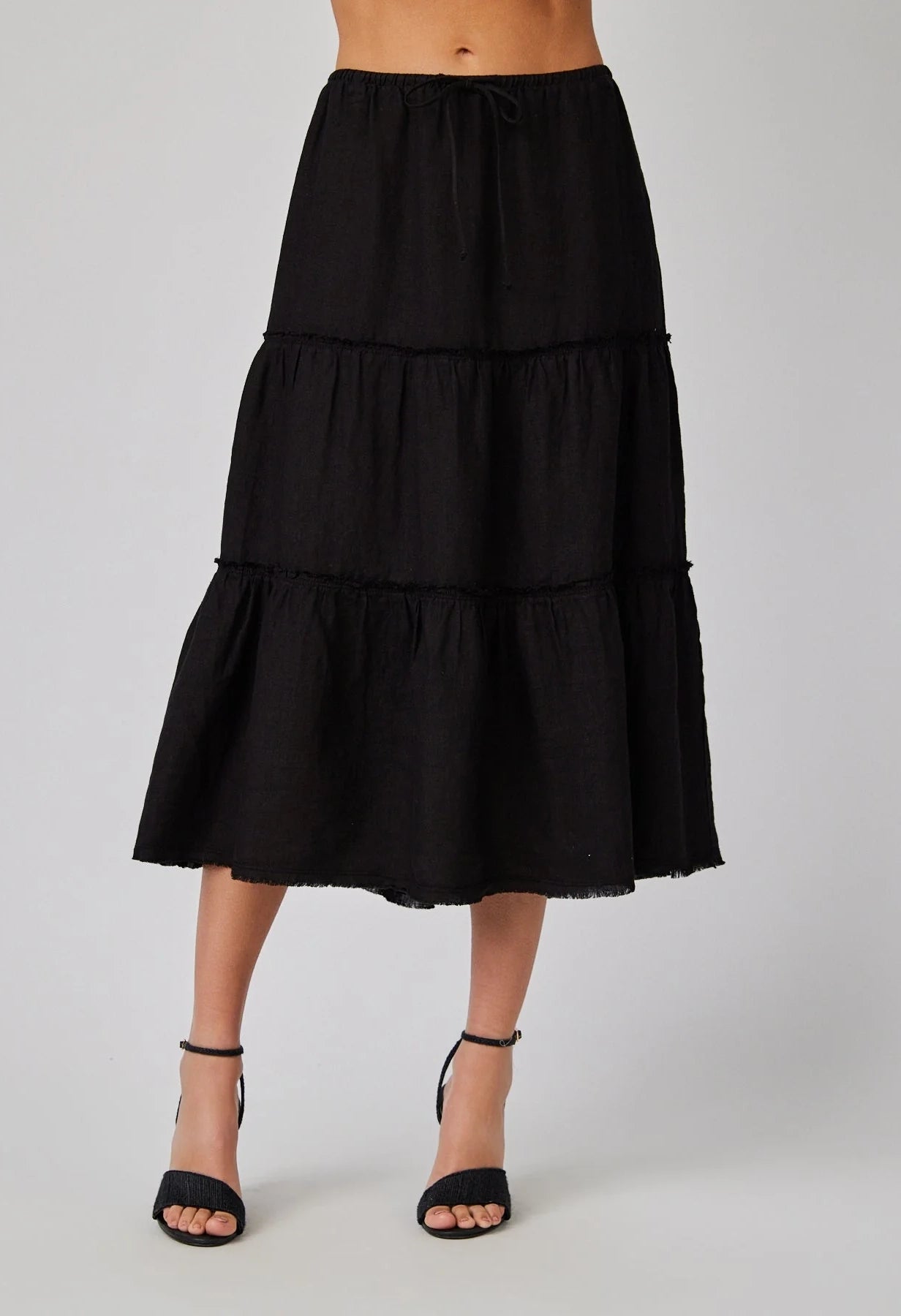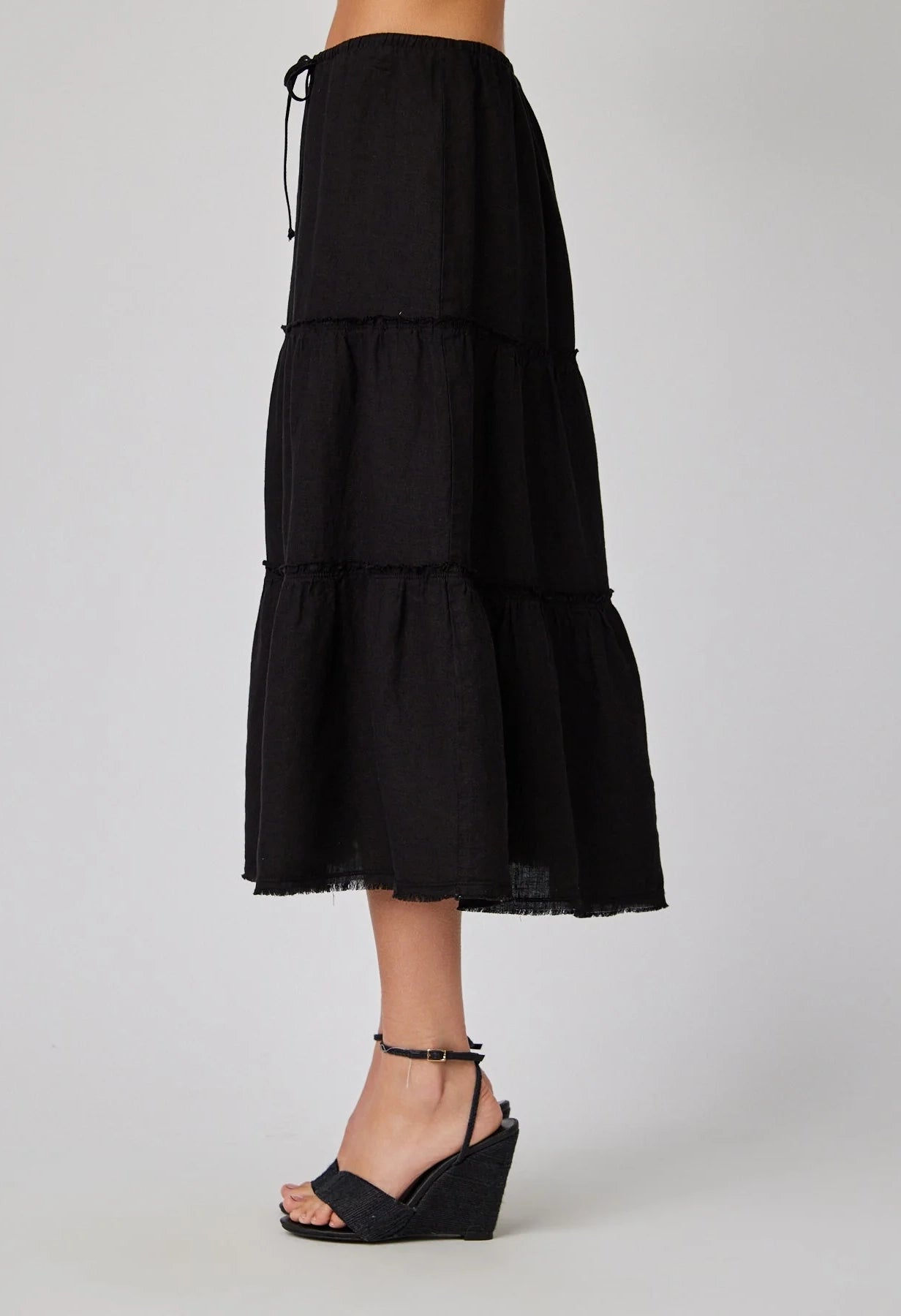 The Frayed Tier Skirt is a must-have for any wardrobe. With its flattering midi length and soft fray details, it adds an edgy and playful feel to your look. The elastic waistband ensures a comfortable and effortless fit, making it perfect for all-day wear. Dress it up or down for any occasion.