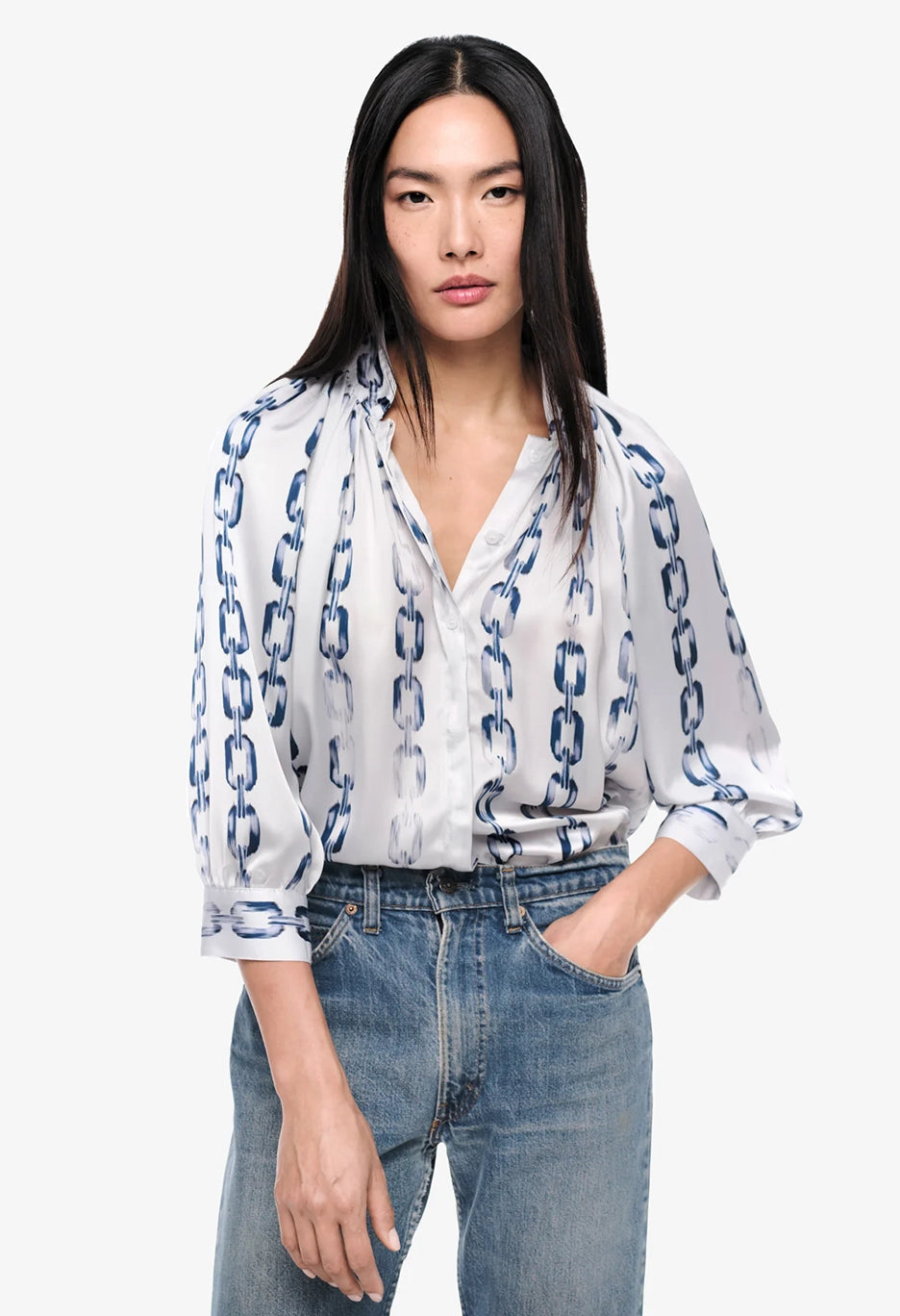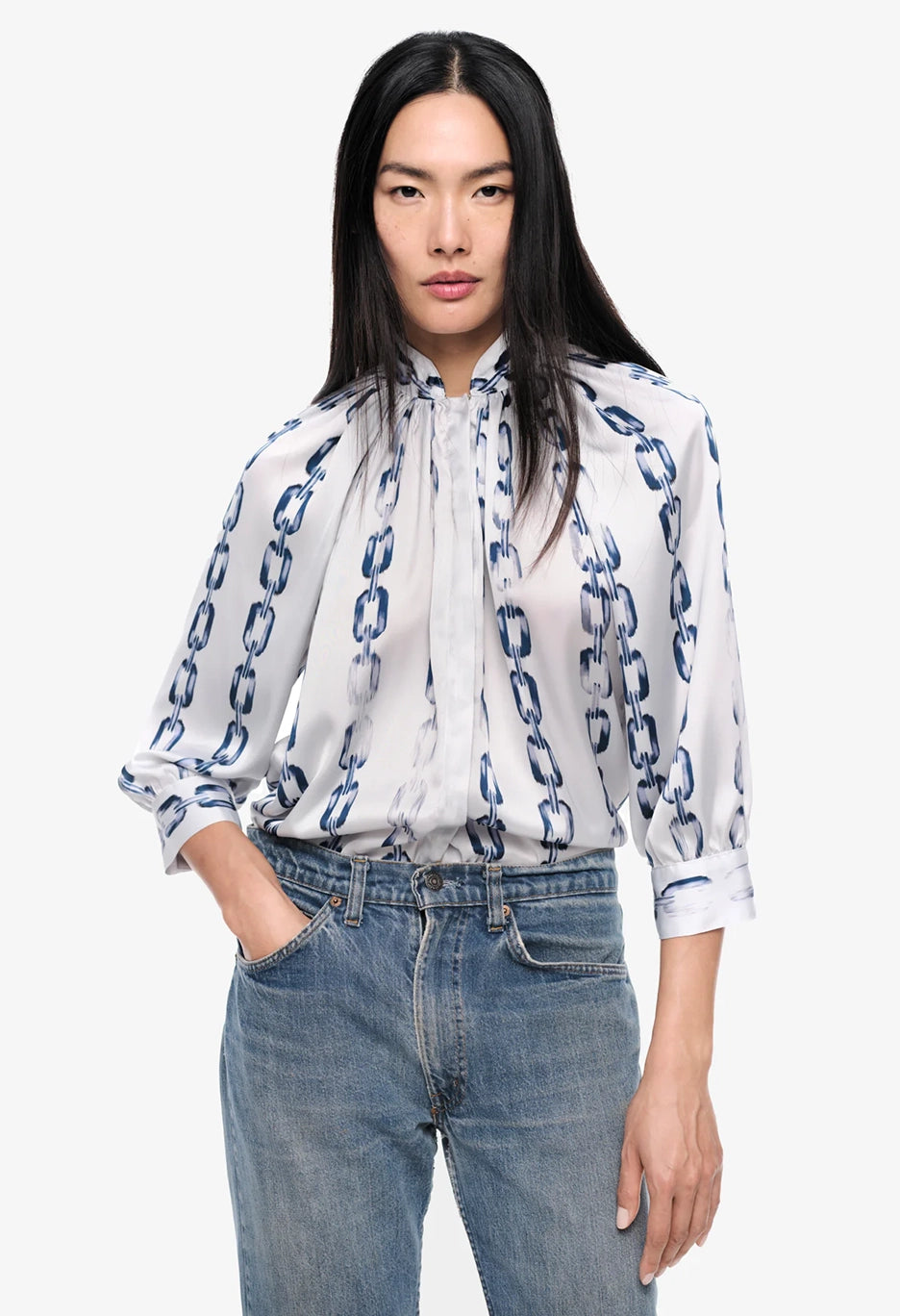 Indulge in decadent style with the Gathered Blouse. Featuring an alluring indigo chain-link print, this season's interpretation adds a touch of 80's nostalgia. The sophisticated collar bridge elevates this must-have SMYTHE blouse to a new level of luxury.