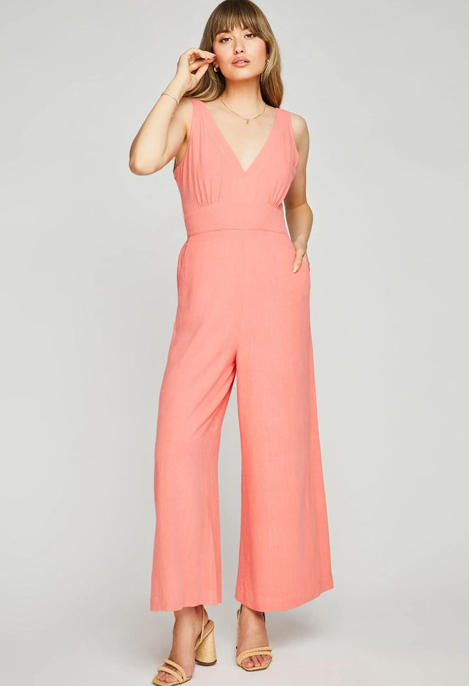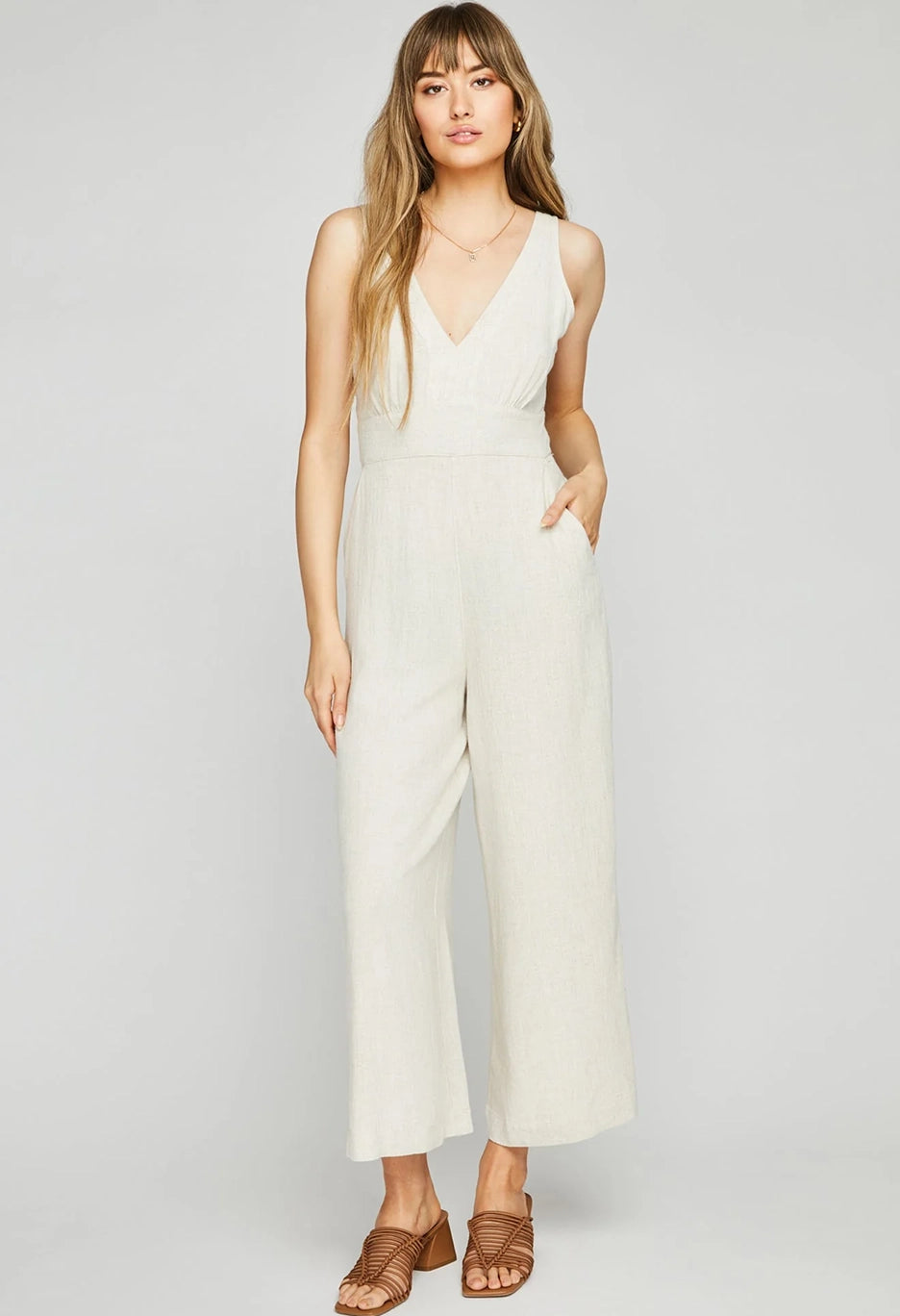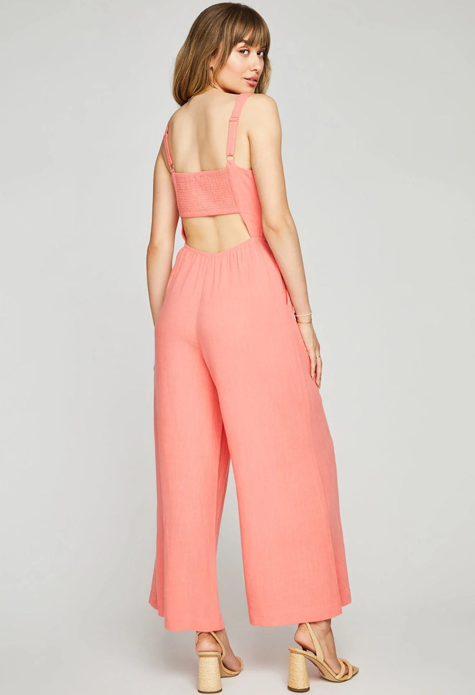 The Gianna jumpsuit is made of a linen blend for an effortless look and feel. Features include adjustable straps, slash pockets and back smocking panel with a cut-out detail.