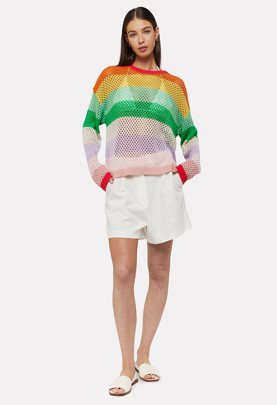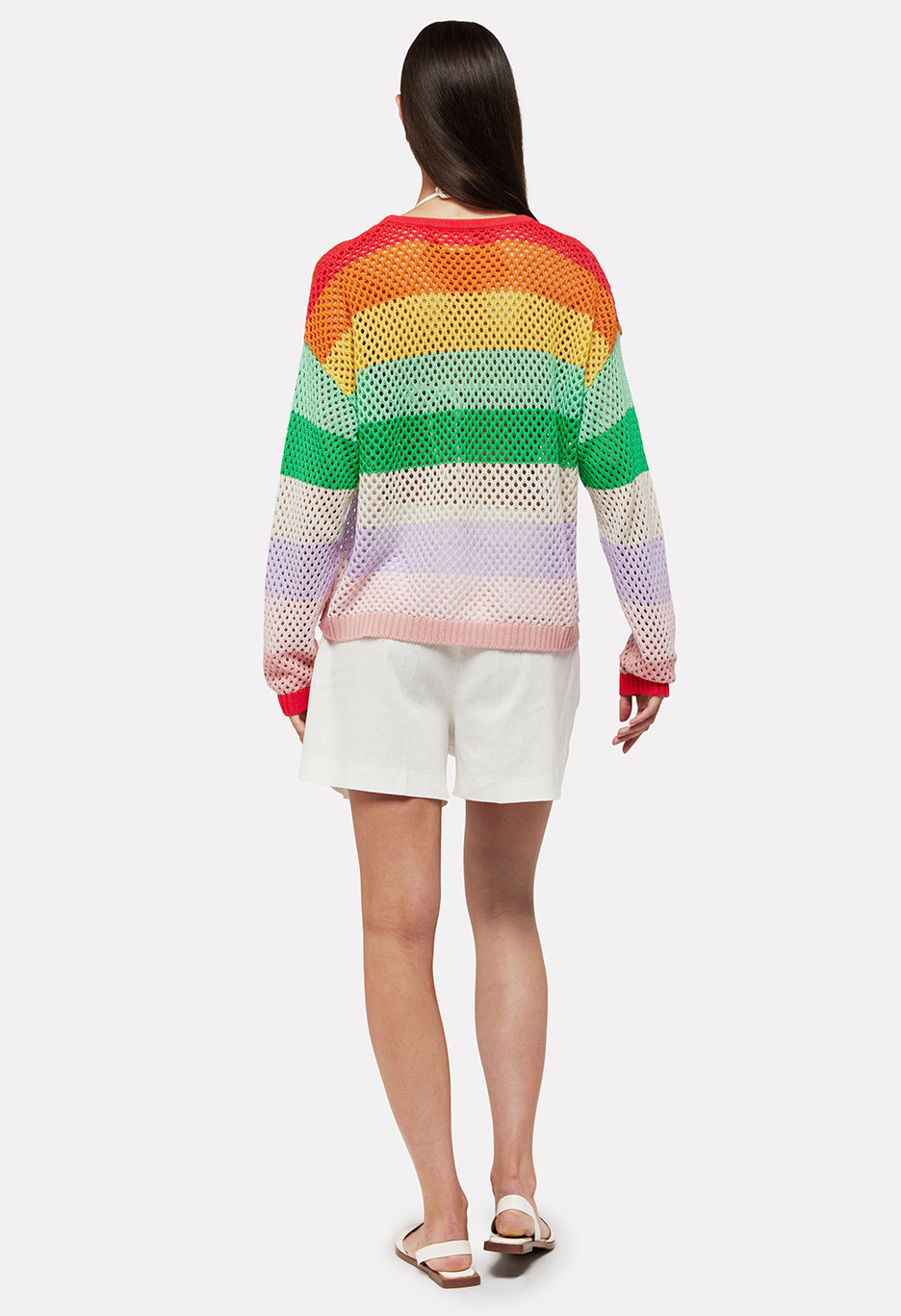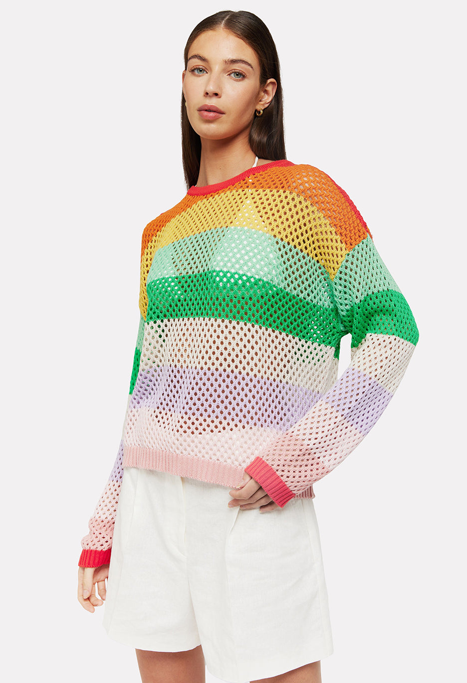 Effortlessly stylish, the Gianni Open Stitch Crew Top features a loose knit design with rainbow stripes. Crafted for comfort and fashion-forward looks, this sweater is perfect for any occasion. Embrace the laid-back vibe with this versatile piece.