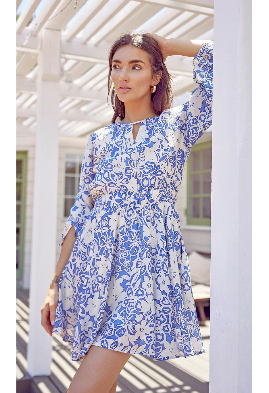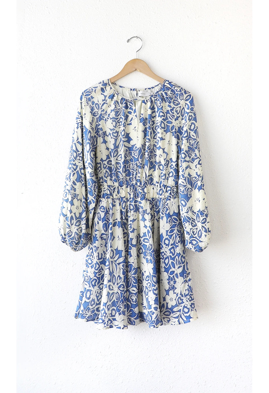 This mini dress has a smocked waist, puffed half sleeves, and a beautiful blue print. It is perfect for a sunny outing or trying out a new restaurant in town.