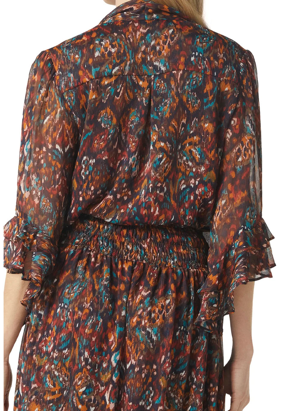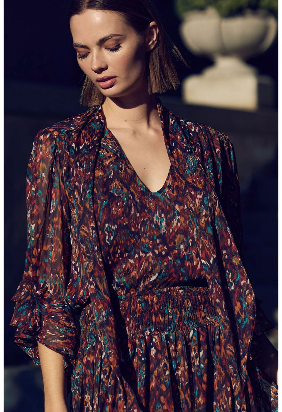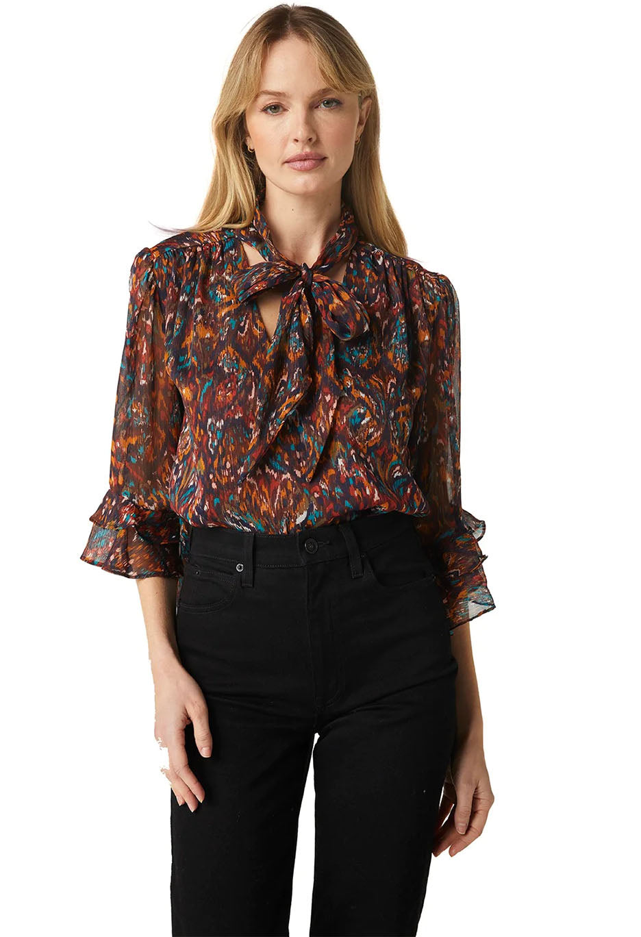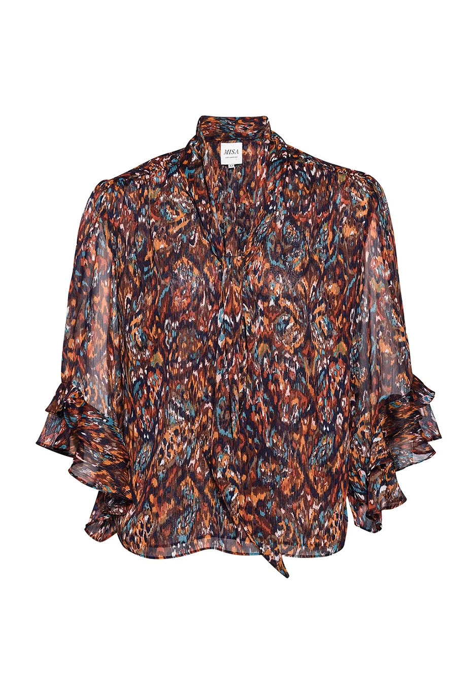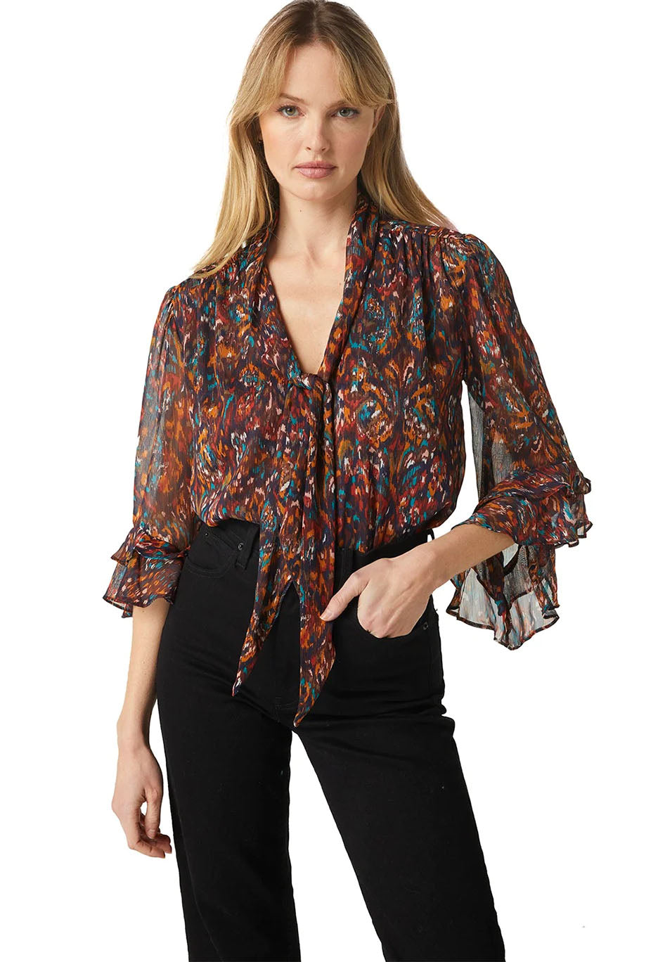 Statement-making chic, the Gigi top is cut from a gorgeous peacock abstract print chiffon with shimmering lurex. Three-quarter sleeves with ruffle trim and a v neckline with neck-tie that can be worn loose and undone for a laid back look or tied in a bow. This workday to weekend look can be paired with black pants or denim for a casual look.