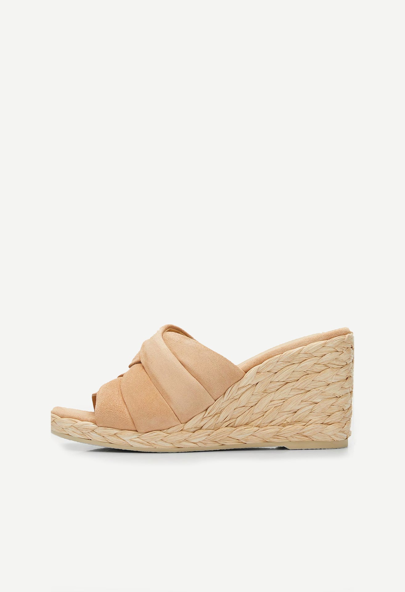 A broad crisscross vamp cage the foot in this exceptionally comfortable slide with a braided-jute wedge heel.