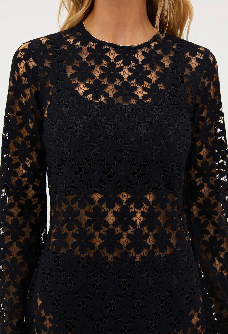 So beautiful and beachy, the Goldie Dress is featured in a feminine babydoll silhouette with a classic A-line style and bell-shaped sleeves. This mini dress features a floral lace detail throughout and is the perfect spring cover-up.