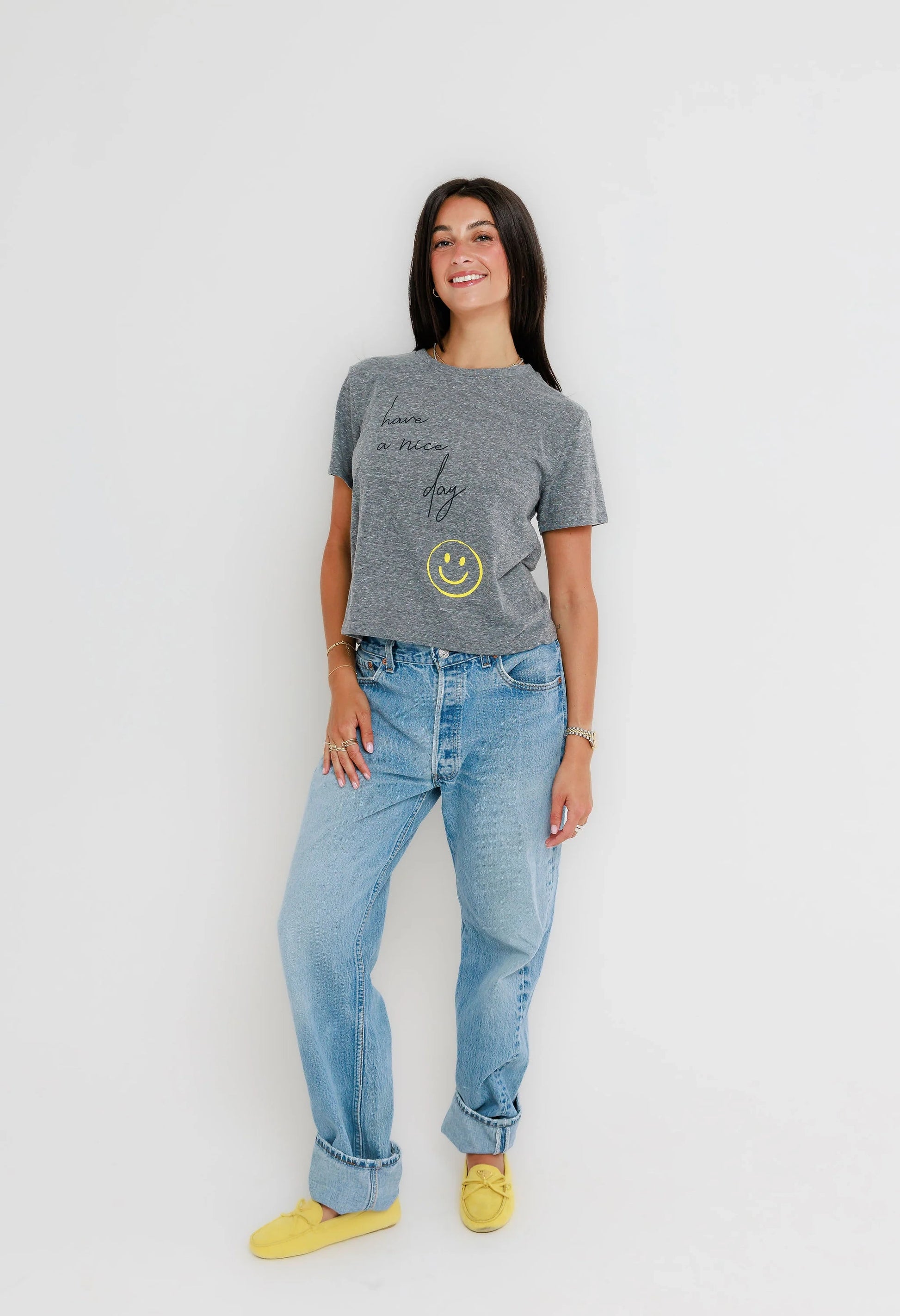 Spread positivity with the Have A Nice Day Everyday Tee. This comfortable heather grey t-shirt features a friendly reminder to embrace each moment with optimism. Perfect for casual wear, it's an effortless way to share good vibes with everyone you meet. Made for everyday comfort and style.