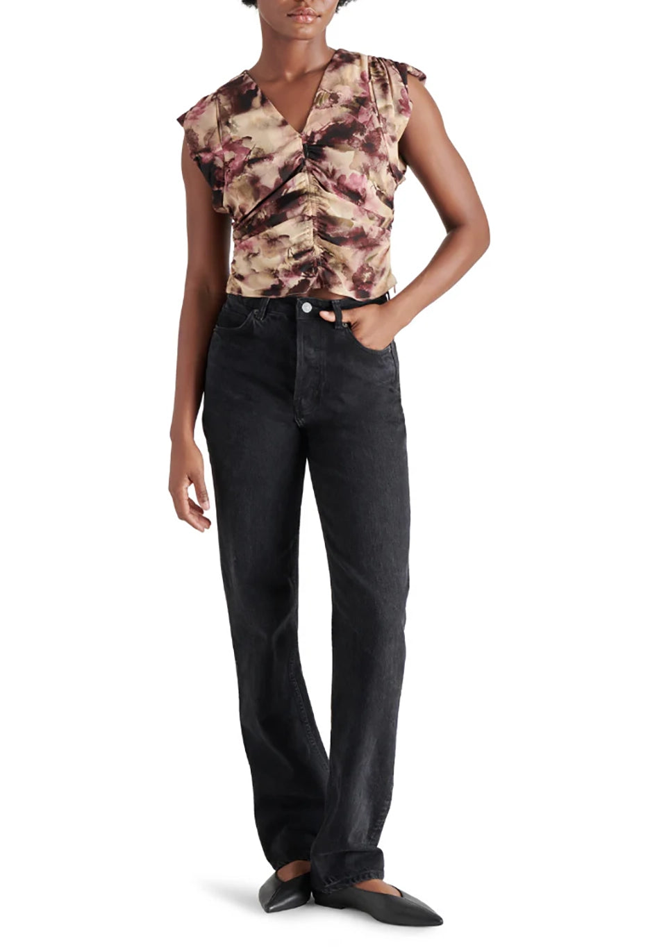 Experience a head-turning look with the Steve Madden Honey Floral Ruched Top. Its lively abstract print and refined ruched detailing make it suitable for all occasions. The sleeveless style and v-neckline bring an air of sophistication to any ensemble. Lightweight, versatile, chic, and absolutely stunning.
