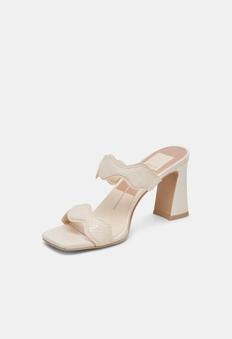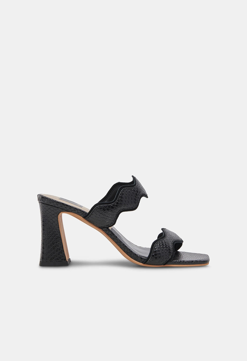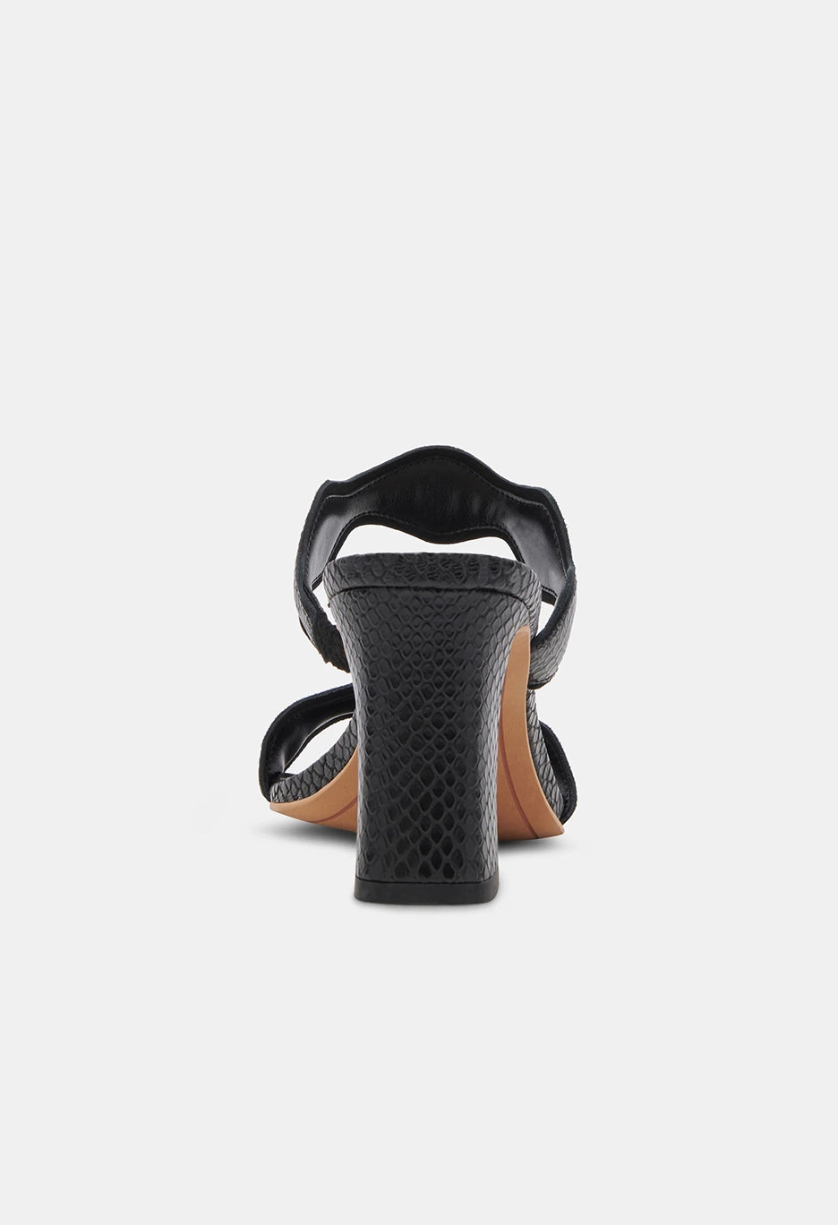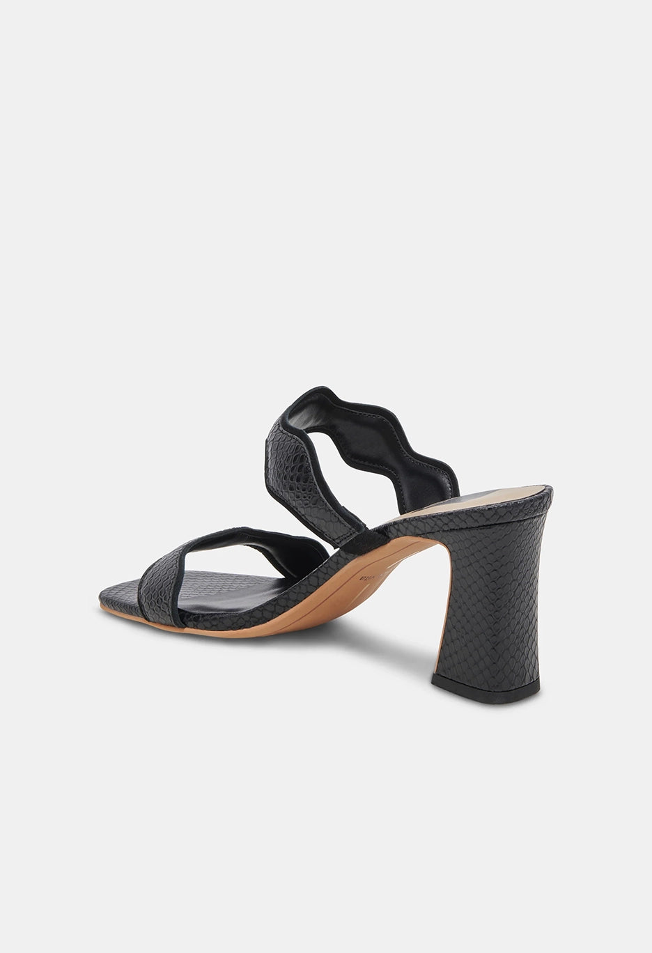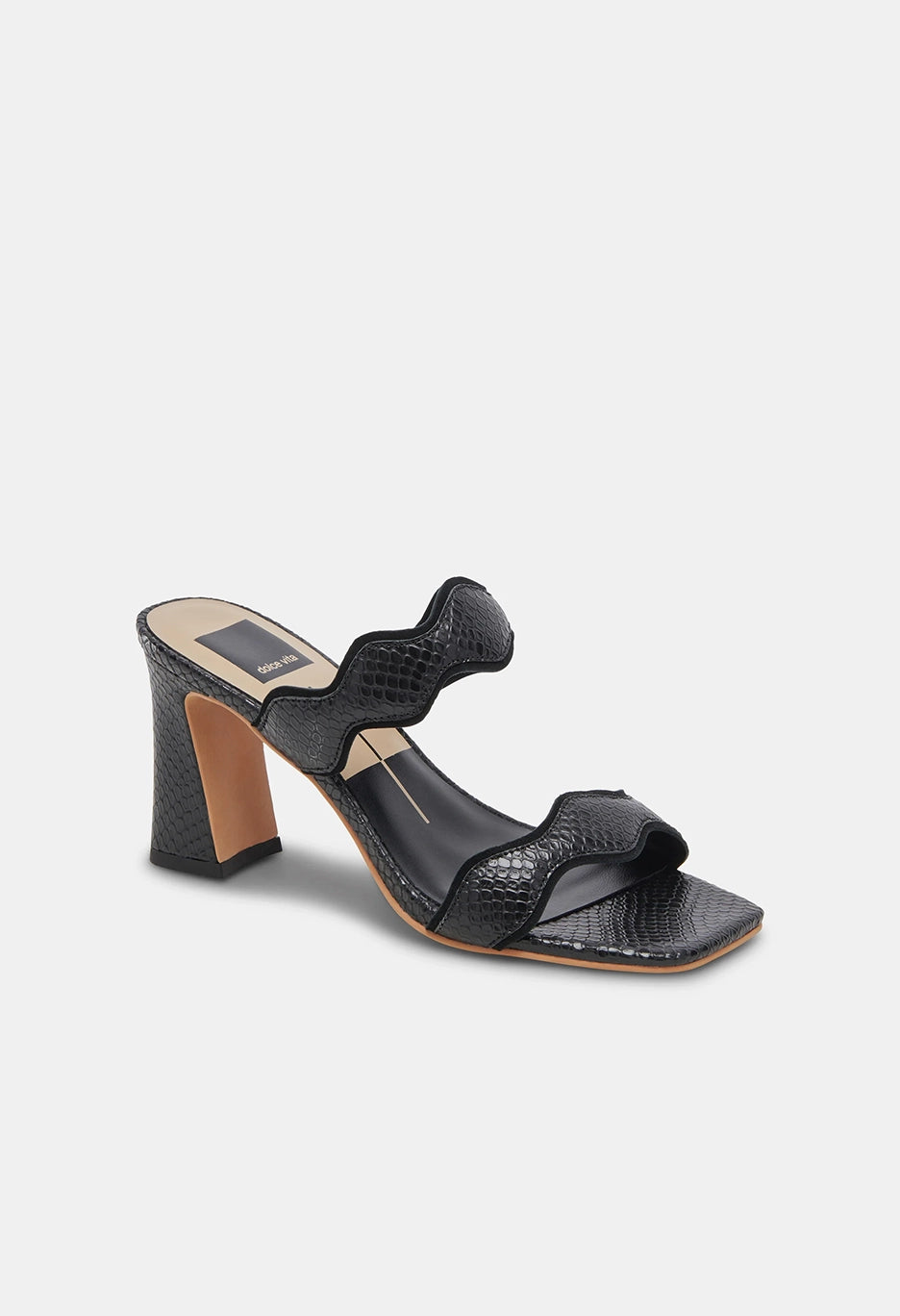 ILVA is the center of attention. A sculptural heel and scalloped straps make this the perfect party style. Choose from sophisticated suede hues or opt for statement-making leather.