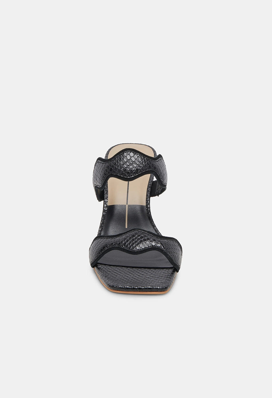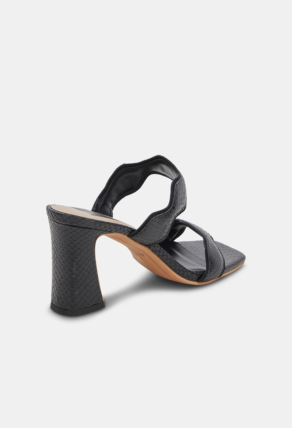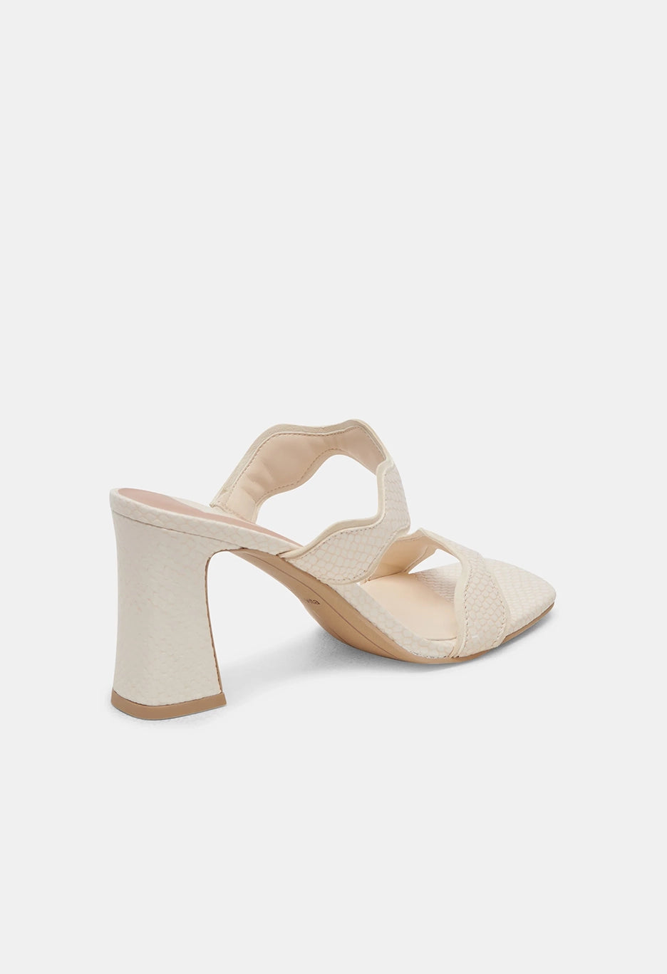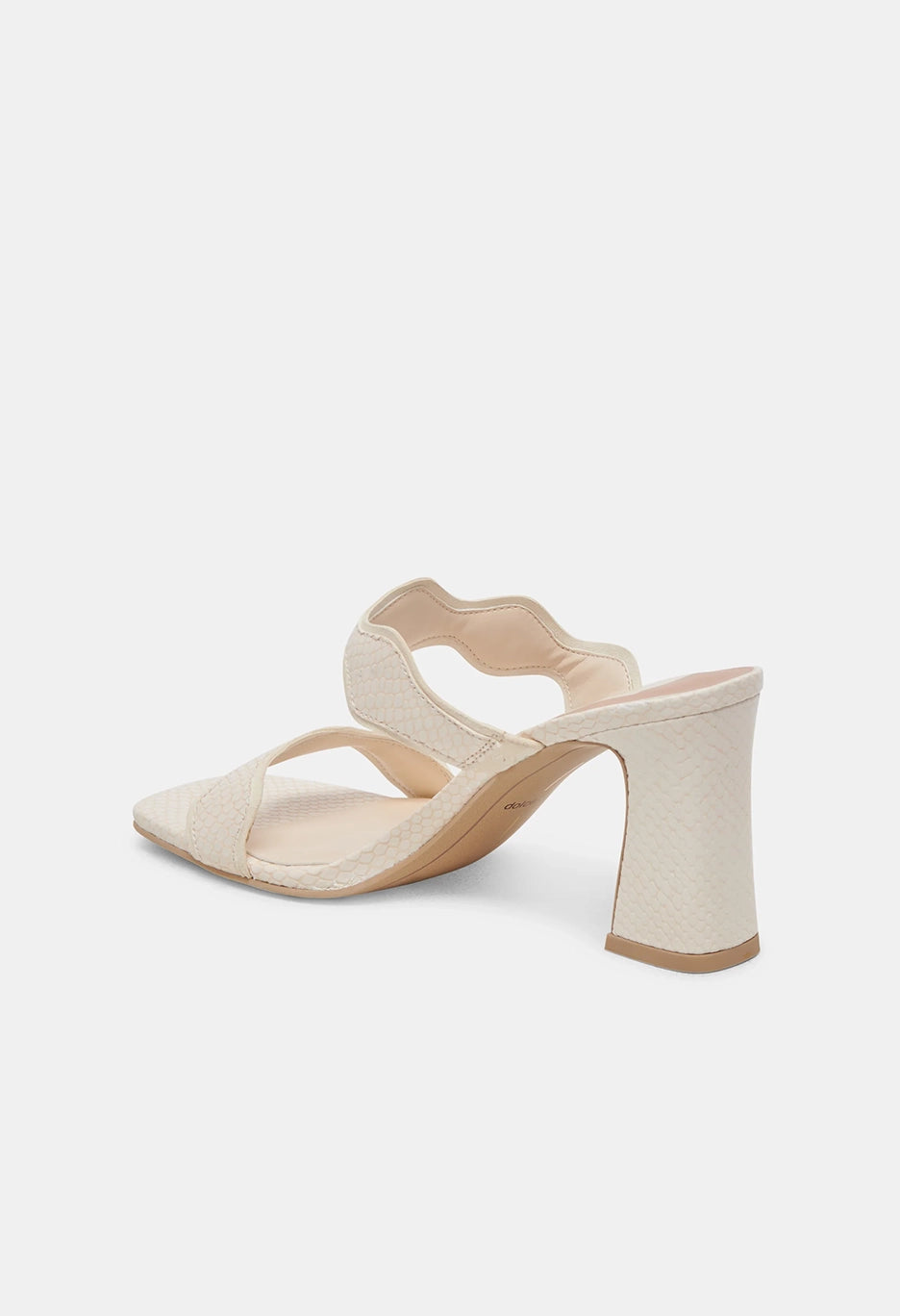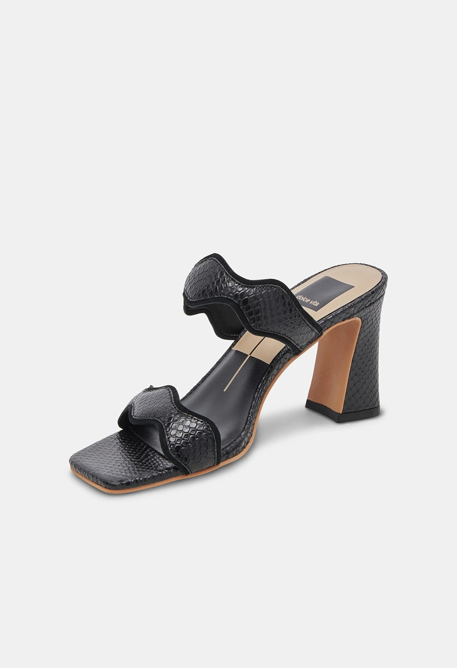 ILVA is the center of attention. A sculptural heel and scalloped straps make this the perfect party style. Choose from sophisticated suede hues or opt for statement-making leather.