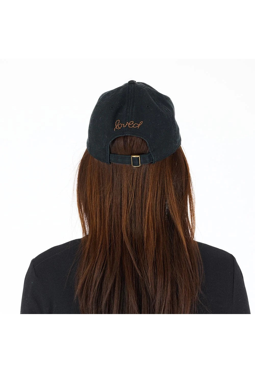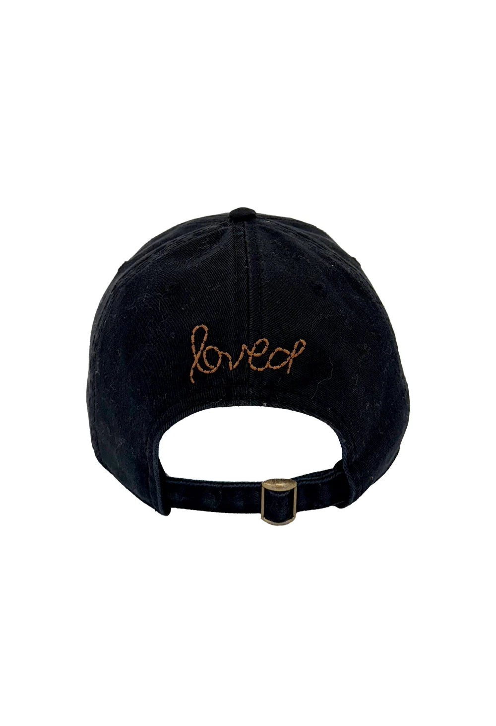 KR's Imperfect Heart Hat features black cotton-twill fabric with a saddle leather Imperfect Heart patch on the front. It also includes the embroidered word 'loved' on the adjustable tab at the back. This hat adds a stylish, laid-back touch to any outfit.