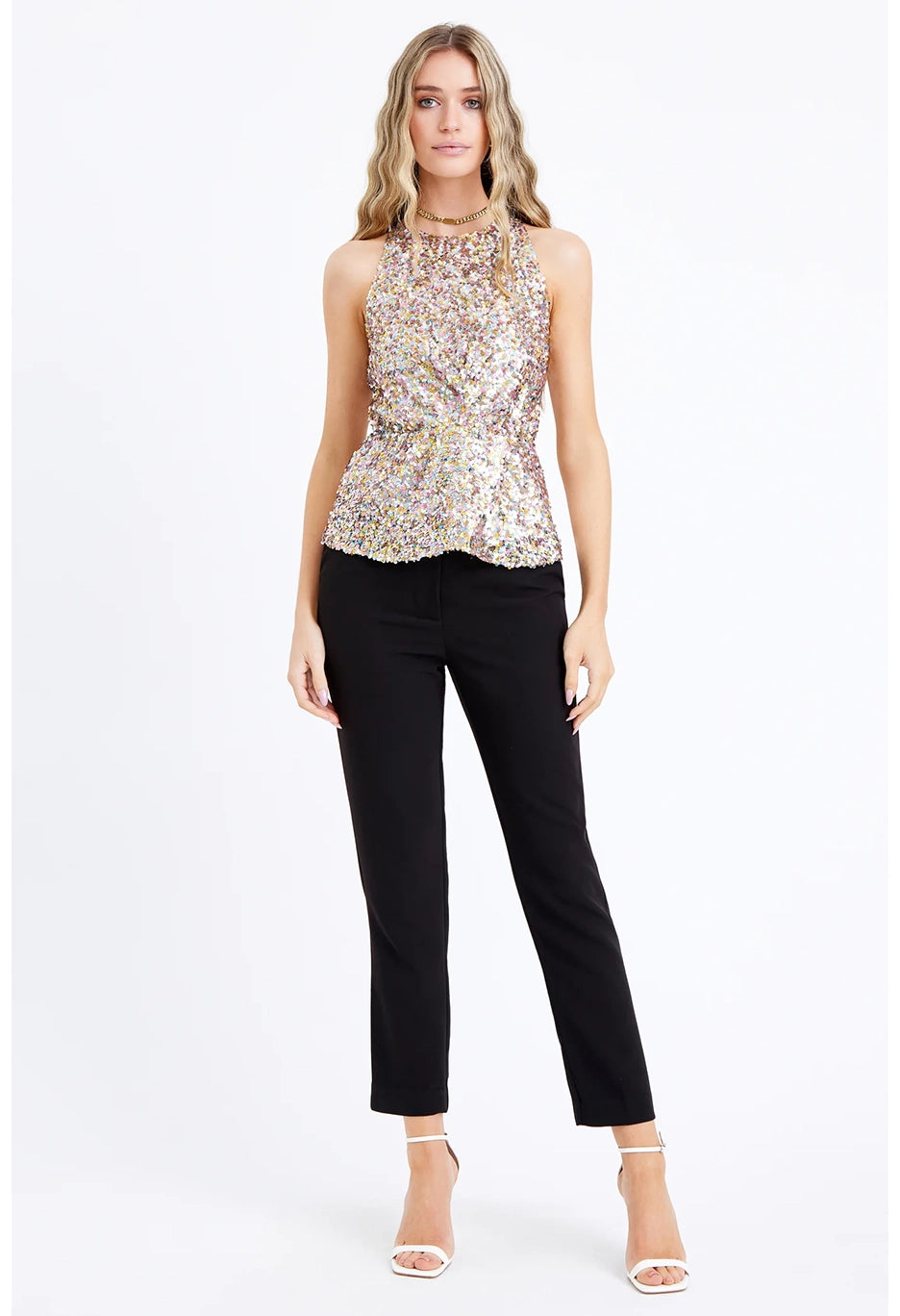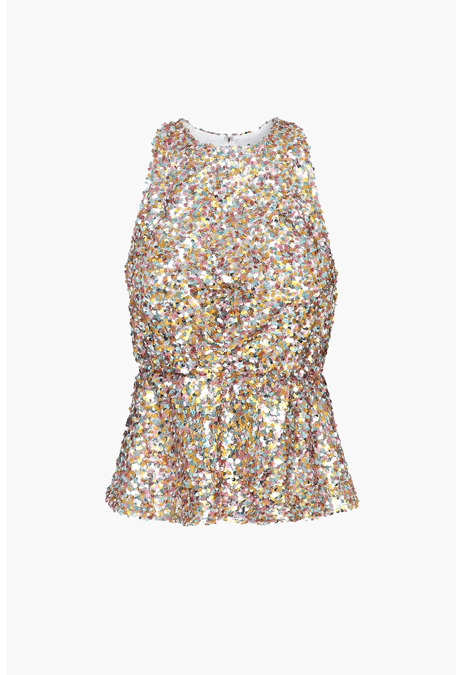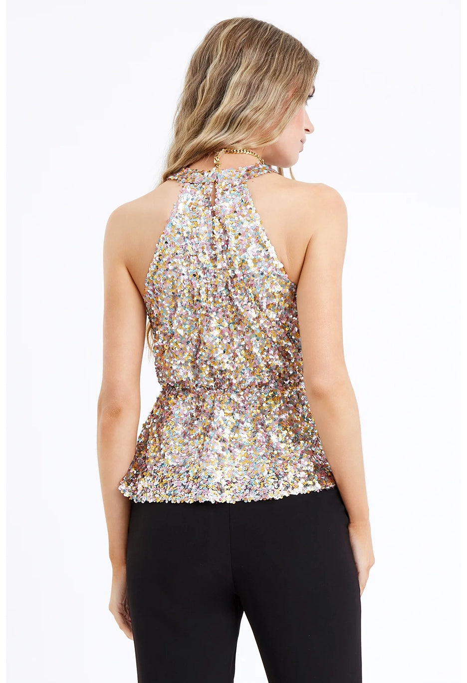 Introducing the Inda Sequins Halter Top: the perfect party piece to up your glam game! Featuring vibrant multicolor sequins and a cinched waist to show off those curves, this all-sequined number will make you the talk of the town. Shine on!