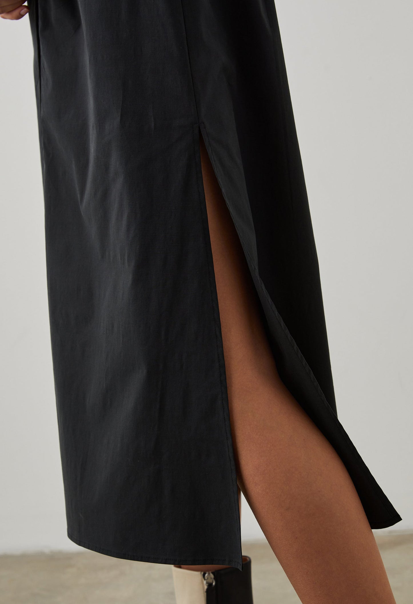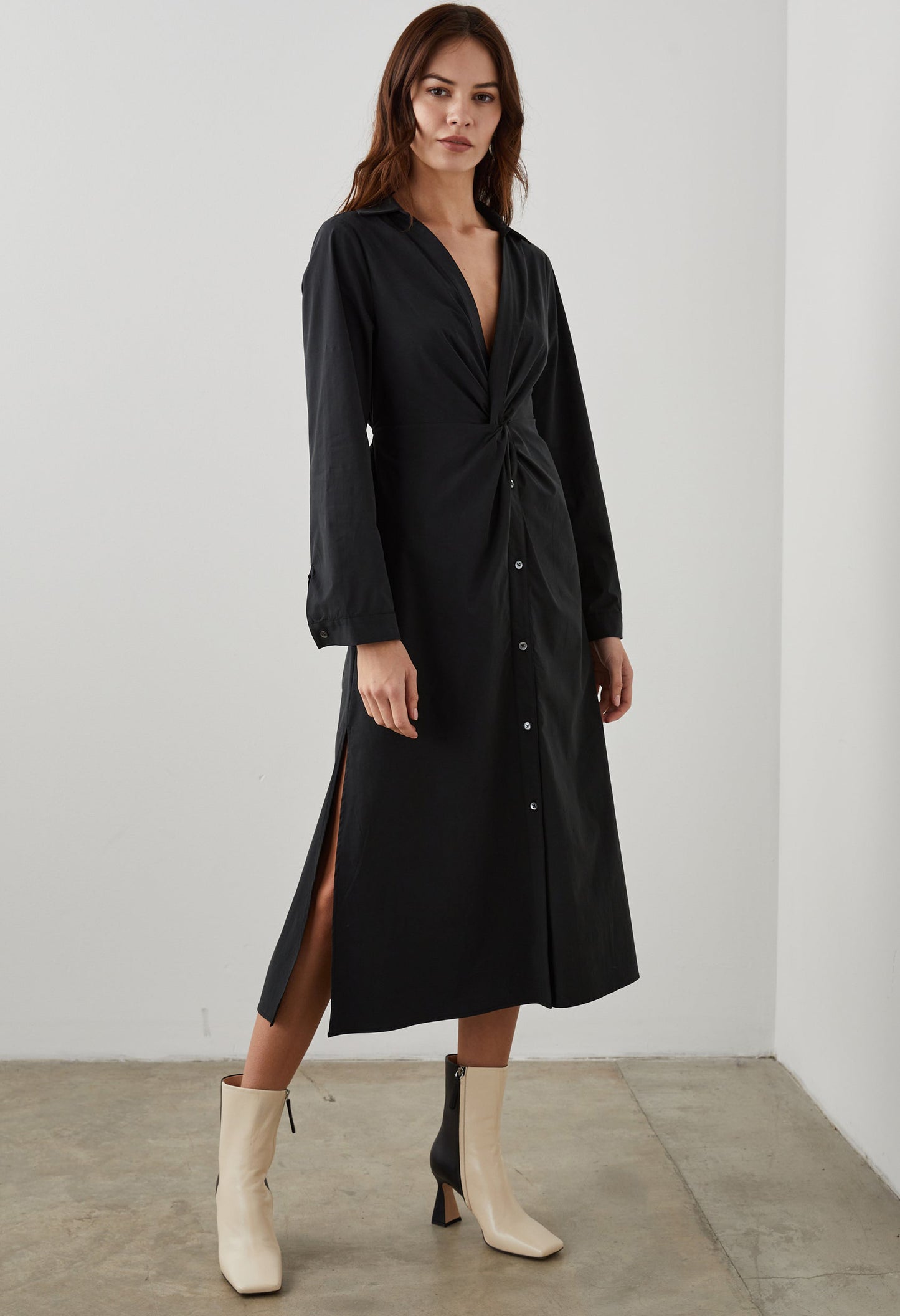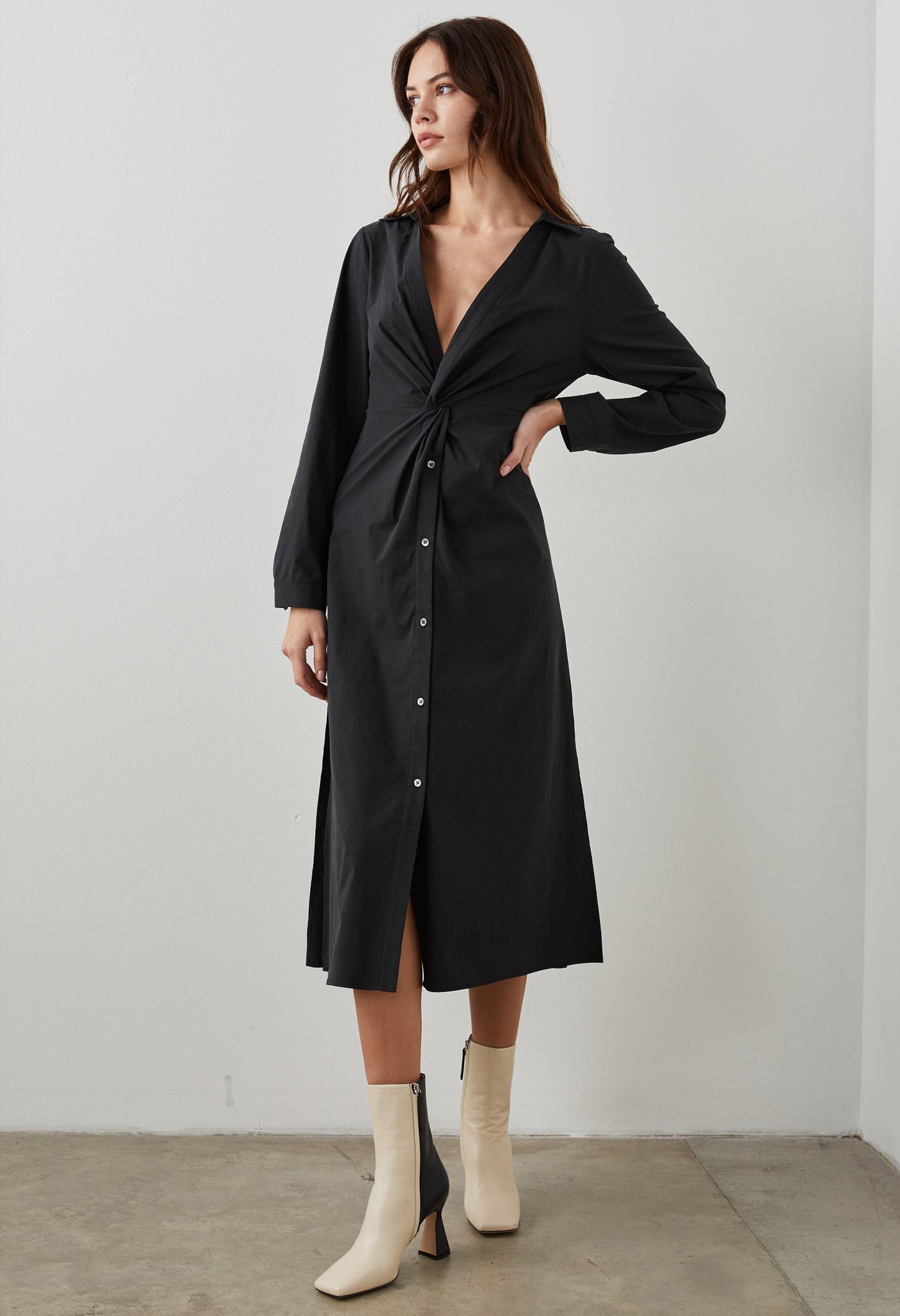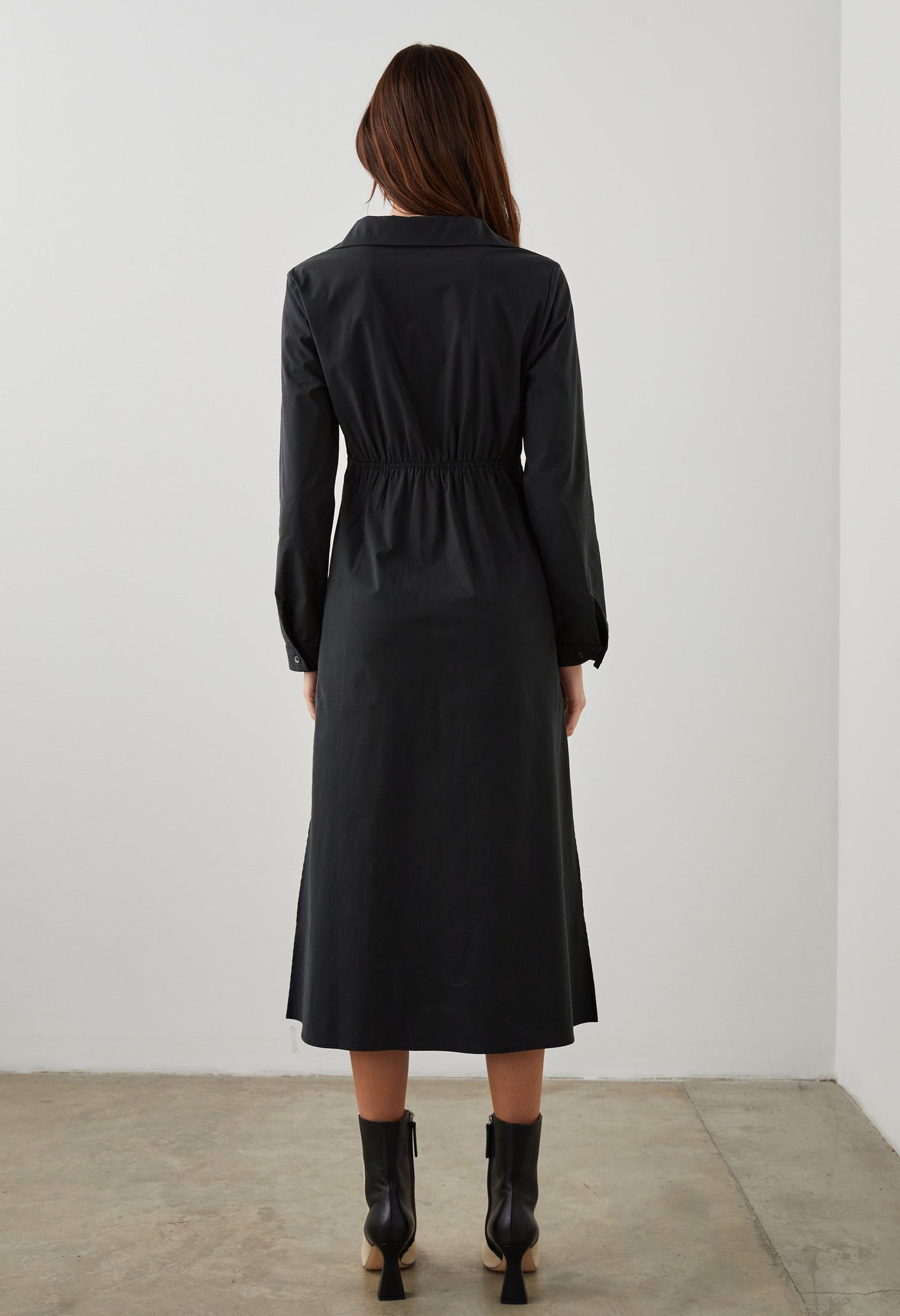 We designed this dress intentionally, down to every detail. Featuring a deep v-neckline, open collar, and focal-point detailing at the waist, this style fits and flatters just right. Made from stretch poplin, it'll keep you comfortable while maintaining its shape.