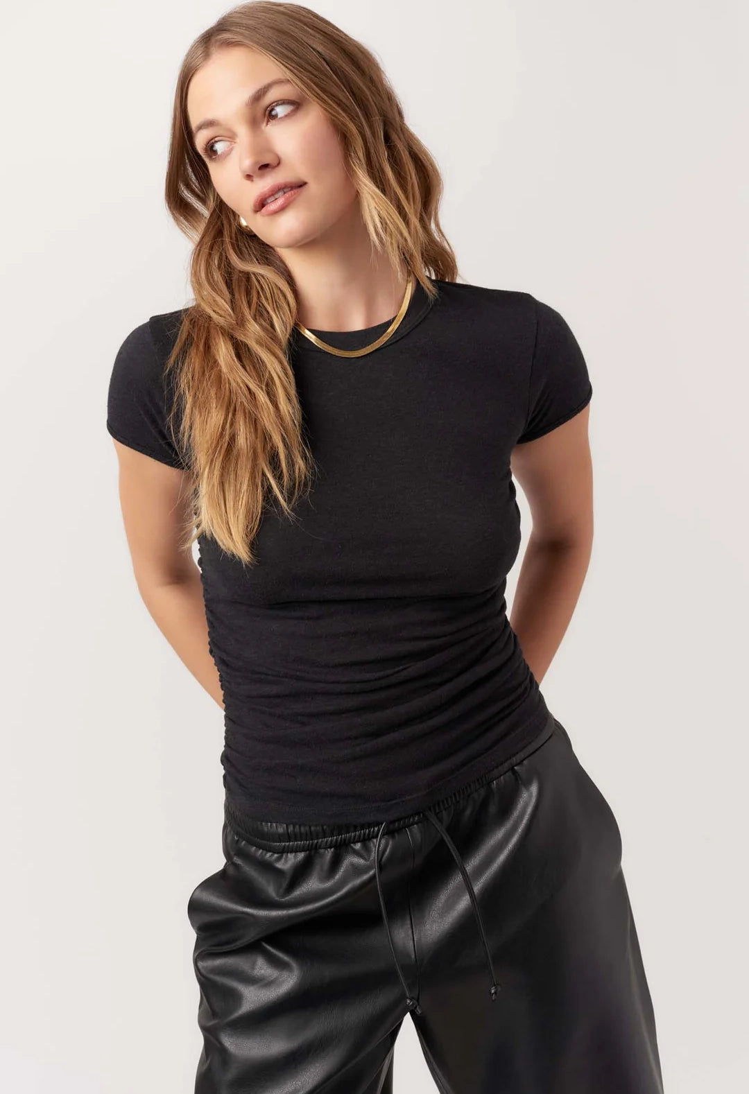 The Izzie Heathered Ruched Baby Tee boasts a slim and snug fit in a supple, heathered jersey fabric. Its crew neckline and short sleeves lend it a classic tee style, while the side ruching adds a touch of femininity and flatters the figure.