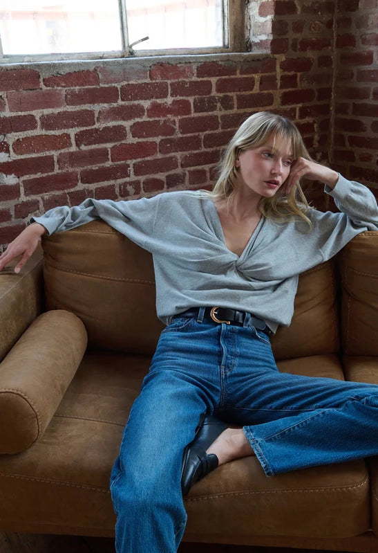 A blend of cashmere and cotton, this sweater is an essential cozy piece in any wardrobe. It offers a relaxed drop shoulder design, structured ribbed cuffs and hem, along with a gathered, knotted neckline for added detail.