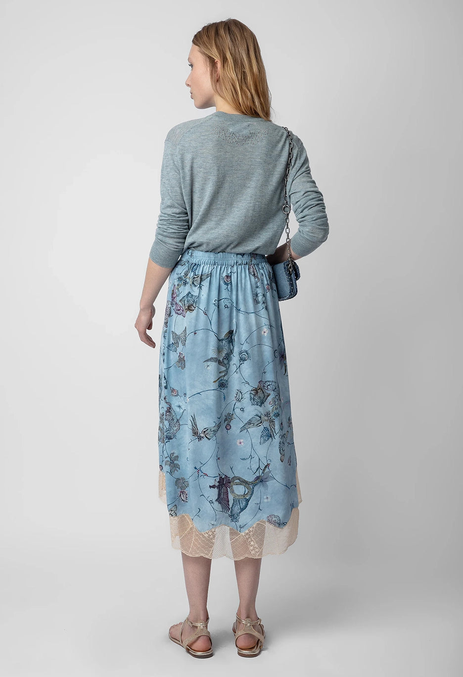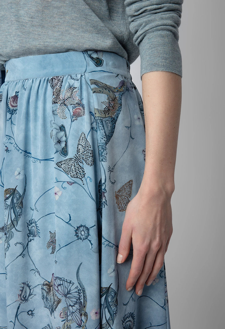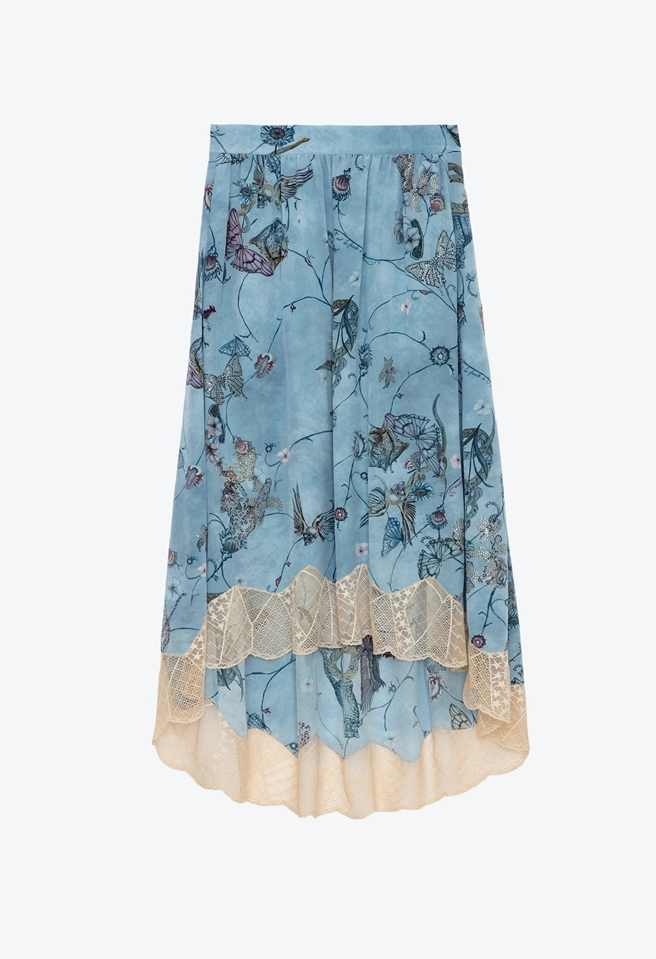 Women’s Glacier blue silk lingerie-style midi skirt in a print designed by Holly Biörklund, British artist and muralist who creates surrealist landscapes very much inspired by nature, animals and poetry.