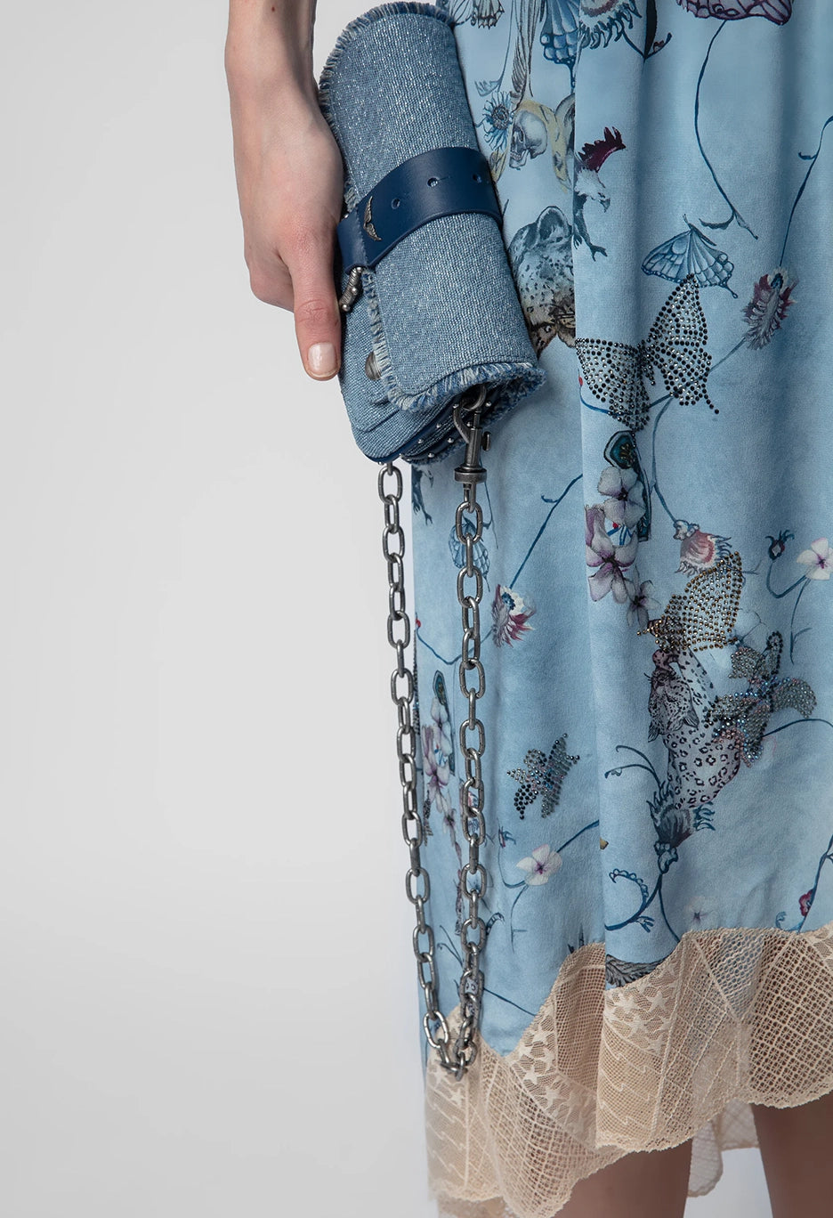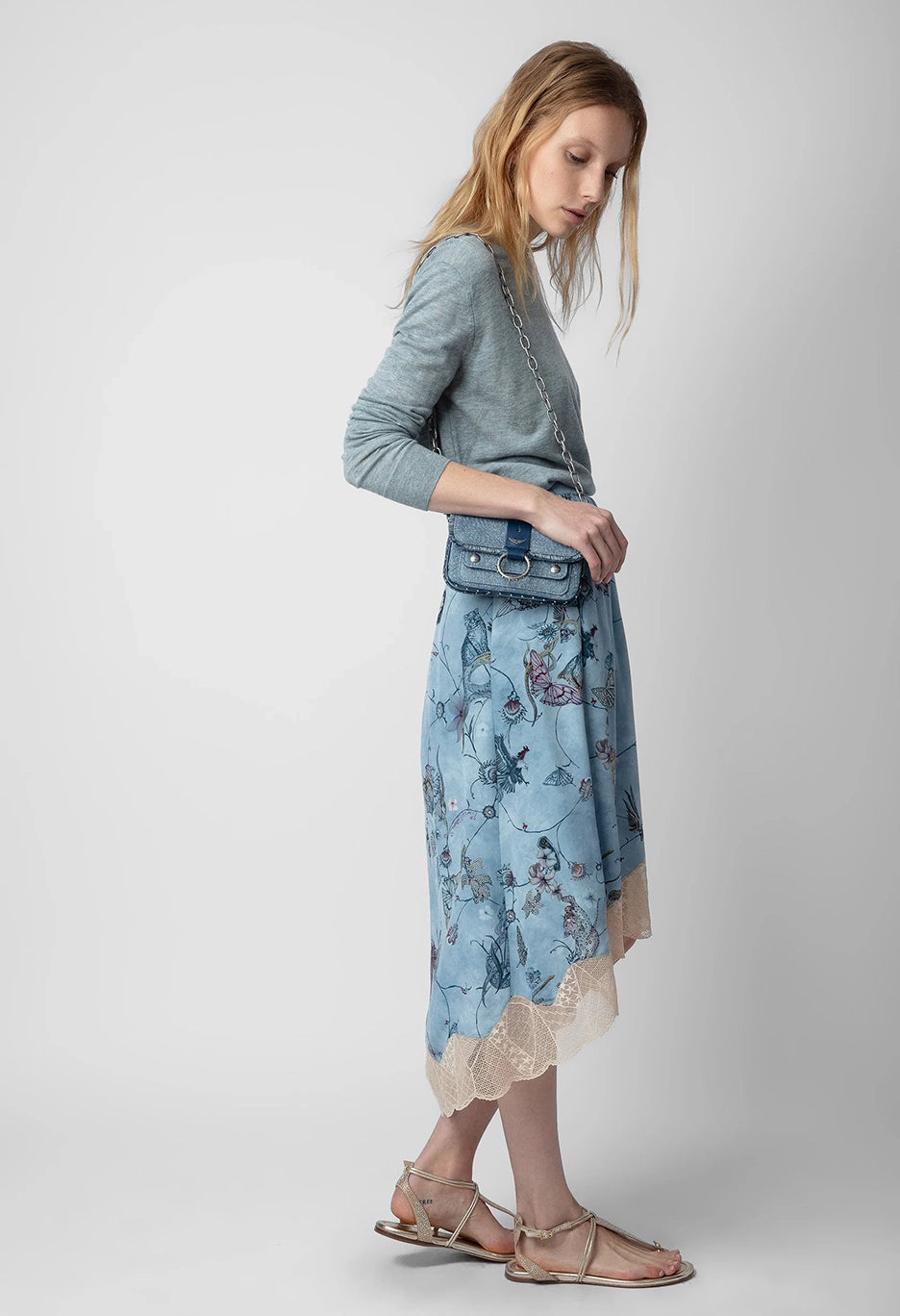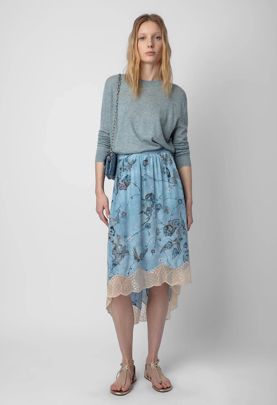 Women’s Glacier blue silk lingerie-style midi skirt in a print designed by Holly Biörklund, British artist and muralist who creates surrealist landscapes very much inspired by nature, animals and poetry.