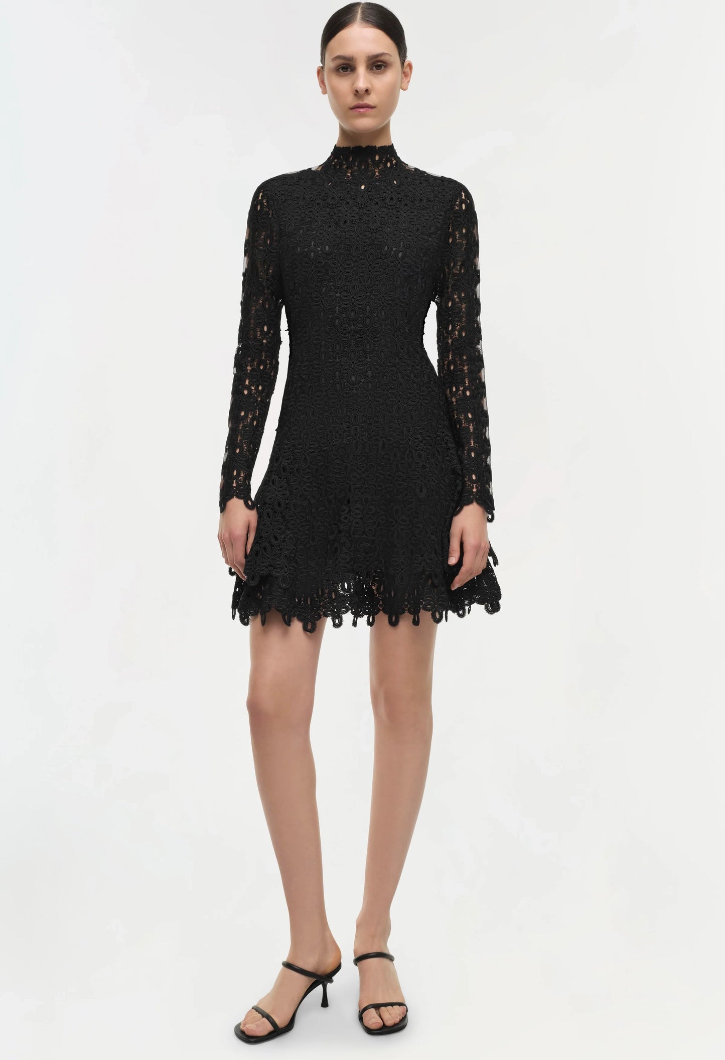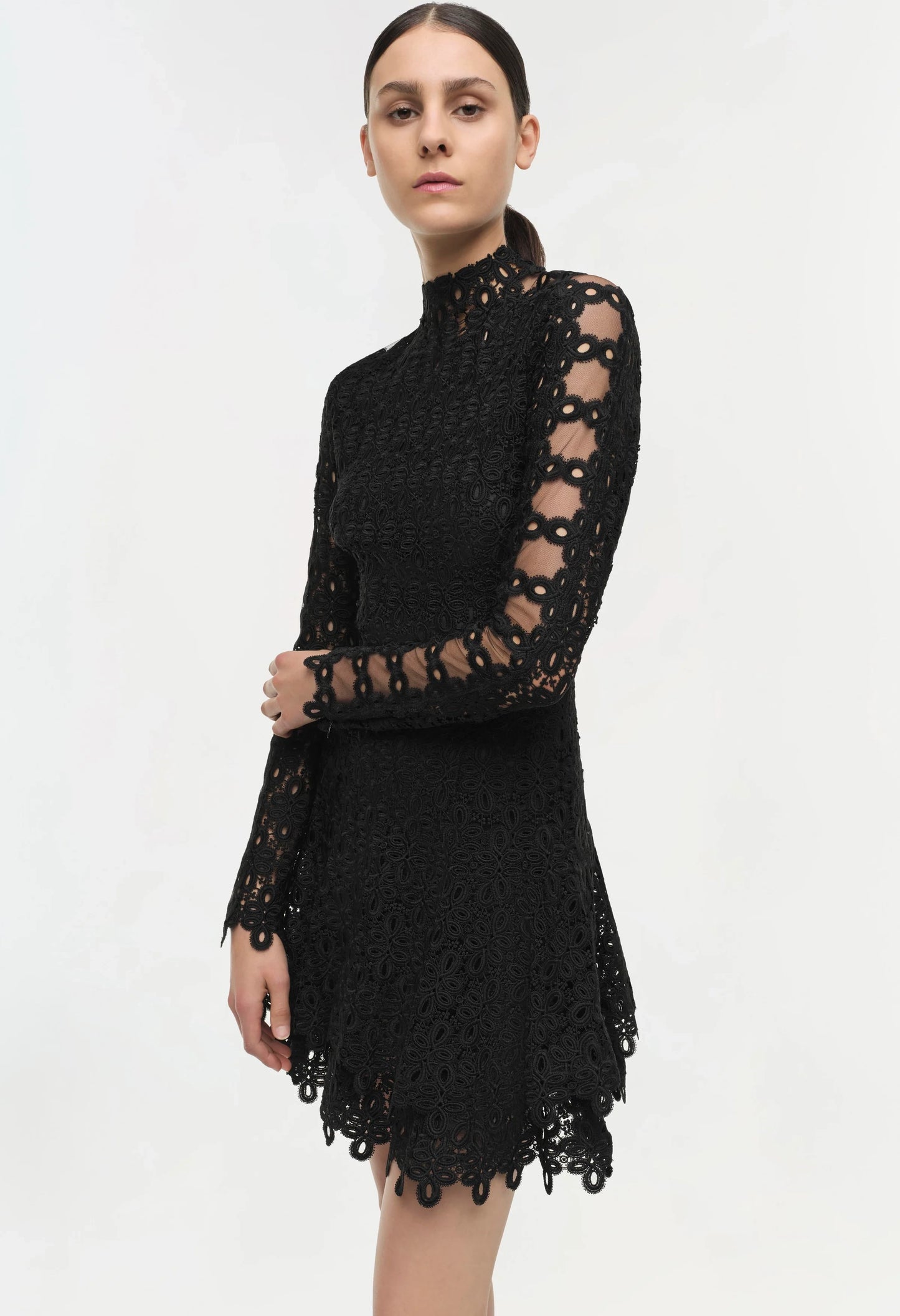 Experience the luxurious feel of our elevated guipure lace with this stunning A-line dress, featuring sheer long sleeves, a flirty miniature hemline layered in white lace, and a rounded high-collar neckline. This dress is a signature piece from SIMKHAI and is adored by many for its elegant and flattering fit.