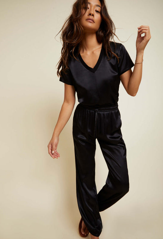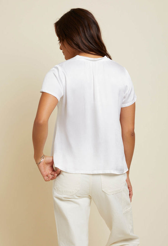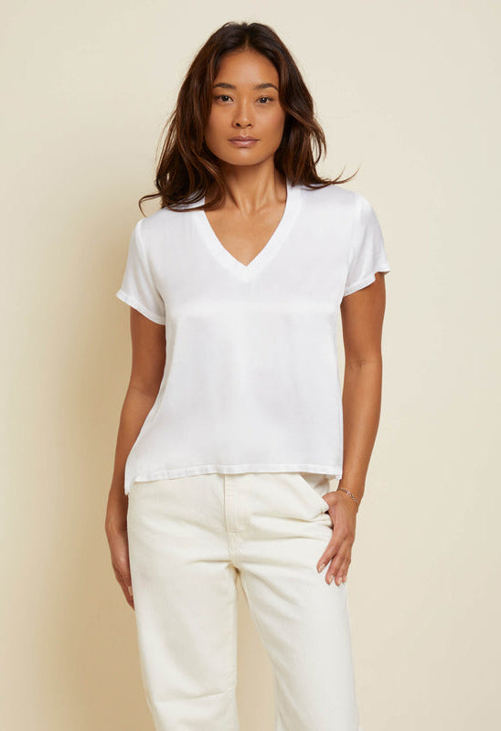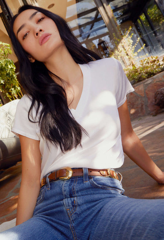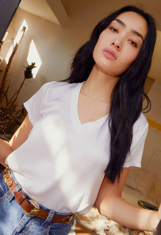 The V neck version of your favorite white tee with a laid-back ribbed neckband. Sexy, effortless, and already a classic.