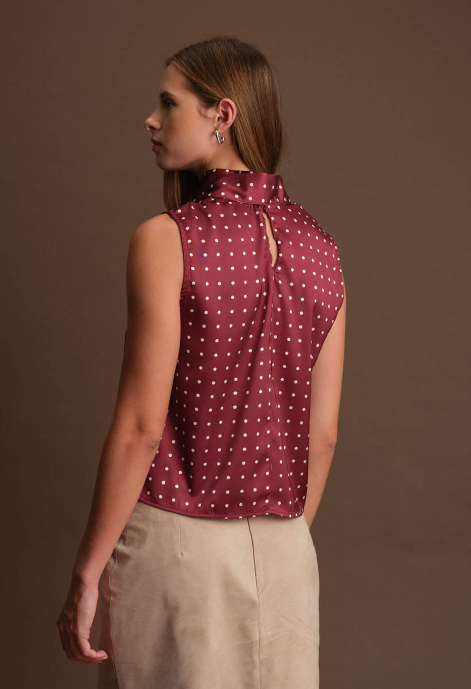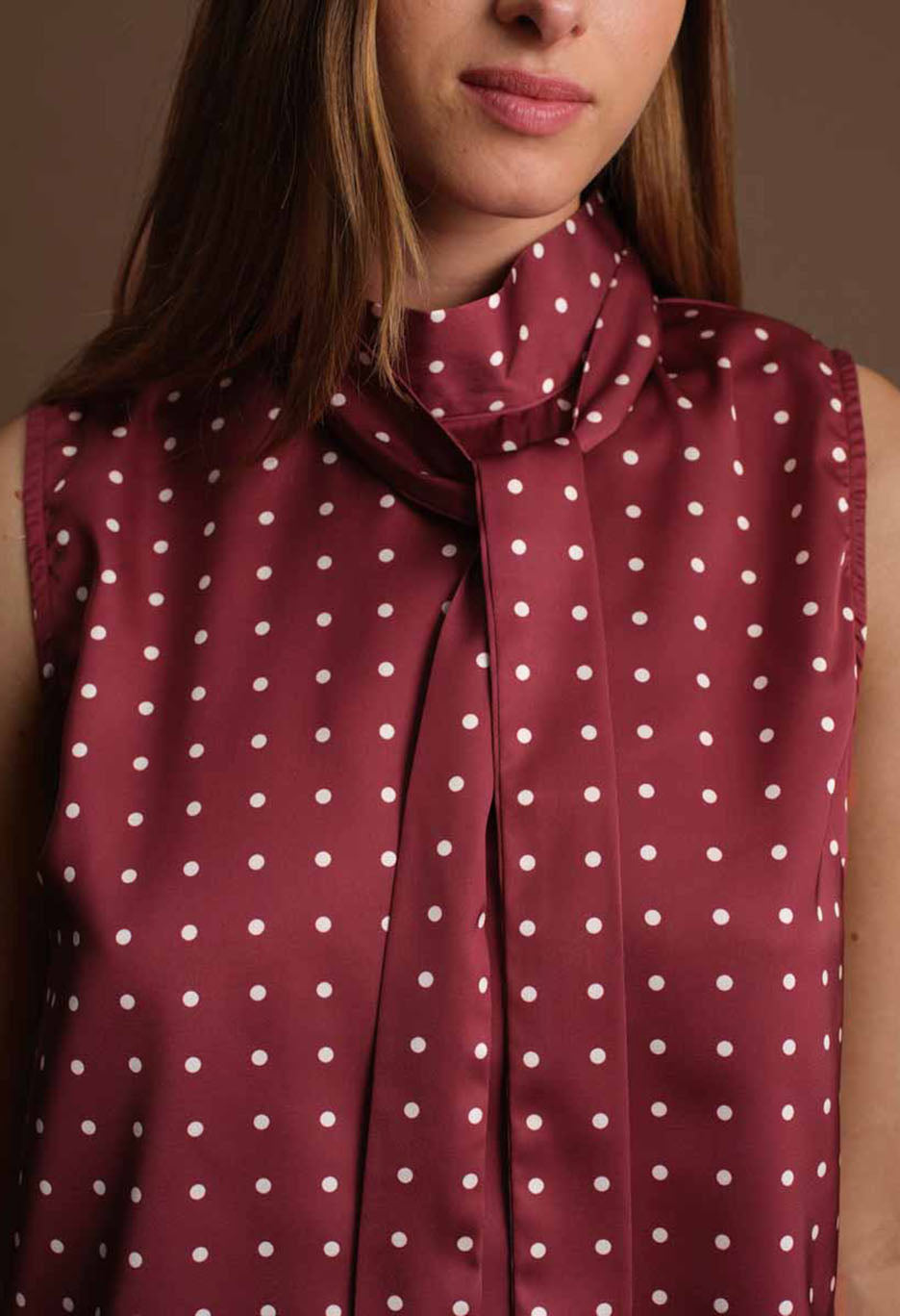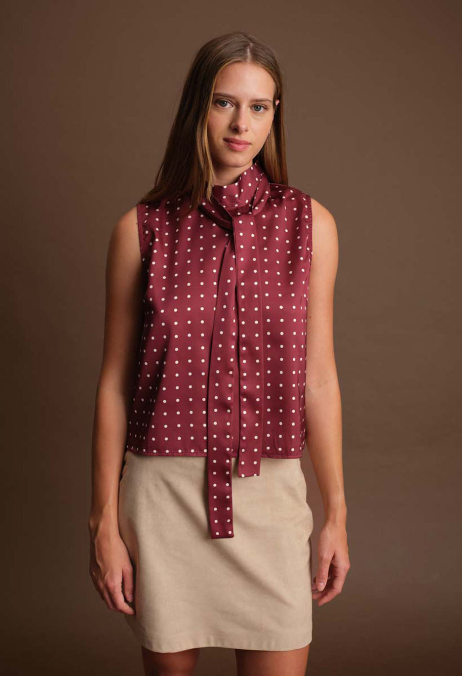 This silky sleeveless top features a sophisticated tie neck and a classic polka dot print, combining elegance with timeless style. Its lightweight fabric ensures comfort and a smooth drape, making it ideal for both professional settings and refined casual wear. The Justin Top offers a polished look that effortlessly elevates any outfit.