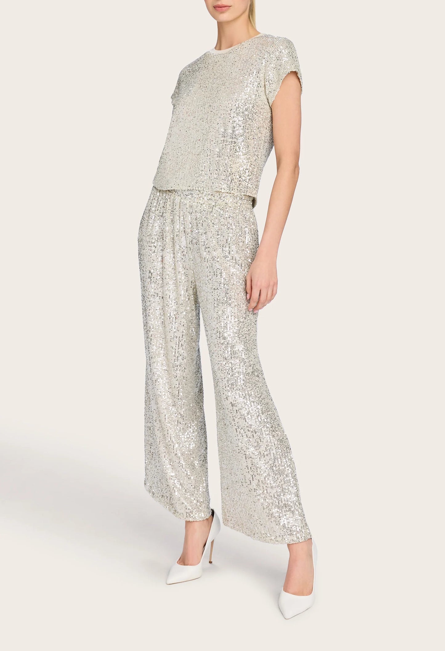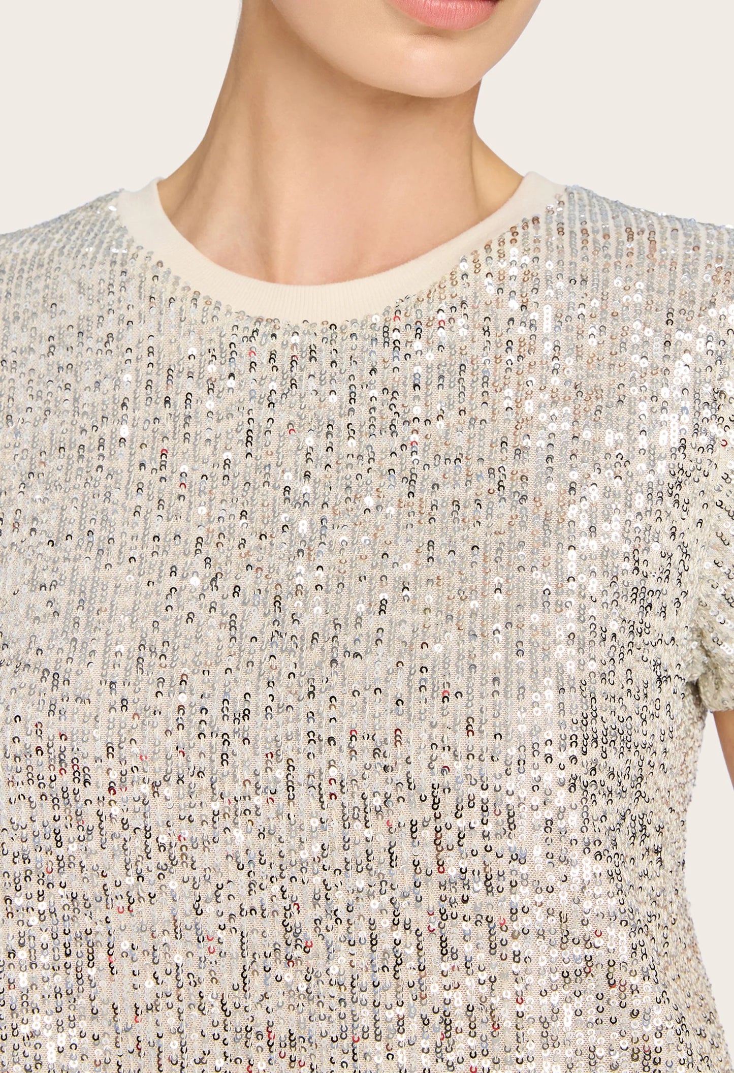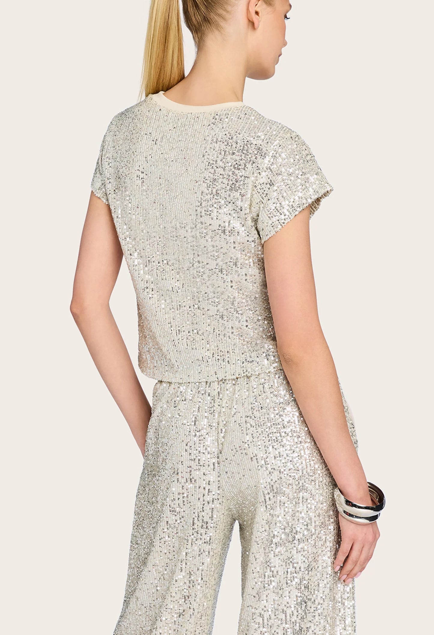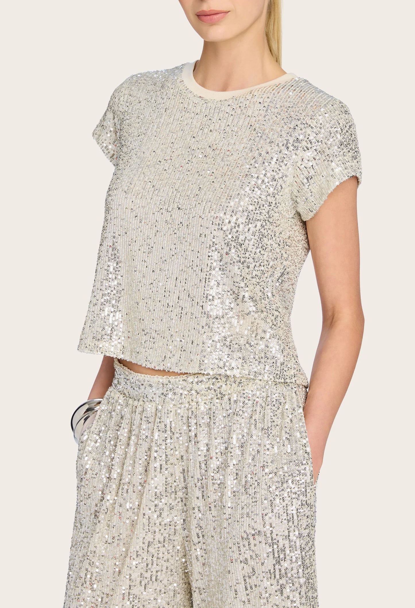 This short-sleeve top showcases a timeless crewneck design adorned with flexible sequins throughout and is fully lined for comfort. It offers a glamorous look that can be styled with matching sequin pants for a striking outfit or dressed down with jeans for a refined casual appearance.