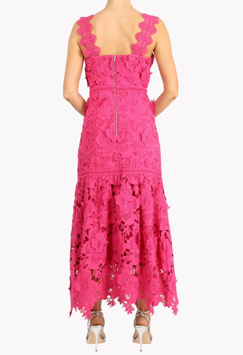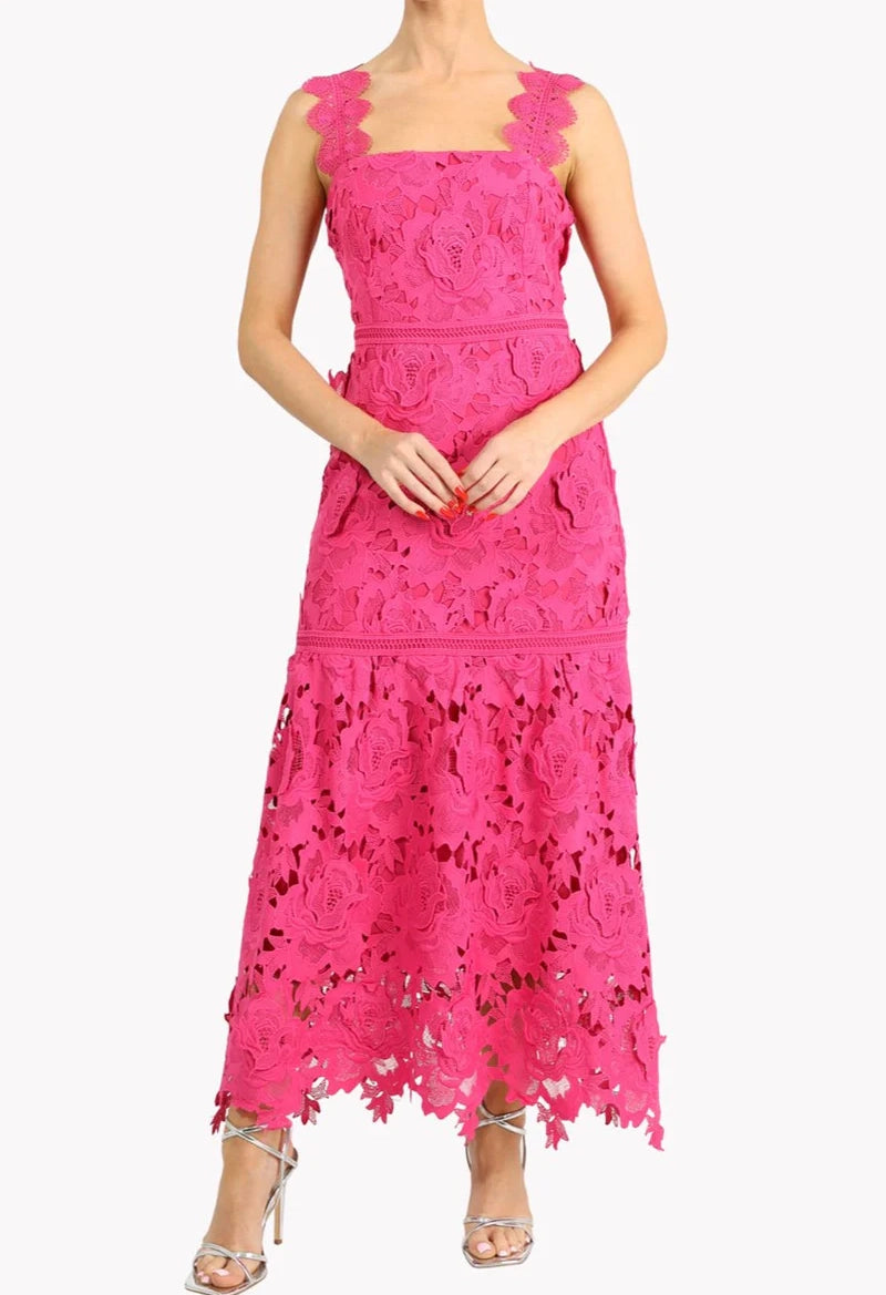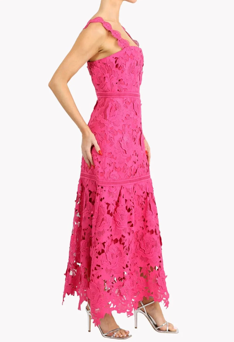 Lace midi dress rendered in a pretty pink. The silhuoette showcases scalloped straps, a dropped waist, and a raw hemline. Thick material, little stretch.