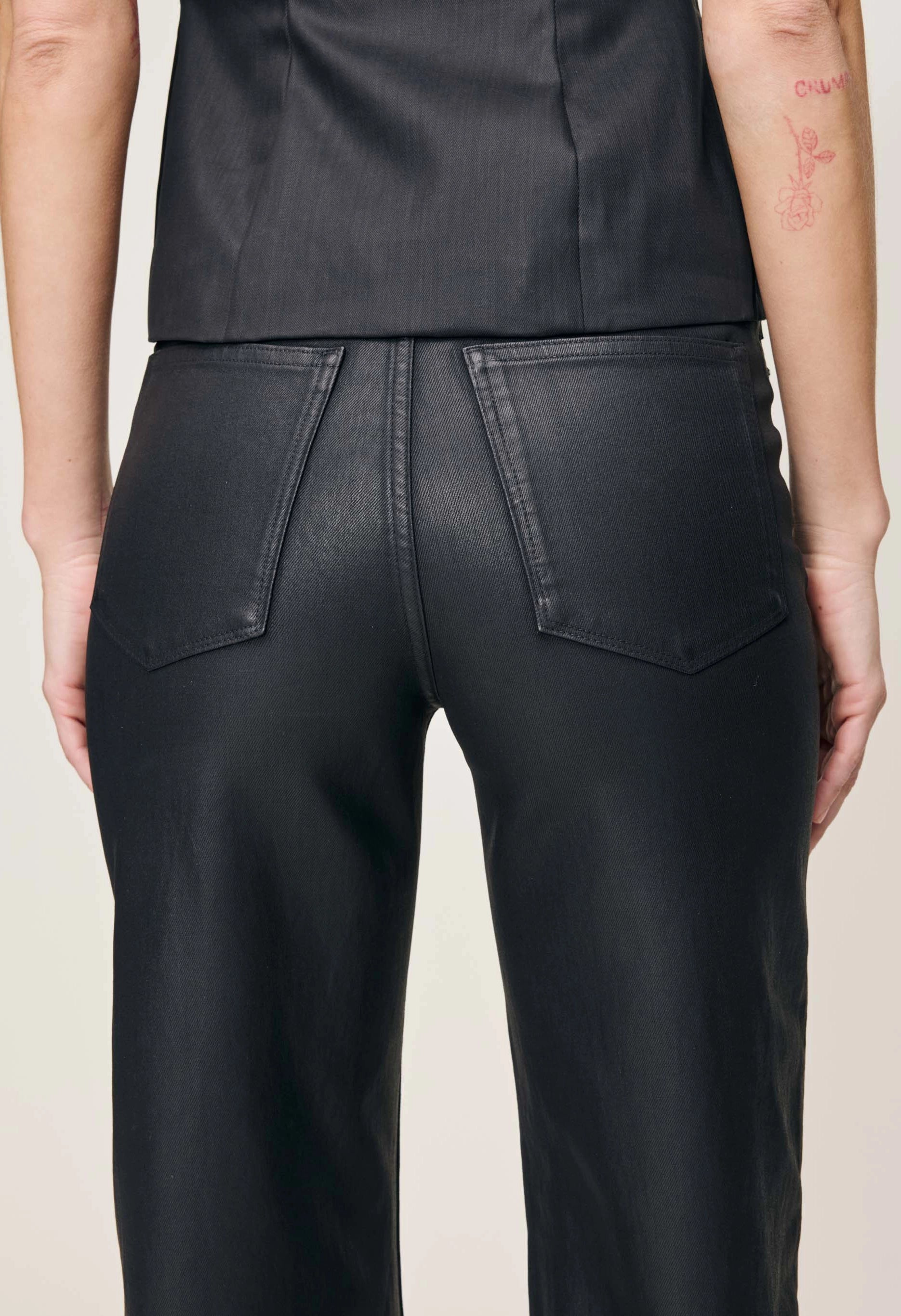 The Karmine Refined Wide Leg offers a high-rise design paired with a 31-inch inseam, delivering a comfortable and relaxed fit. Crafted from Black Coated true black denim, it features a distinctive wax coating that gives a sleek, leather-like appearance. Details such as black oxide hardware, tonal stitching, a clean hem, and a subtle black back patch enhance its refined and modern aesthetic. This style combines sophistication with ease, making it a versatile addition to your wardrobe.