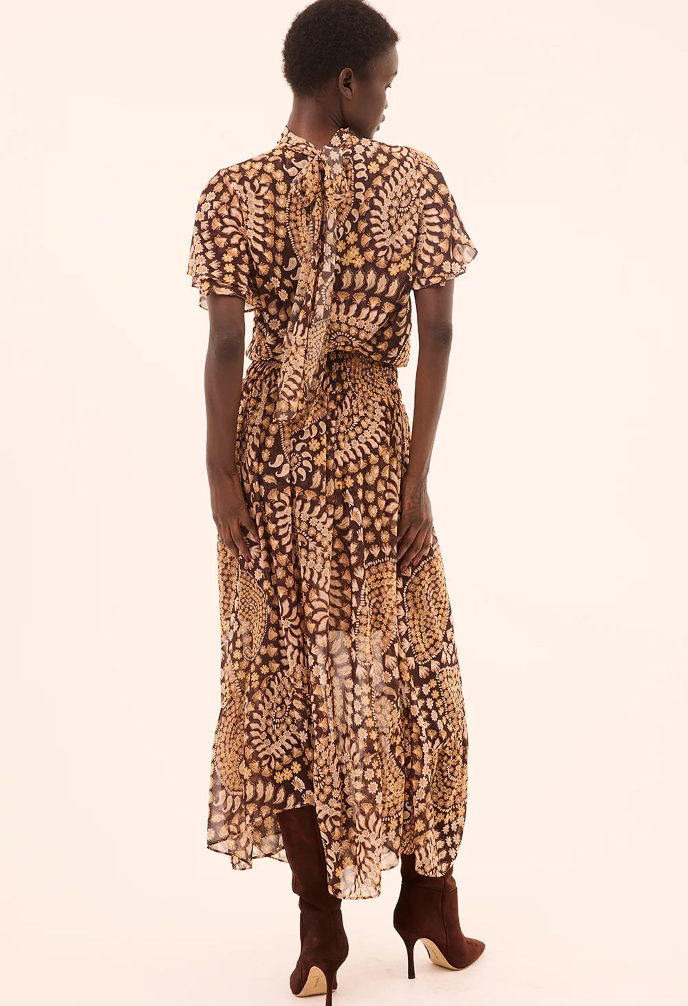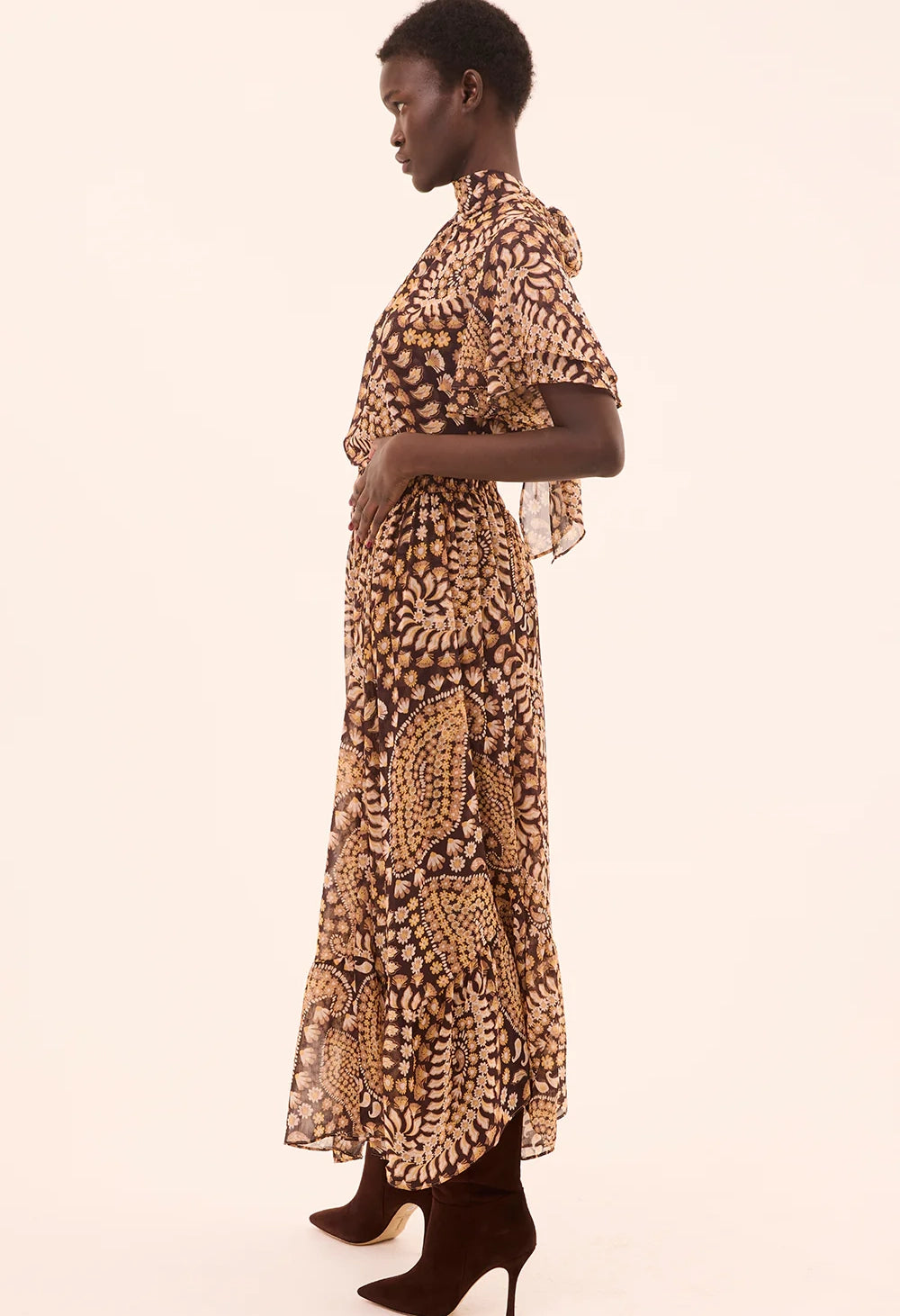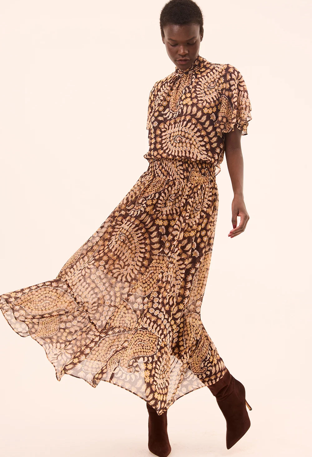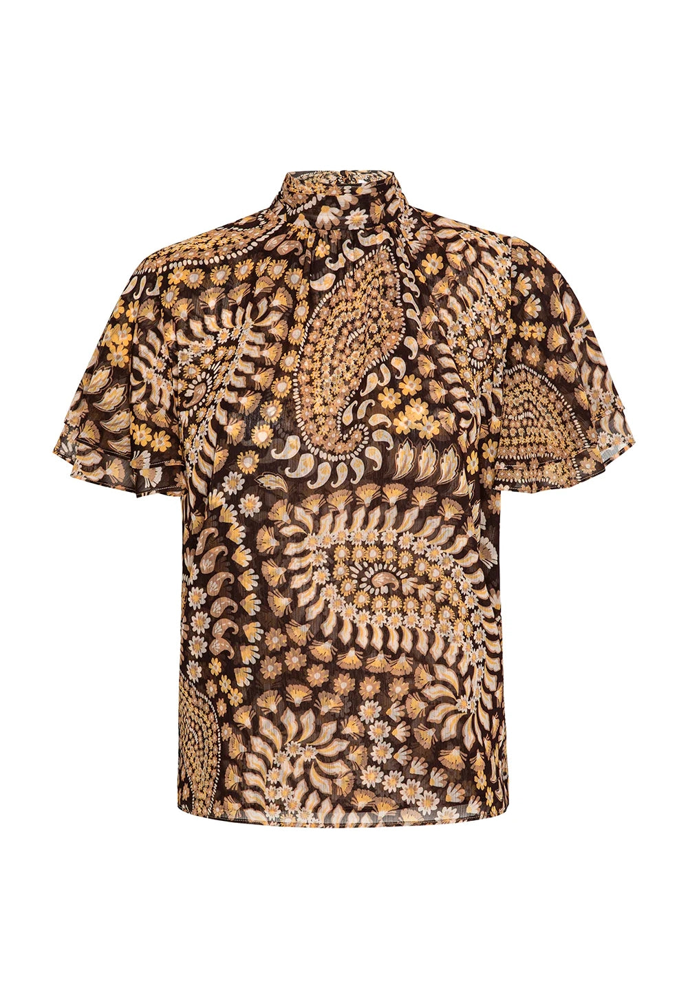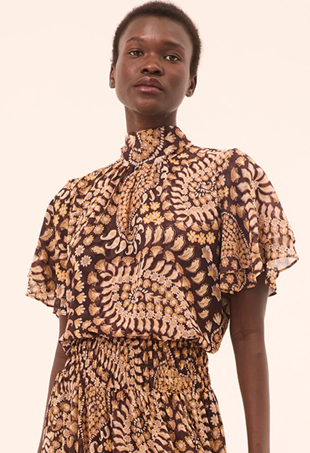 Kaye is an effortless high-neck top cut from our fall-ready Daisy Paisley chiffon. Designed with short double ruffled sleeves and a chic tie-back detail at the neck, it’s double lined for a smooth, flattering fit. Pair with the coordinating Agyness skirt for a head-to-toe look or dress it down with jeans.