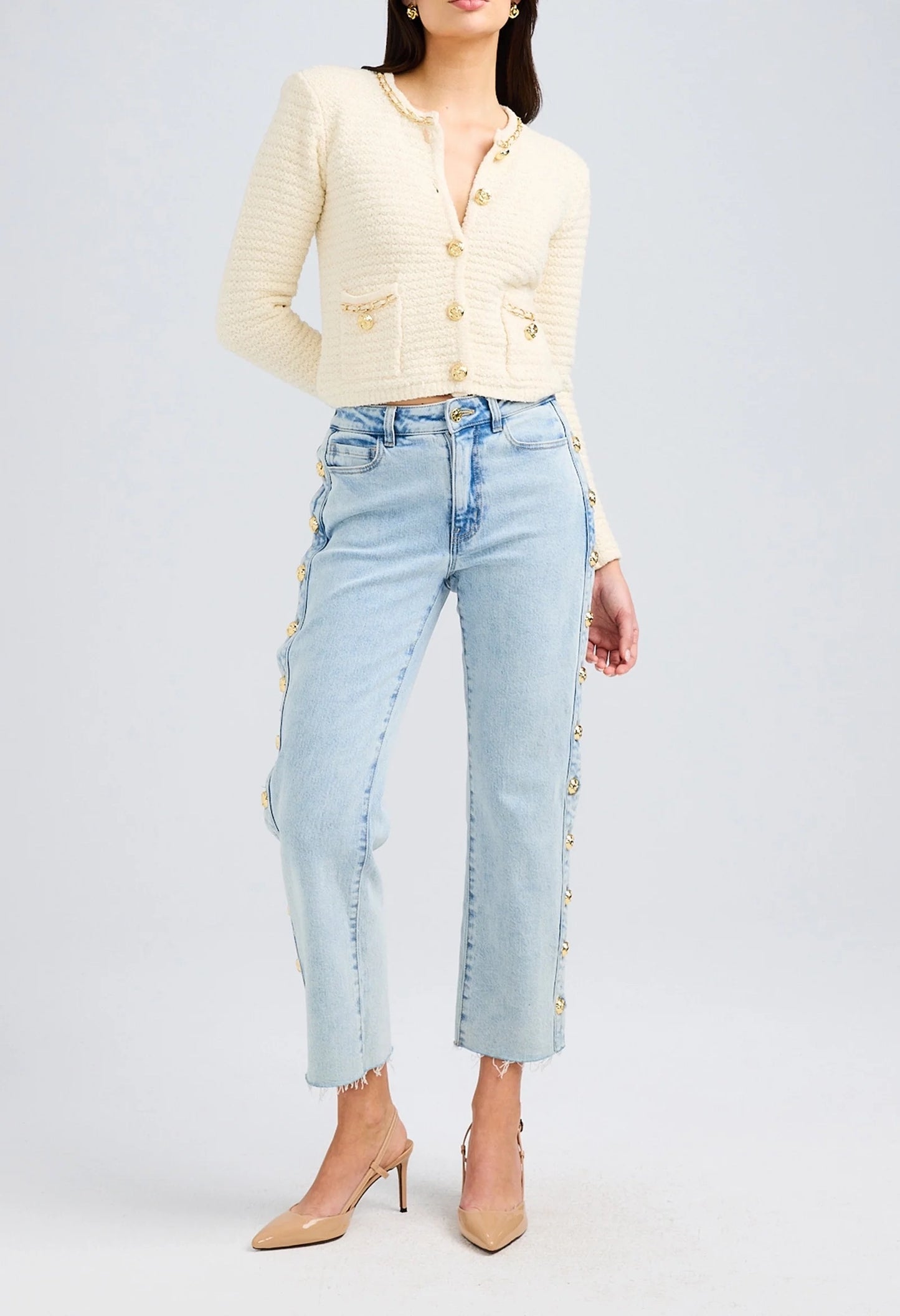 This chic crewneck cardigan features boucle yarn with edgy chain details and gold ripple buttons, creating a rich texture. It's the perfect addition to your spring wardrobe and effortlessly complements tailored pants or skirts.
