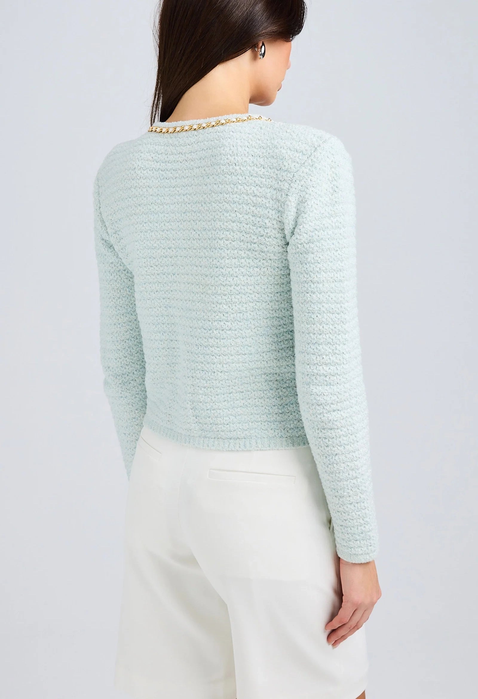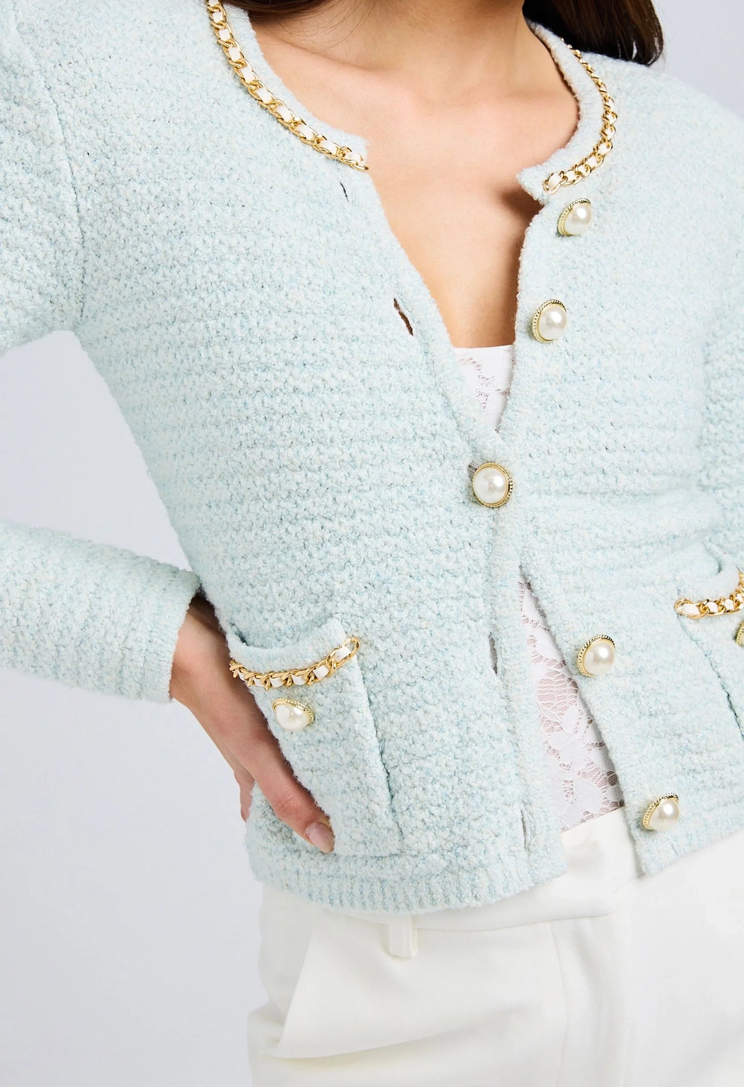 The rich texture of boucle yarn is accented by edgy chain details and refined pearl rim buttons in this chic crewneck cardigan. A perfect spring layer, it effortlessly complements tailored pants or skirts.