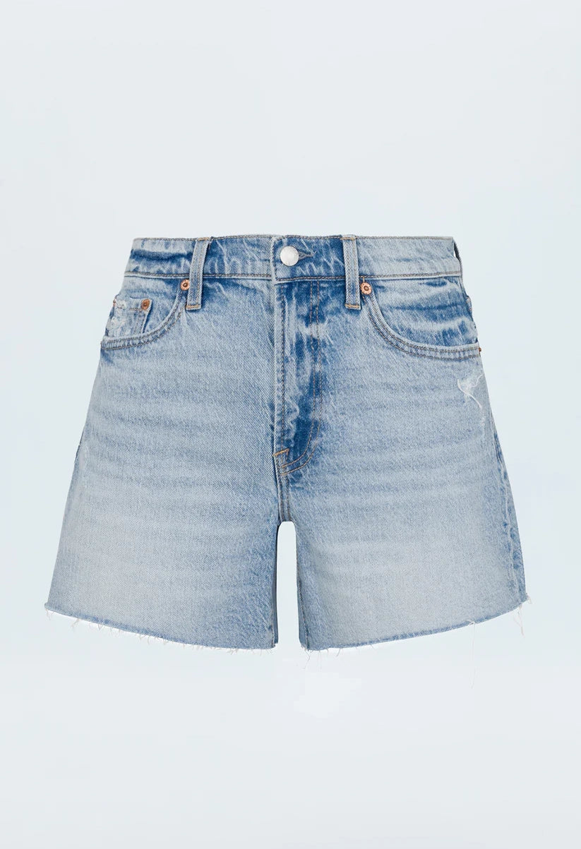 The Kennedy Relaxed Mid Rise Shirt offers a real crowd-pleasing style with a medium length and a relaxed fit. Crafted from our signature comfort stretch denim, it features a Normandy Vintage wash with blasted fading, whiskering, and a raw scissor cut hem.