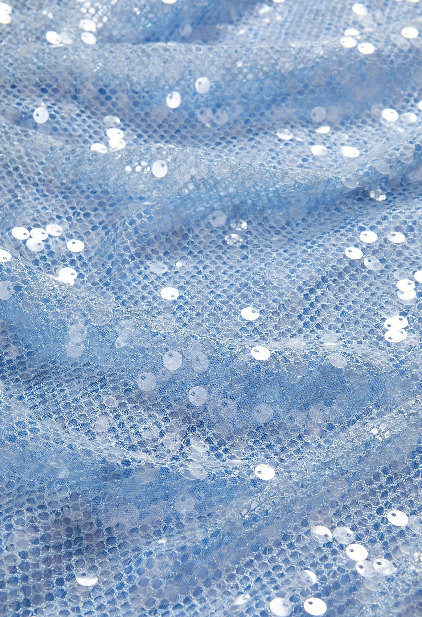 This sleek midi dress combines timeless elegance with eye-catching detail. Shimmering clear sequins are meticulously placed across a delicate crochet mesh base, creating an understated yet striking effect in a cool icy blue tone. The fitted silhouette skims the body while strategic ruching at the waist provides flattering definition. Crafted with subtle stretch for all-day comfort, the sleeveless design and jewel neckline offer refined sophistication. Style with nude heels for an effortlessly polished evening ensemble.