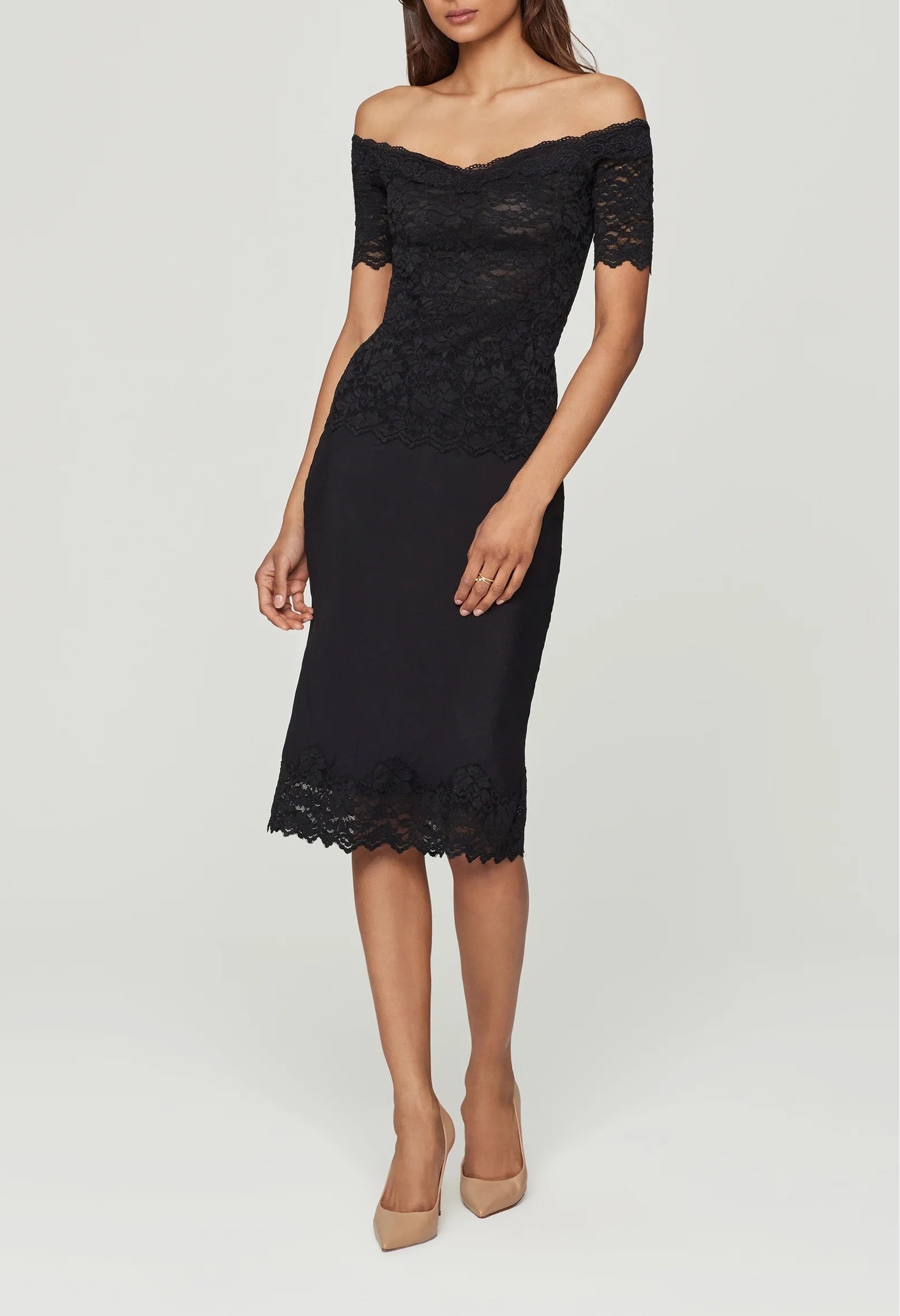 The Kovi Lace Off Shoulder Top in Black features a fitted, body-skimming silhouette that highlights the neckline with an elegant off-the-shoulder cut. Crafted from delicate floral lace with subtle stretch, this style offers a refined balance of structure and softness. Style it with high-rise denim for effortless contrast or pair it with a tailored skirt for a sleek evening look.