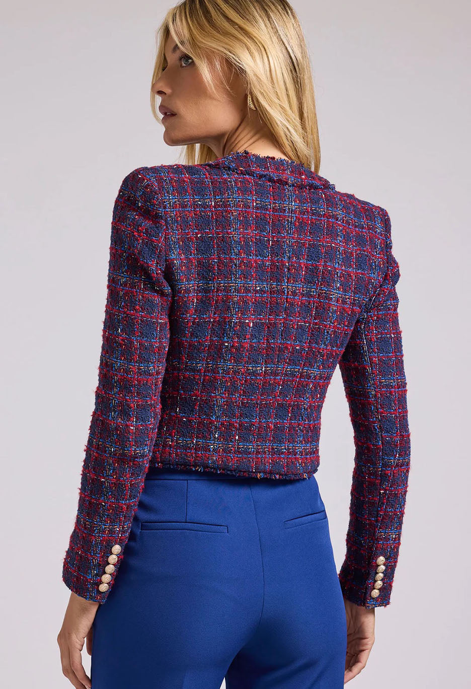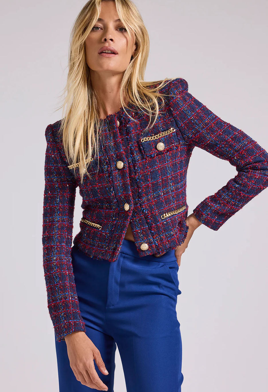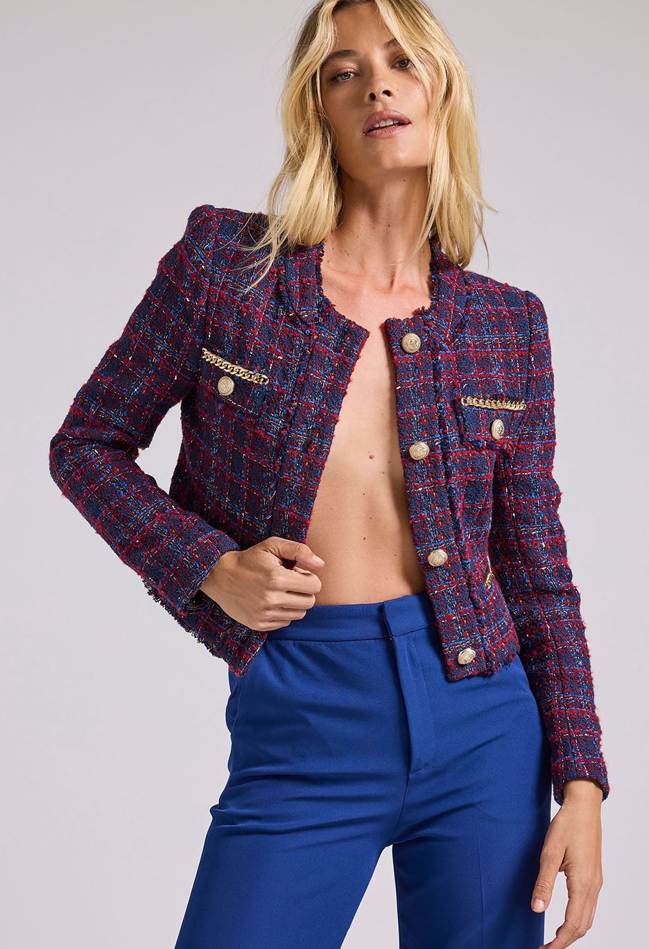Timeless style gets some edge with the Kristen blazer. Our signature tweed is contrasted by frayed edges and chain trim mixed with vegan leather. The perfect mix of modern and classic for those with preppy taste. Generation Love’s tweed is crafted with recycled fabric.