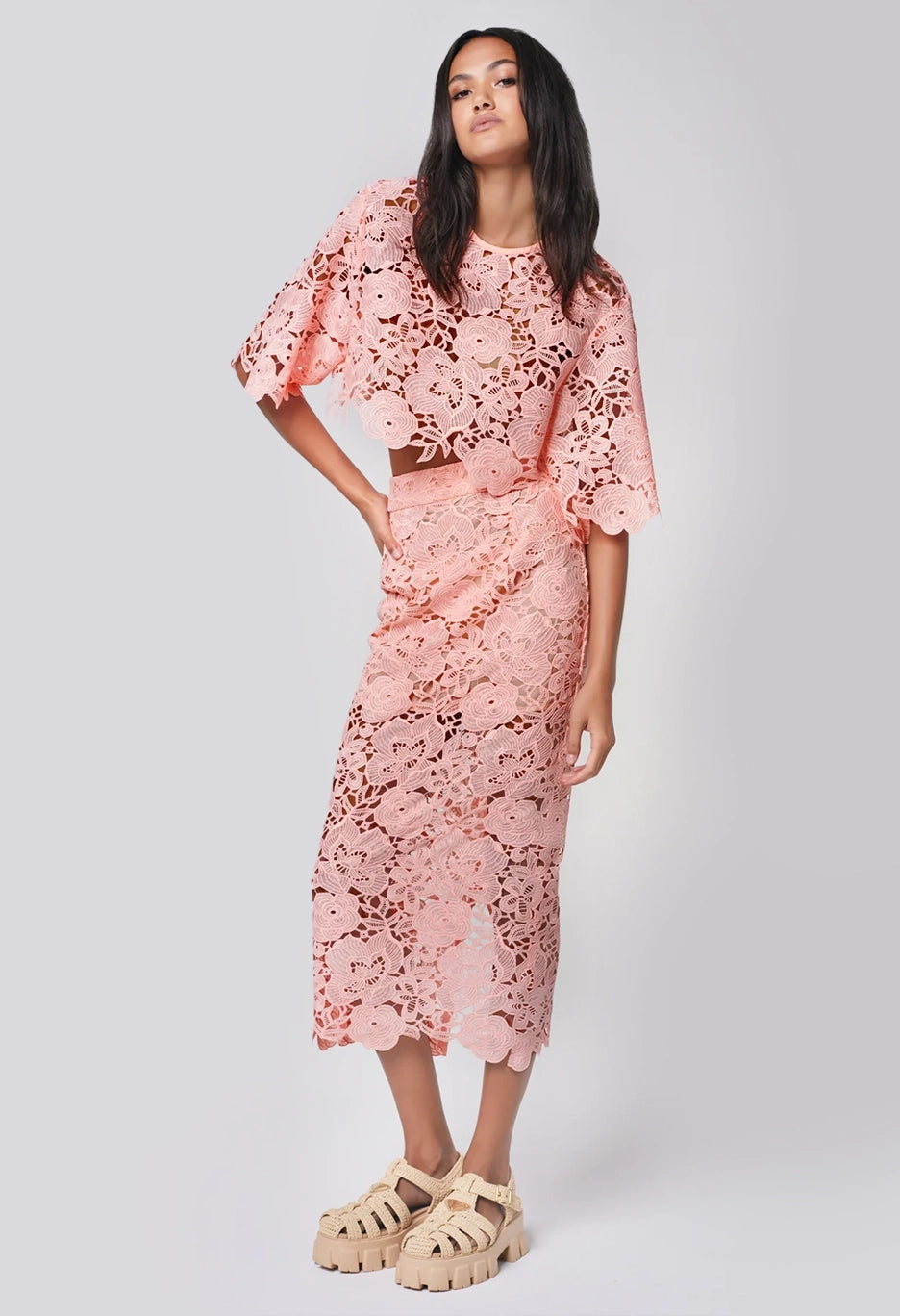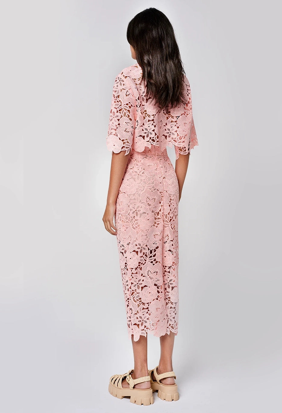 Mid-rise, this guipure midi-length pencil silhouette is partially lined.